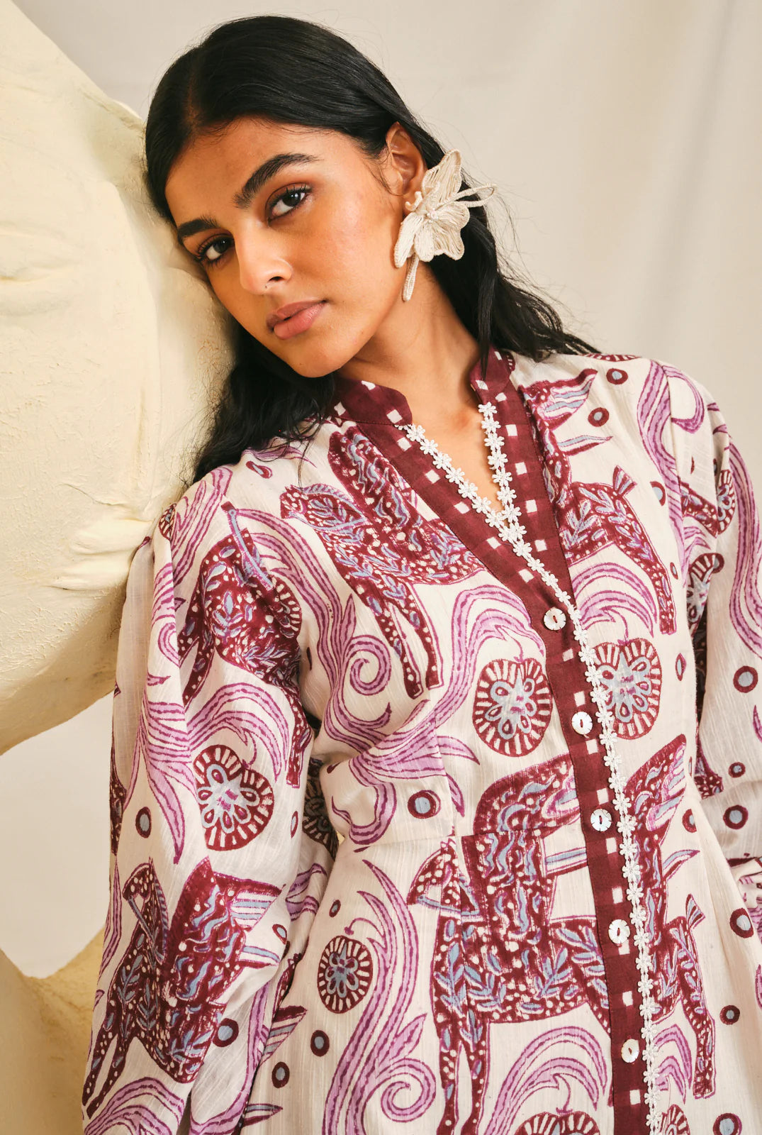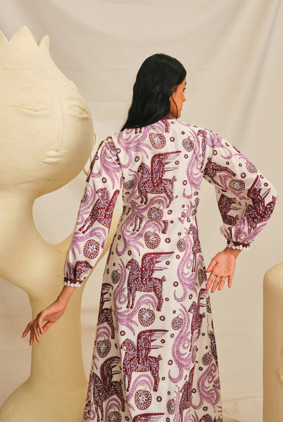 The best thing about midi dresses? They’re not restricted to a single season. This fit-and-flare dress has puffed sleeves and a flattering neckline with a sweet lace detail. Crafted in handwoven cotton in original JODI hand block printed motifs.