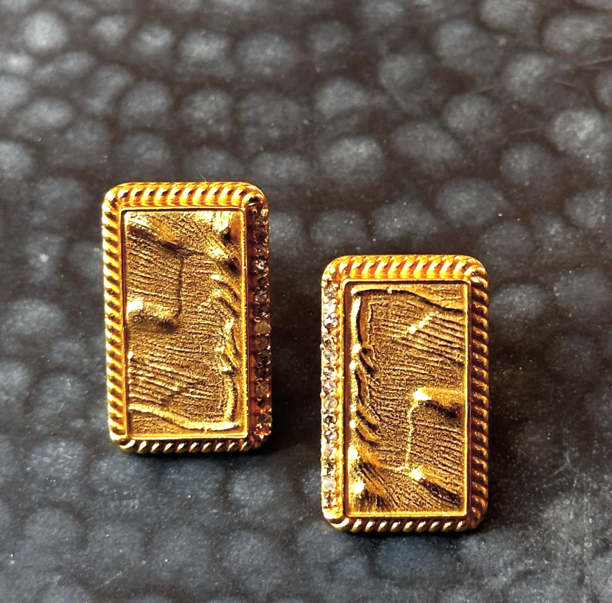 A tribute to the quiet majesty of sunlit sands, Desert Gold captures the texture and rhythm of wind-sculpted dunes frozen in time. These rectangular earrings, cast in rich, matte-finished gold, are framed with intricate borders and flecked with glints of light—like sunlight catching on grains of sand. Bold yet grounded, they echo the ancient elegance of desert landscapes, making them the perfect adornment for those who find beauty in stillness and strength in nature’s grace.