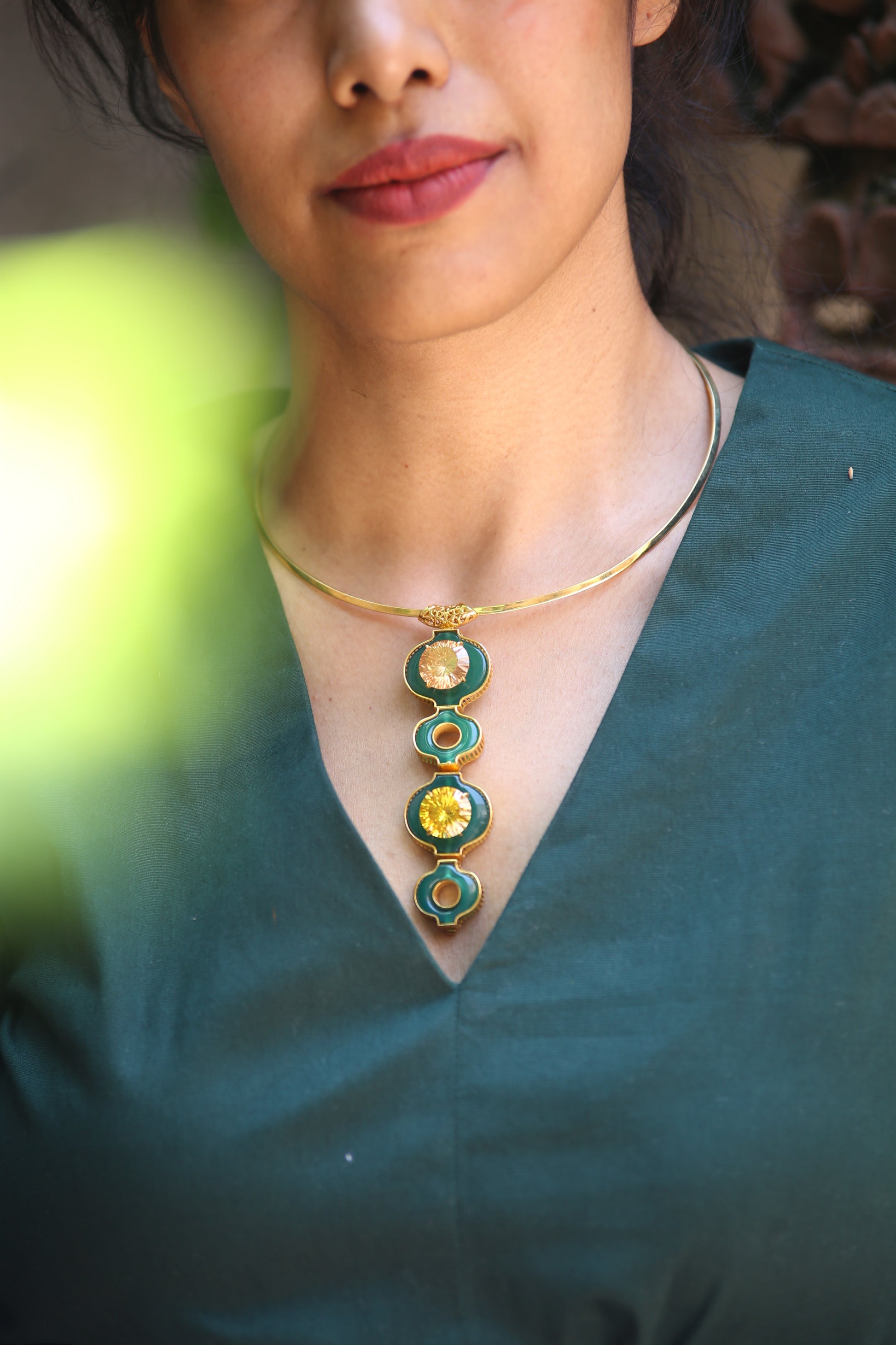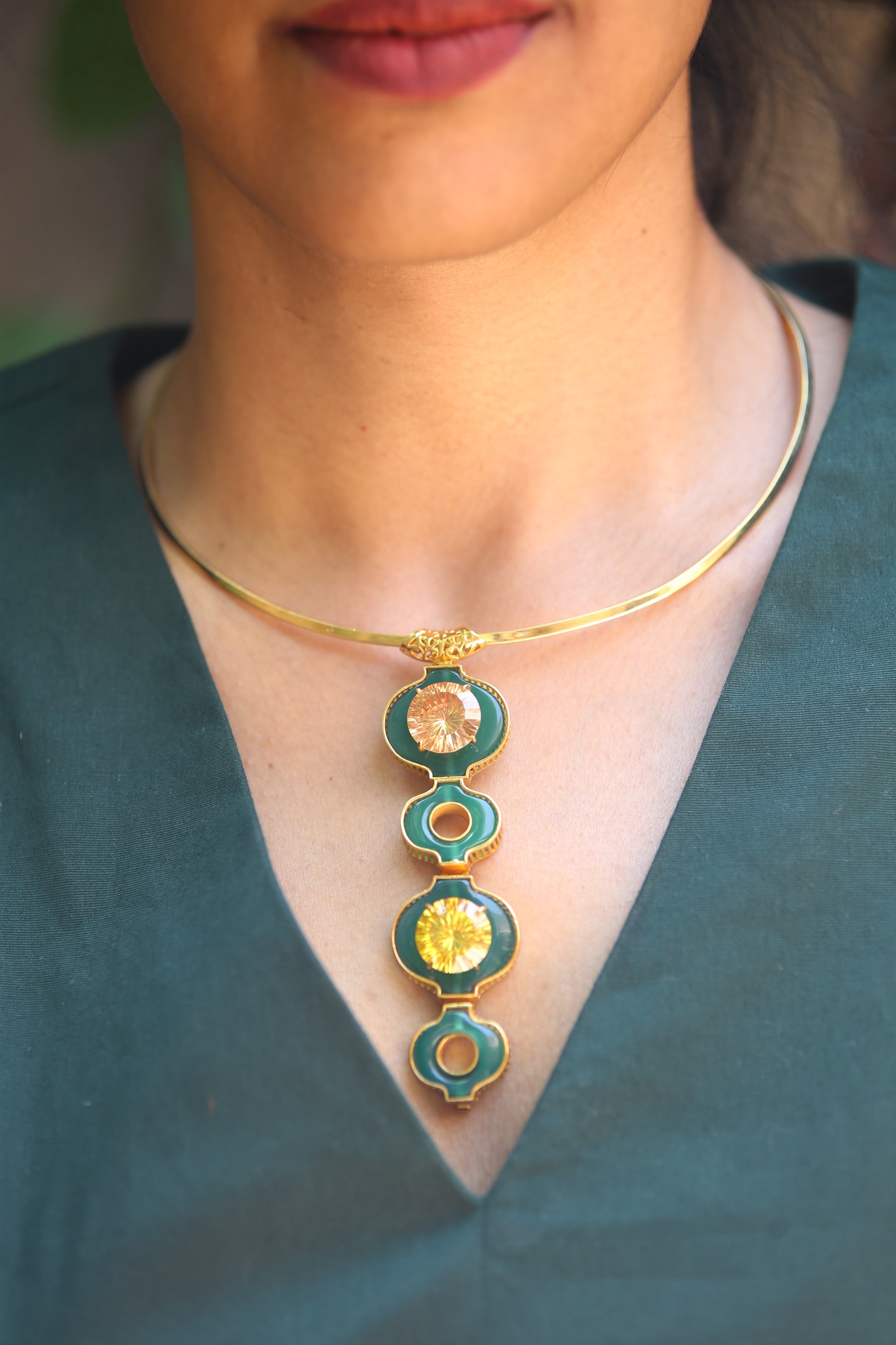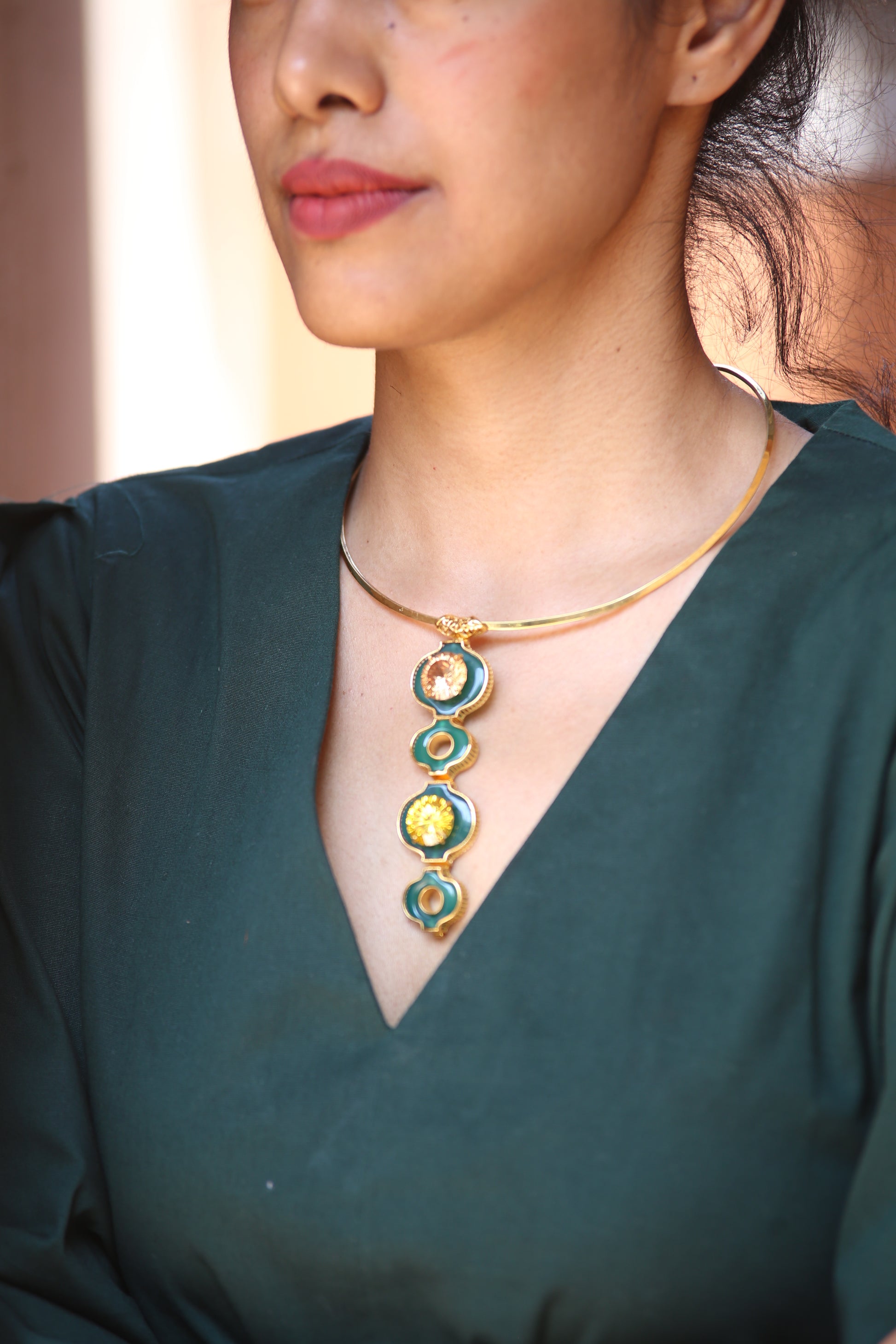 Command attention with this regal neckpiece, where deep green stones gleam with quiet power and gold accents trace a path of elegance down the neckline. Inspired by the poise of queens and the allure of ancient treasures, this design fuses bold symmetry with refined craftsmanship. Whether worn with ceremonial grace or modern confidence, Emerald Empress is your declaration of strength and style.