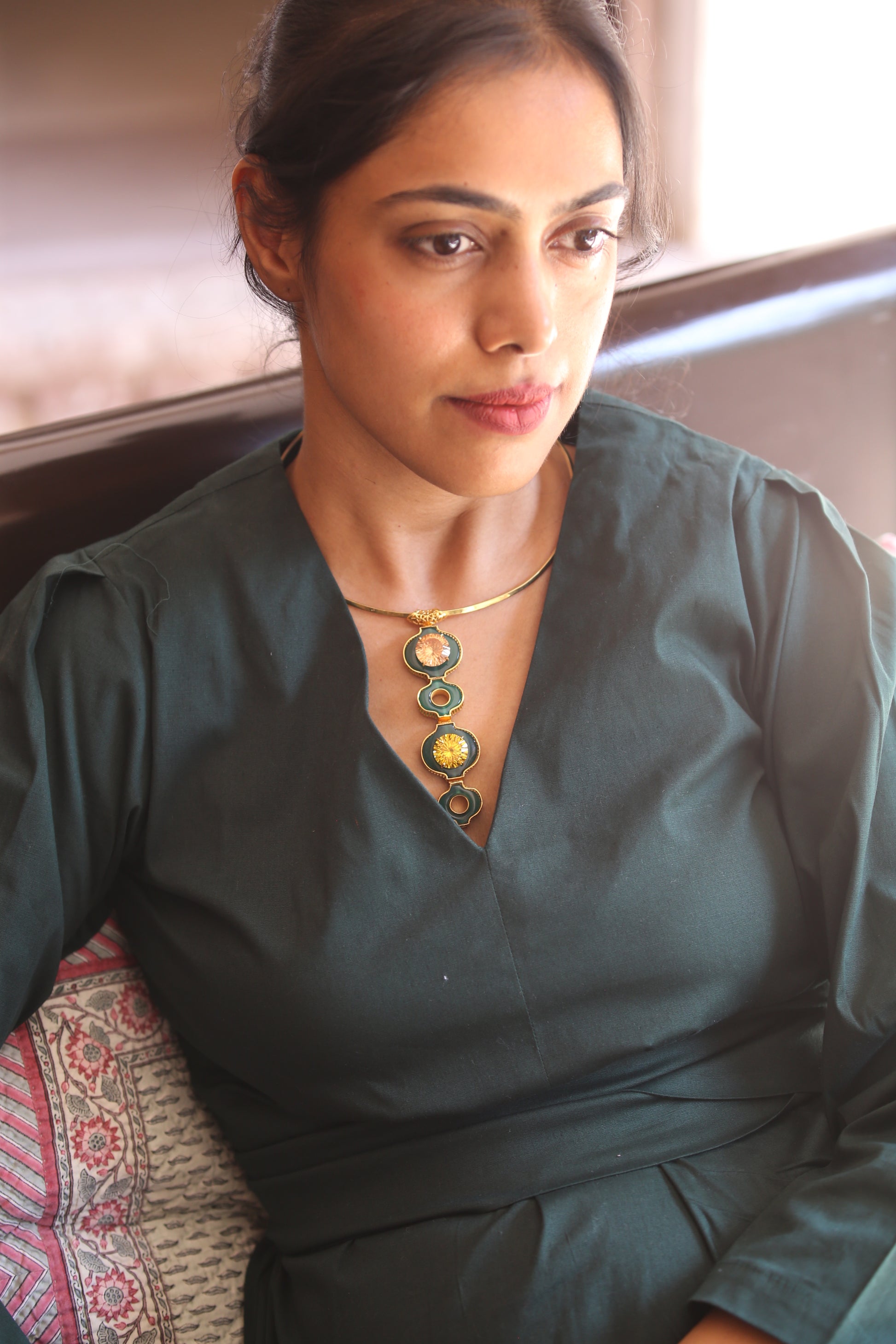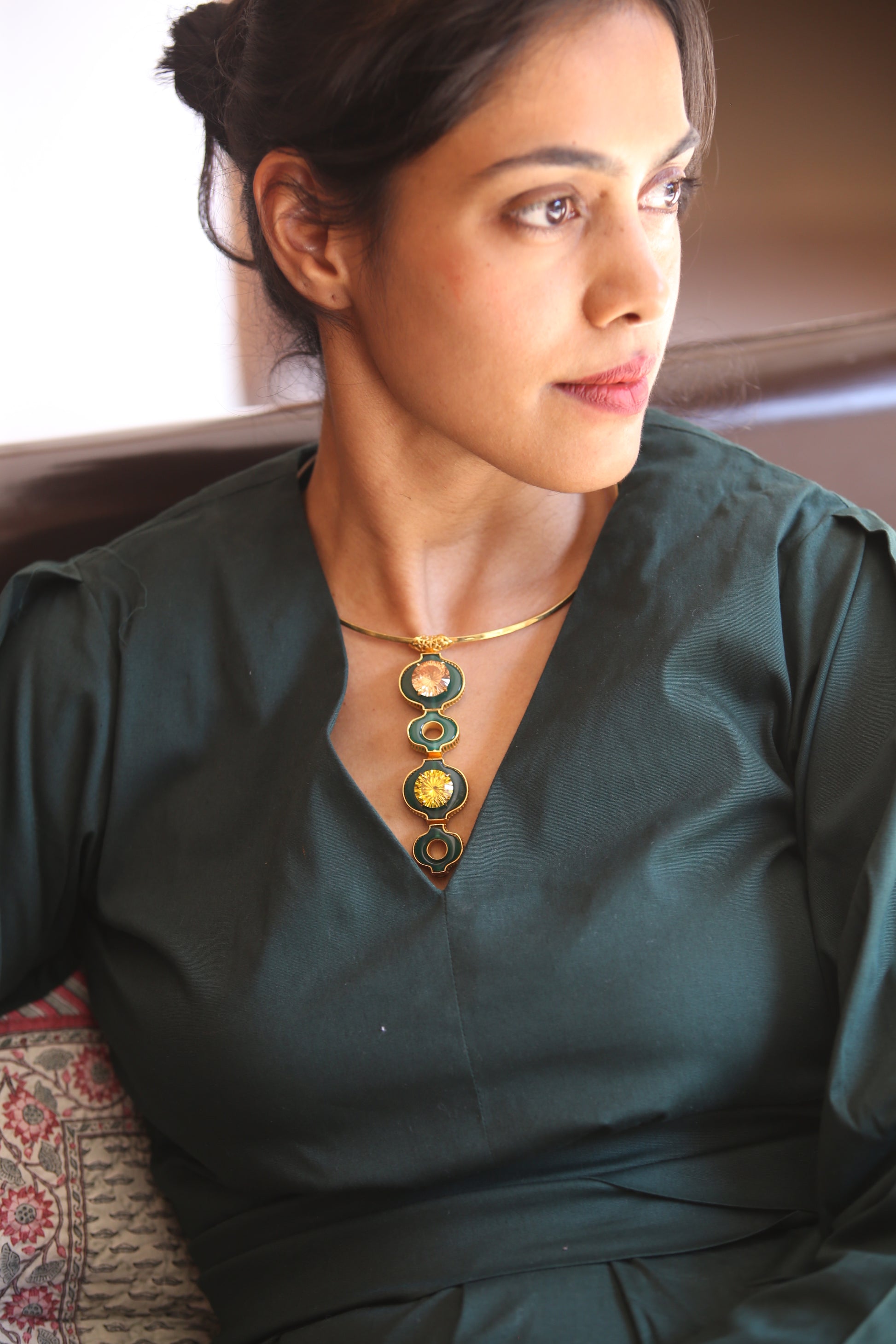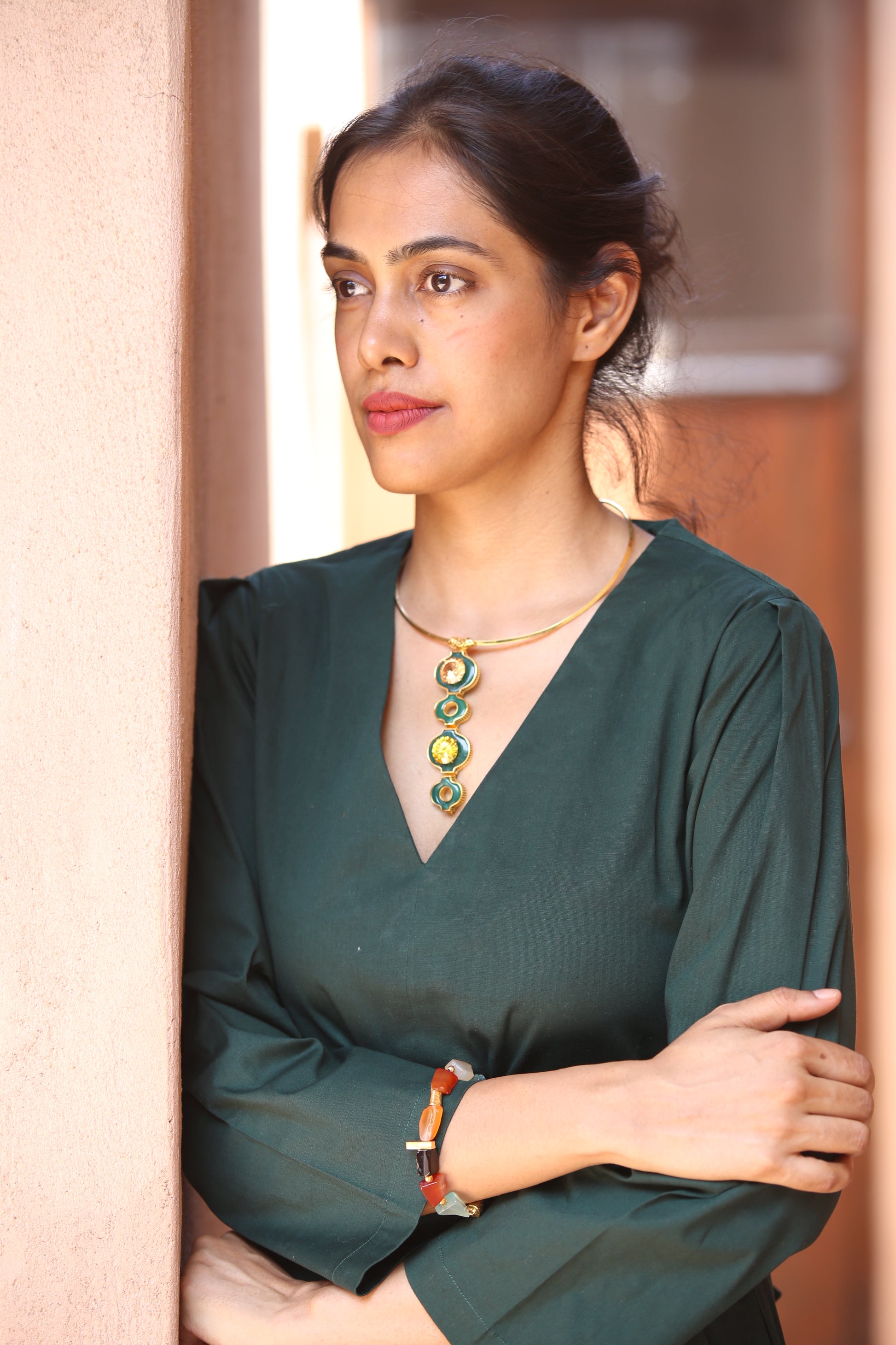 Command attention with this regal neckpiece, where deep green stones gleam with quiet power and gold accents trace a path of elegance down the neckline. Inspired by the poise of queens and the allure of ancient treasures, this design fuses bold symmetry with refined craftsmanship. Whether worn with ceremonial grace or modern confidence, Emerald Empress is your declaration of strength and style.