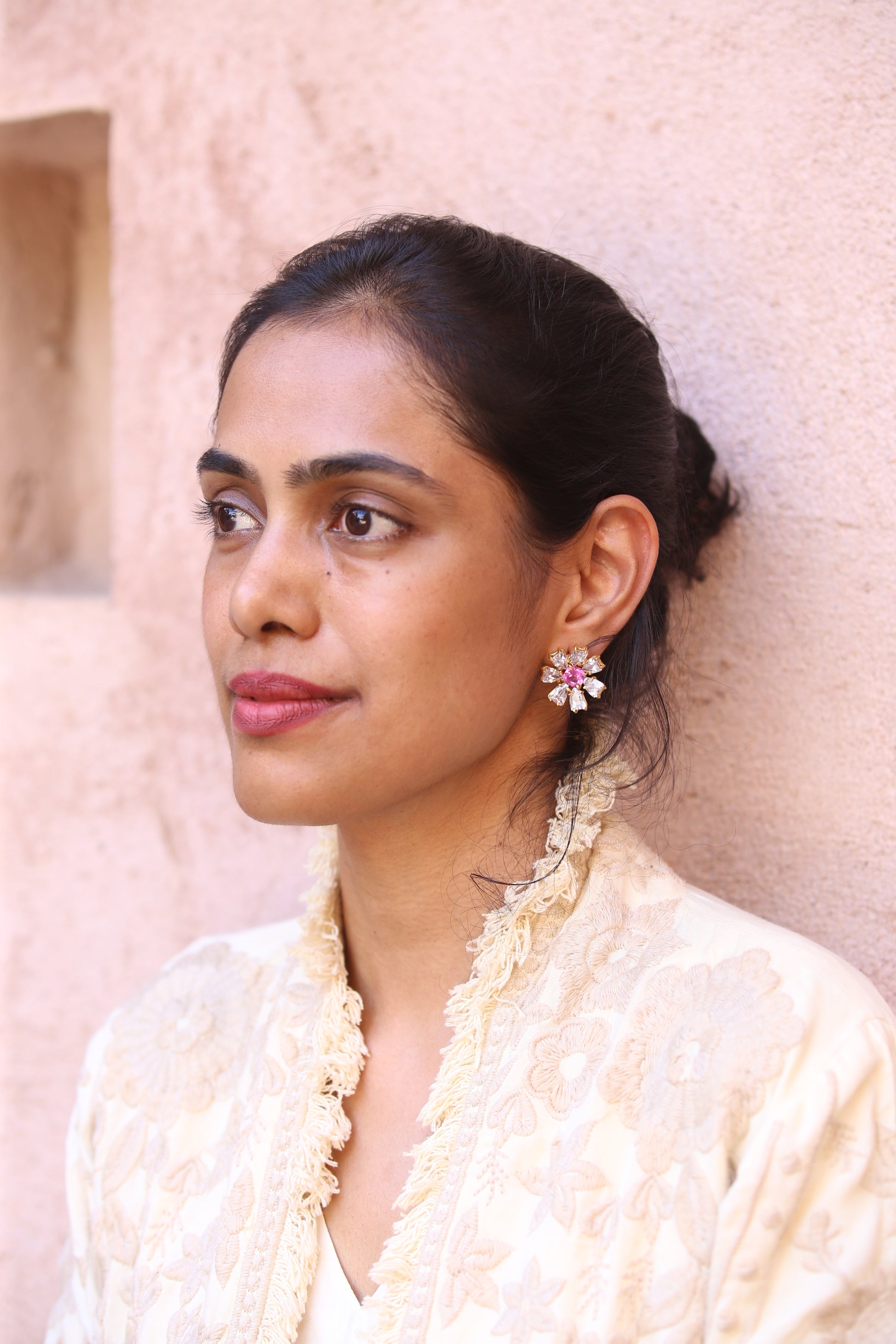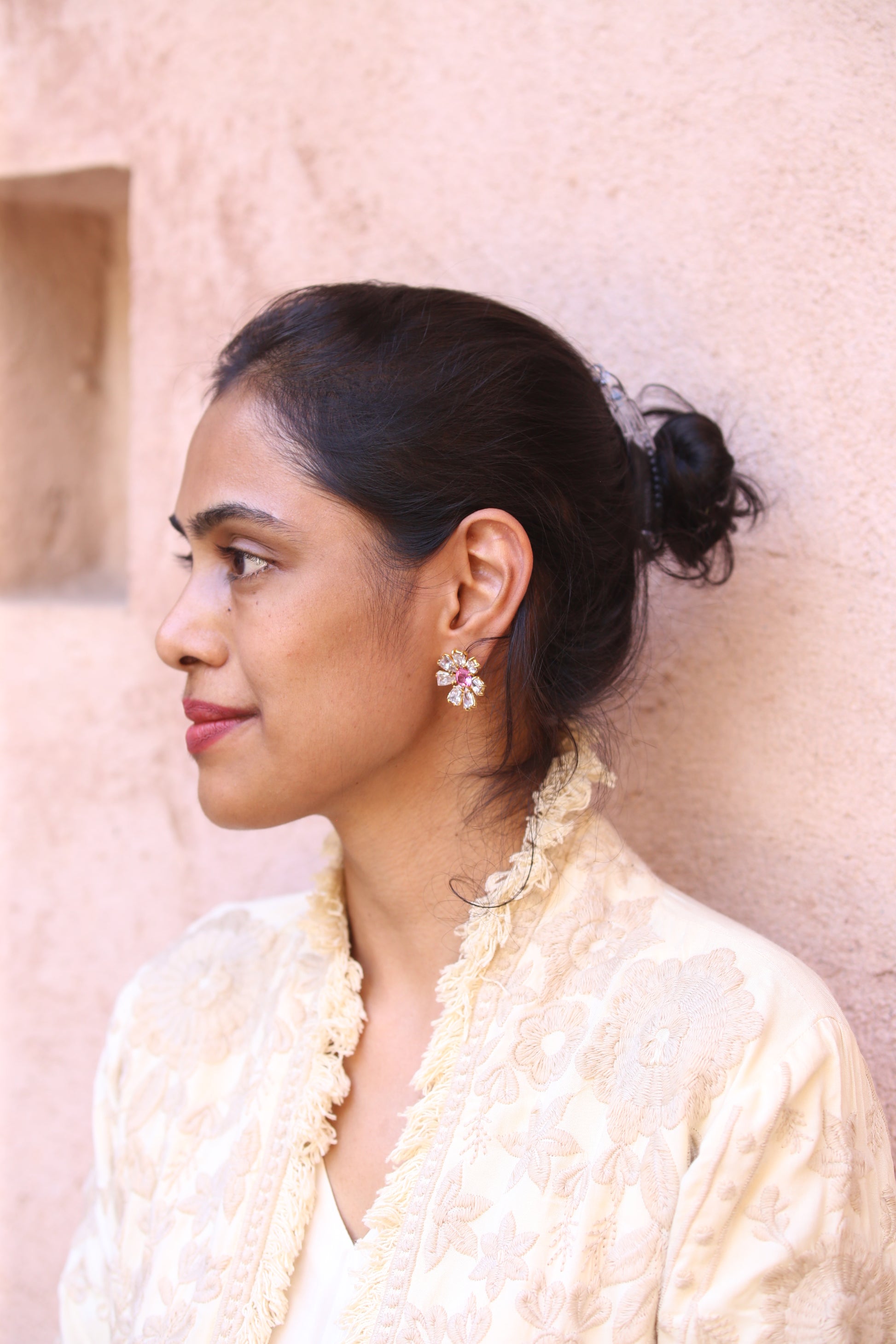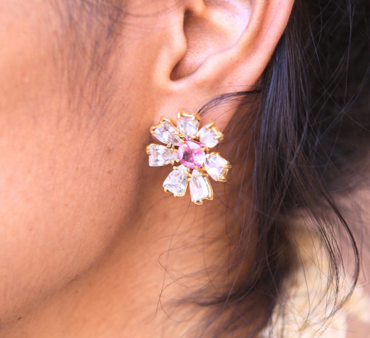Ethereal and radiant, the Crystal Fleur earrings bloom with grace and brilliance. Set in fine gold, each petal-shaped crystal encircles a blush-pink centerpiece, forming a luminous floral silhouette. Whether worn with soft silks or structured evening wear, these earrings bring a touch of enchantment to every look—a floral sparkle that lingers in memory.