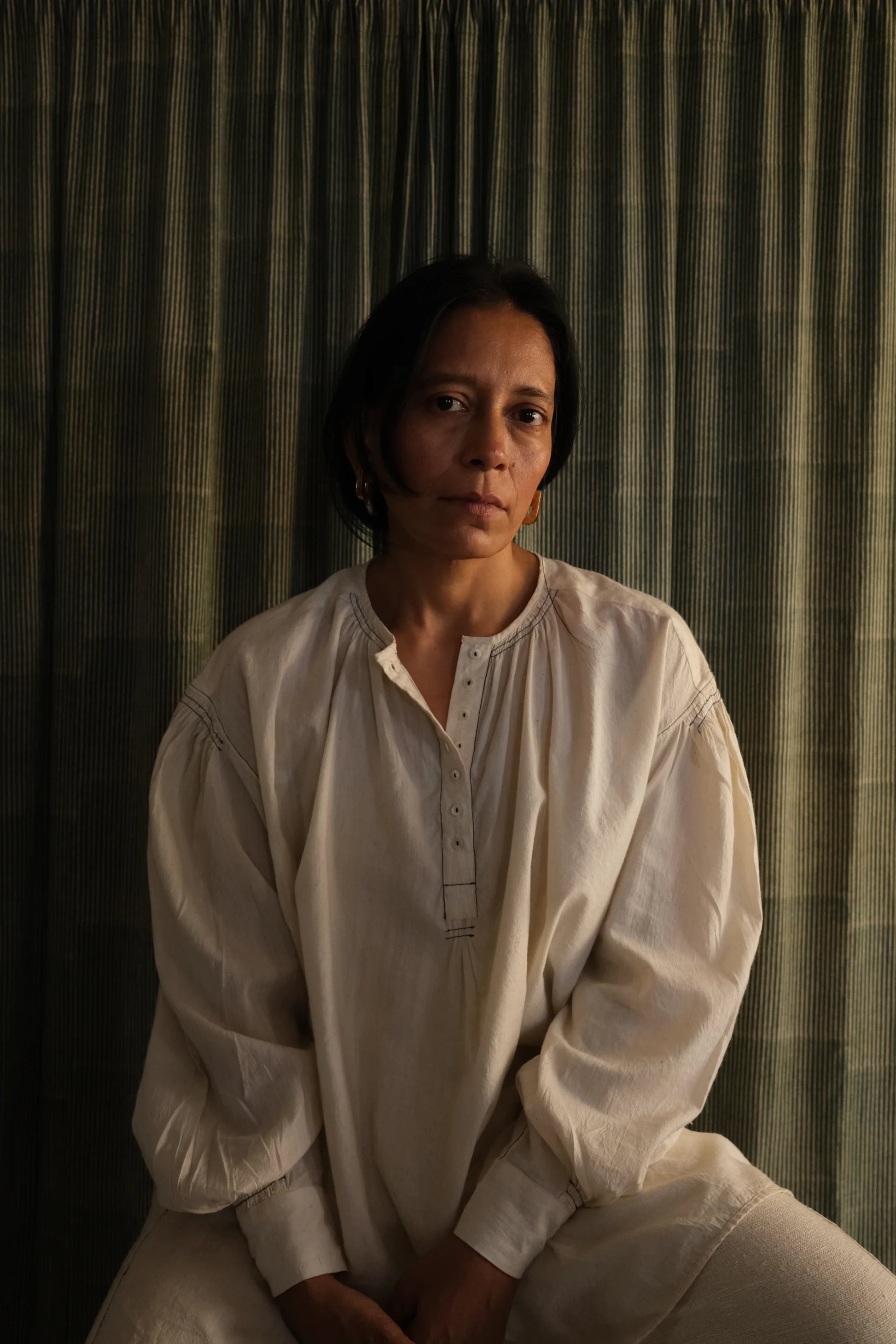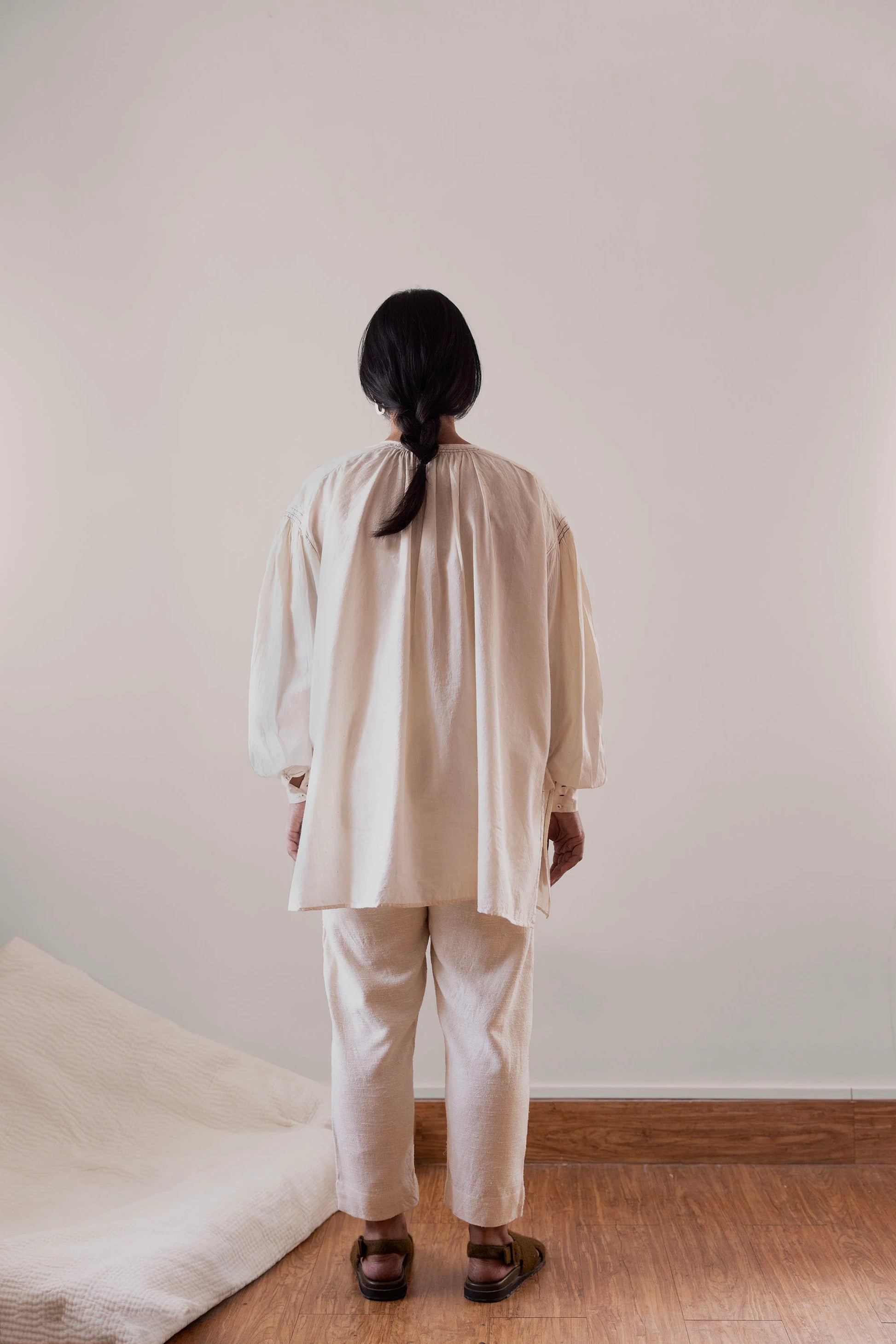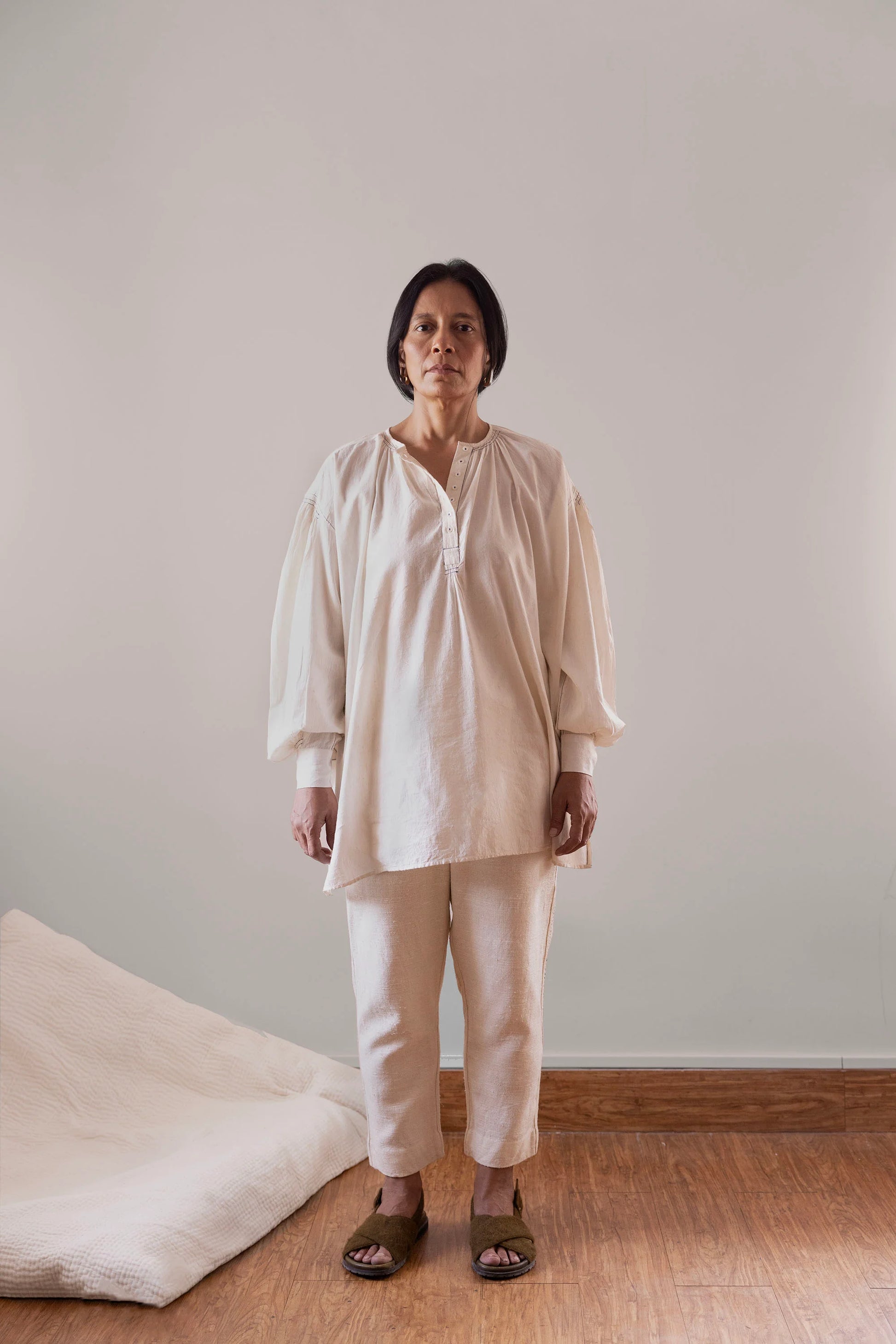 Made in Serai's signature Khadi silk the Raabri Top is oversized with gathers around the neck, sleeves and cuffs. It's the kind of top you can dress up or down as you please. The contrast stitch adds a restricted flair. The top is designed with gathers around the neck, sleeves, and cuffs, giving it a versatile look that can be dressed up or down to fit any occasion. Made with Serai's signature Khadi silk, it also features a unique contrast stitch, adding a touch of restricted flair to any ensemble.