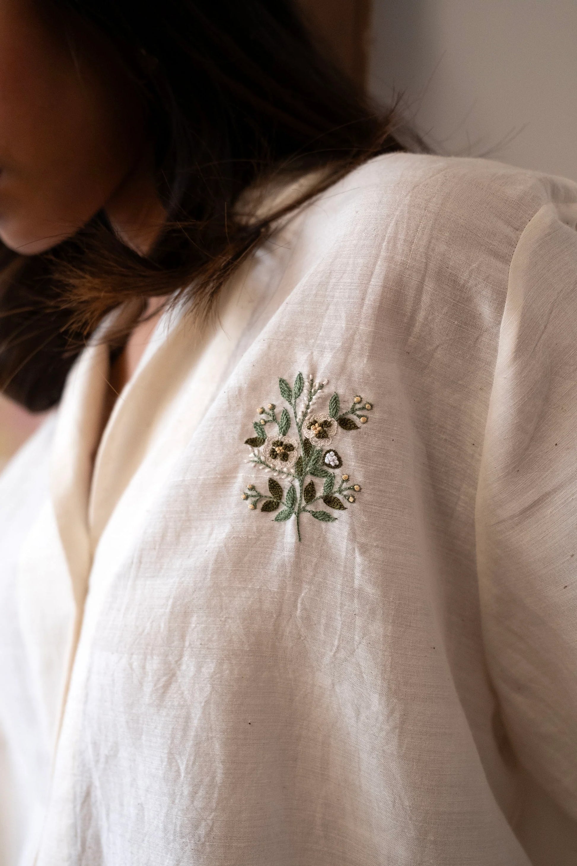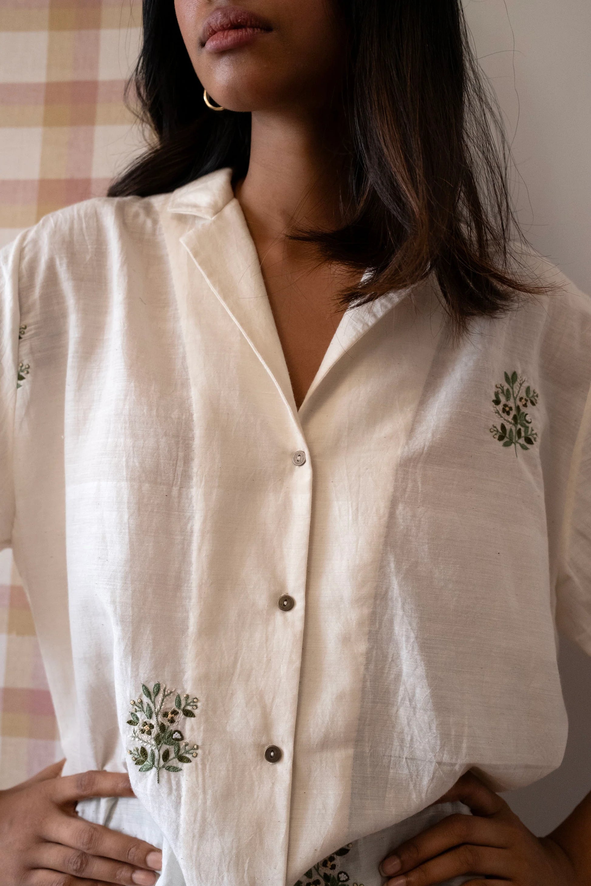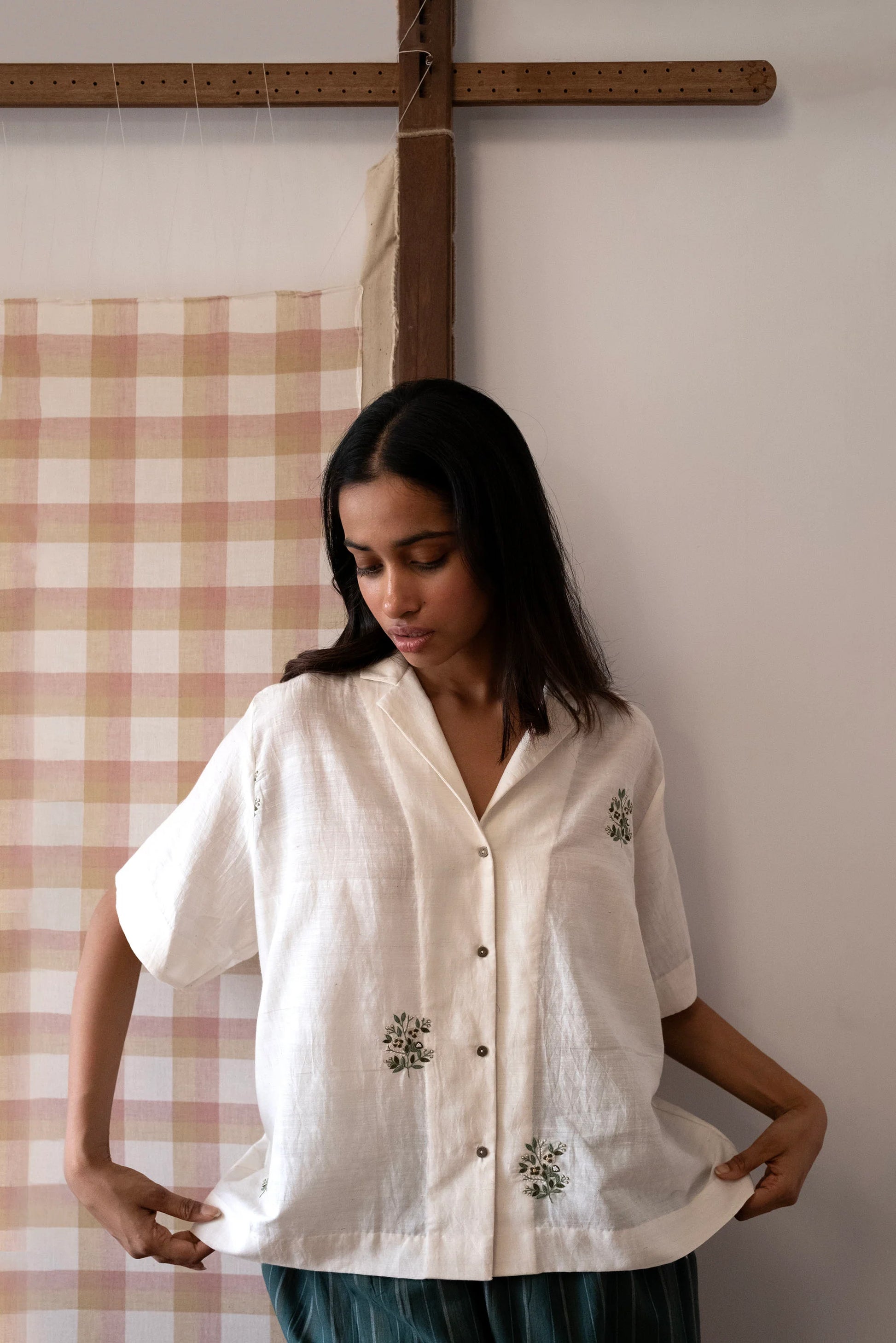 A boxy short sleeved shirt in khadi silk, with hand embroidered floral motifs and metal buttons. Crafted from luxurious khadi silk, this boxy short sleeved shirt boasts intricate hand-embroidered floral motifs and polished metal buttons to elevate your style game.