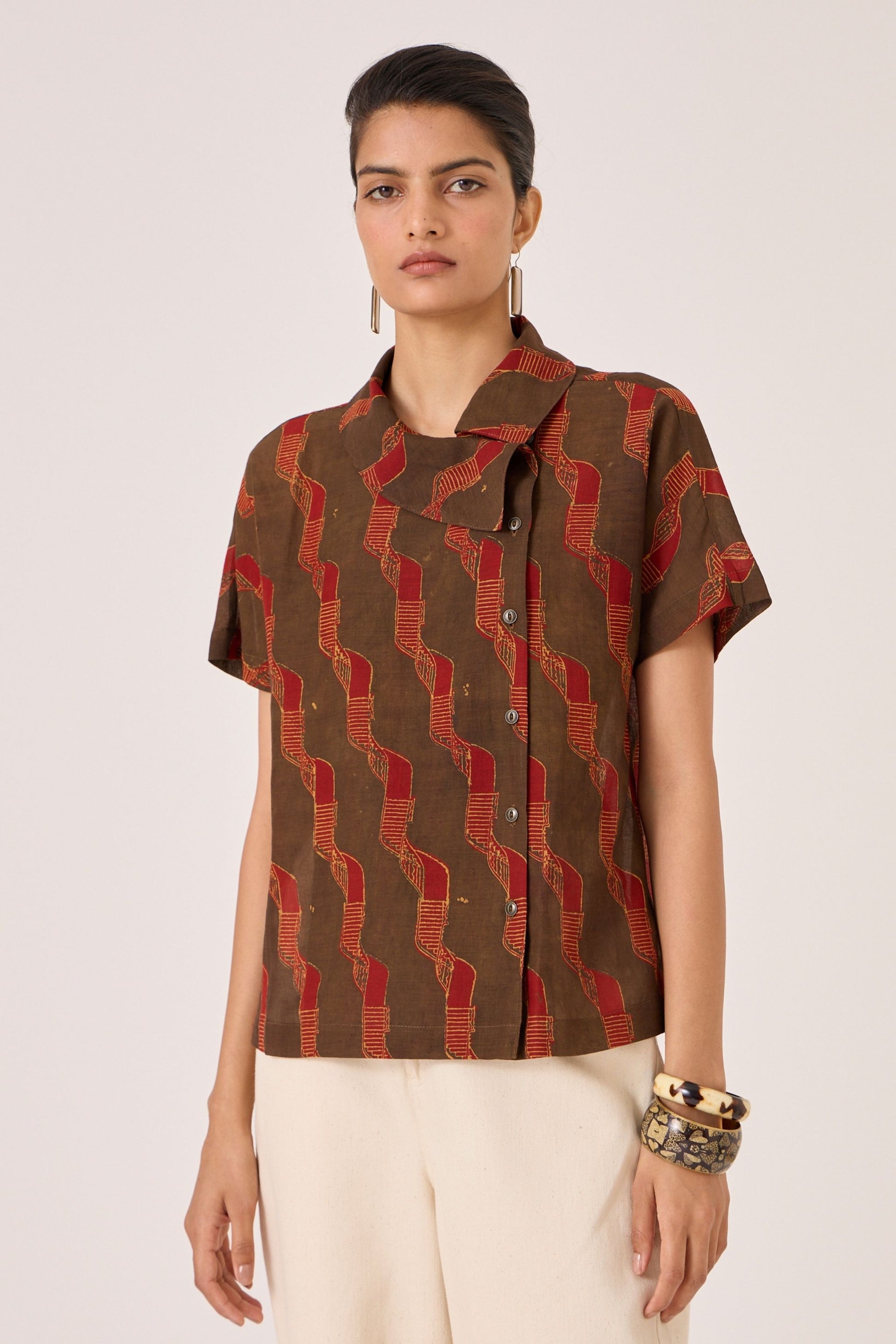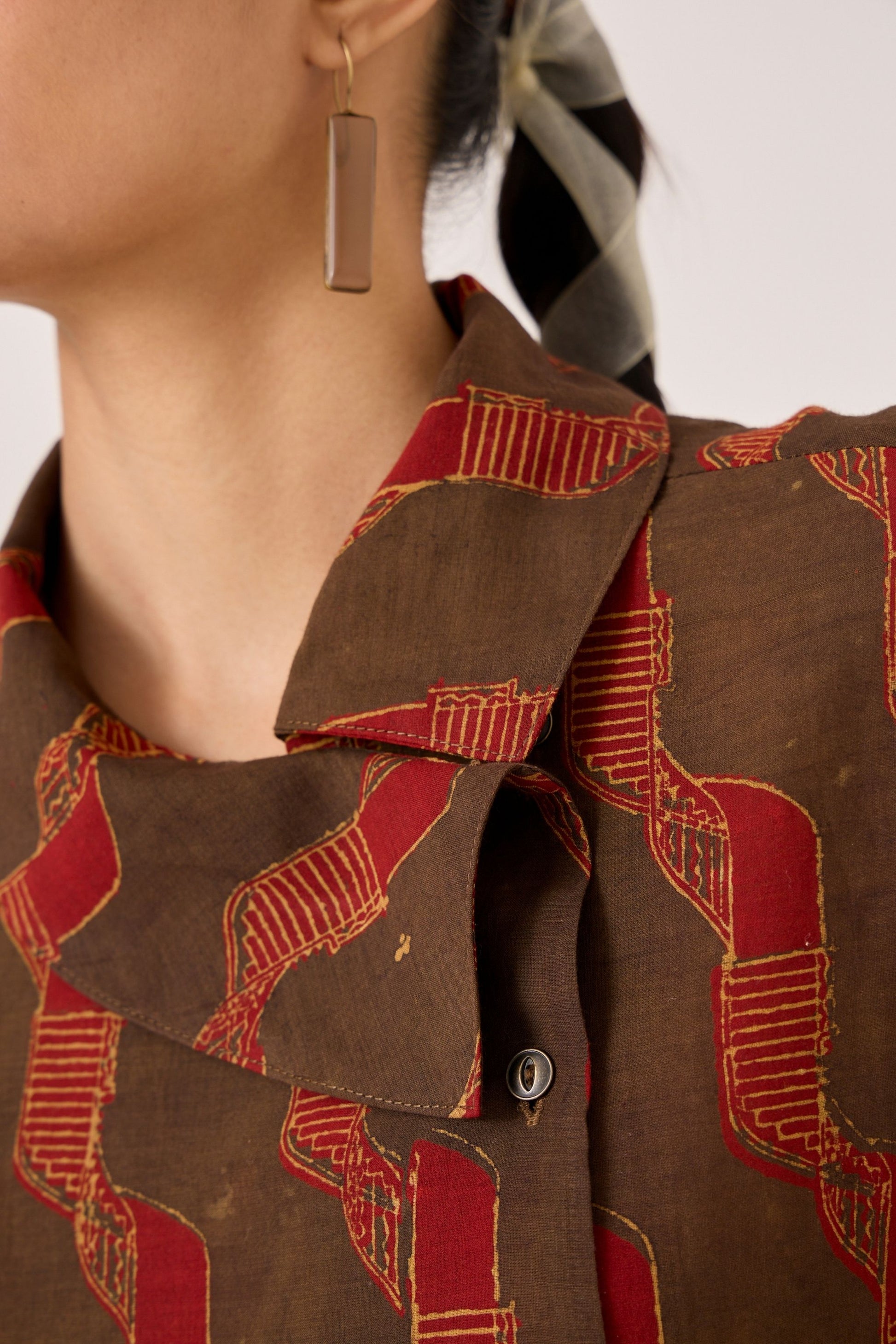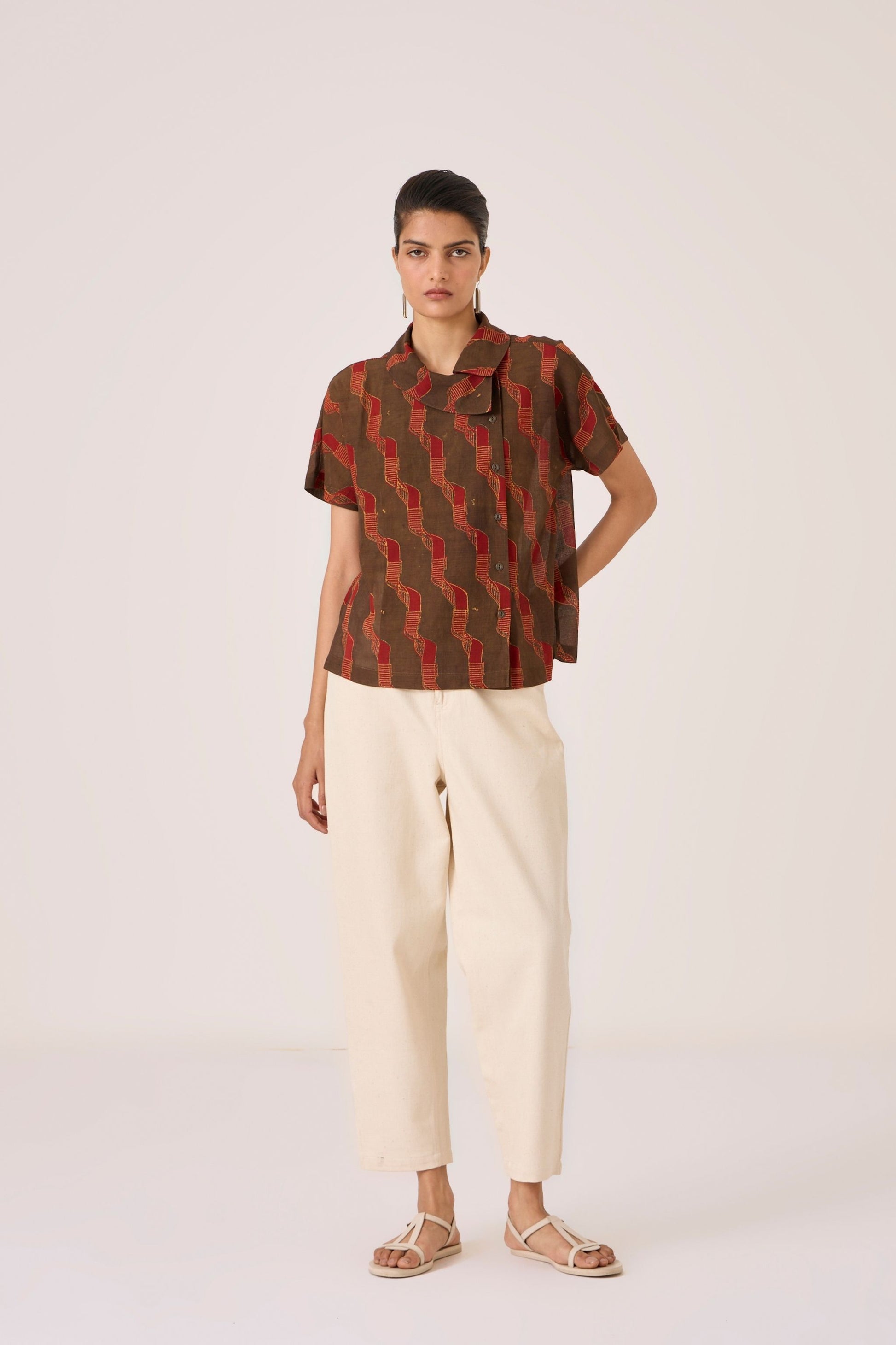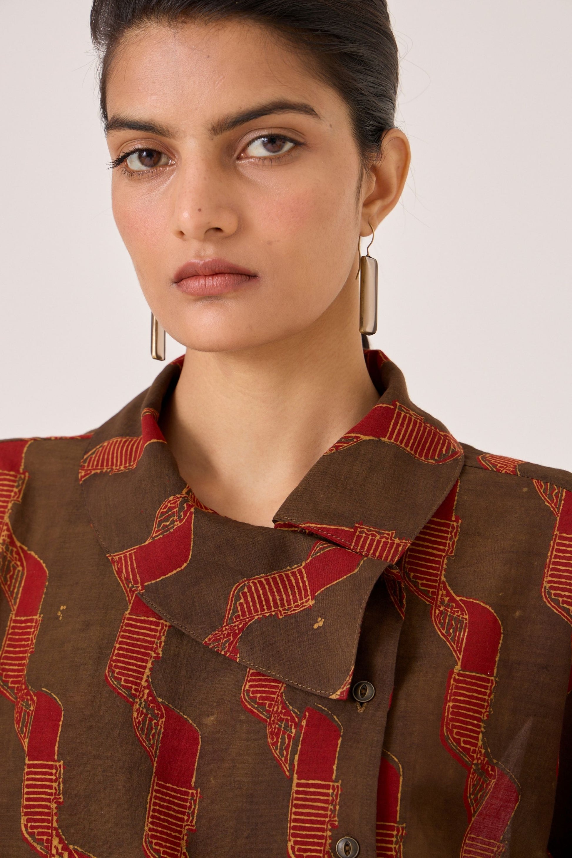 This signature ajrakh block print is designed in our studio and hand block printed by traditional artisans in Gujarat. Print placement may vary from garment to garment. Slight irregularities in print are common and speak to the hand processes involved.