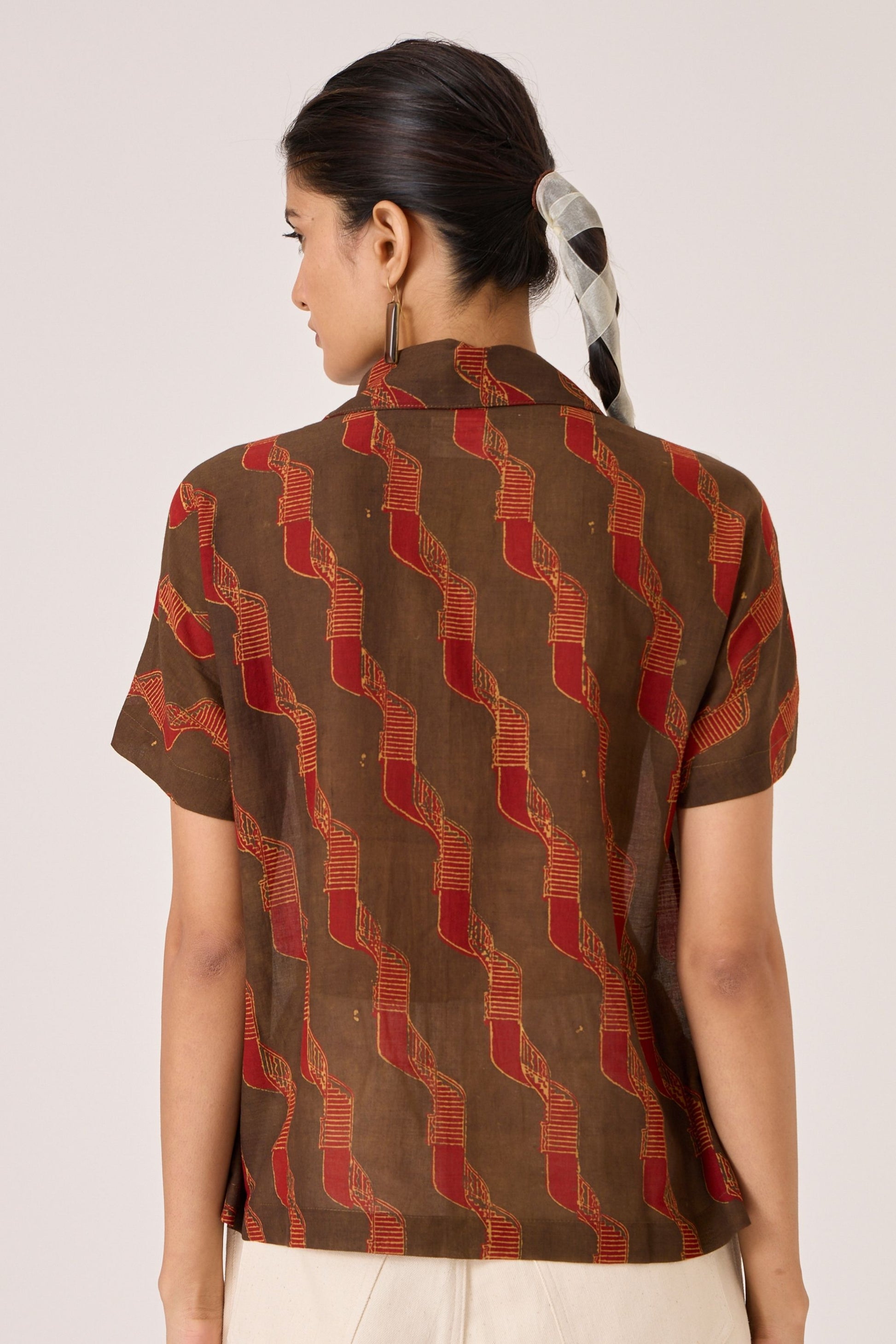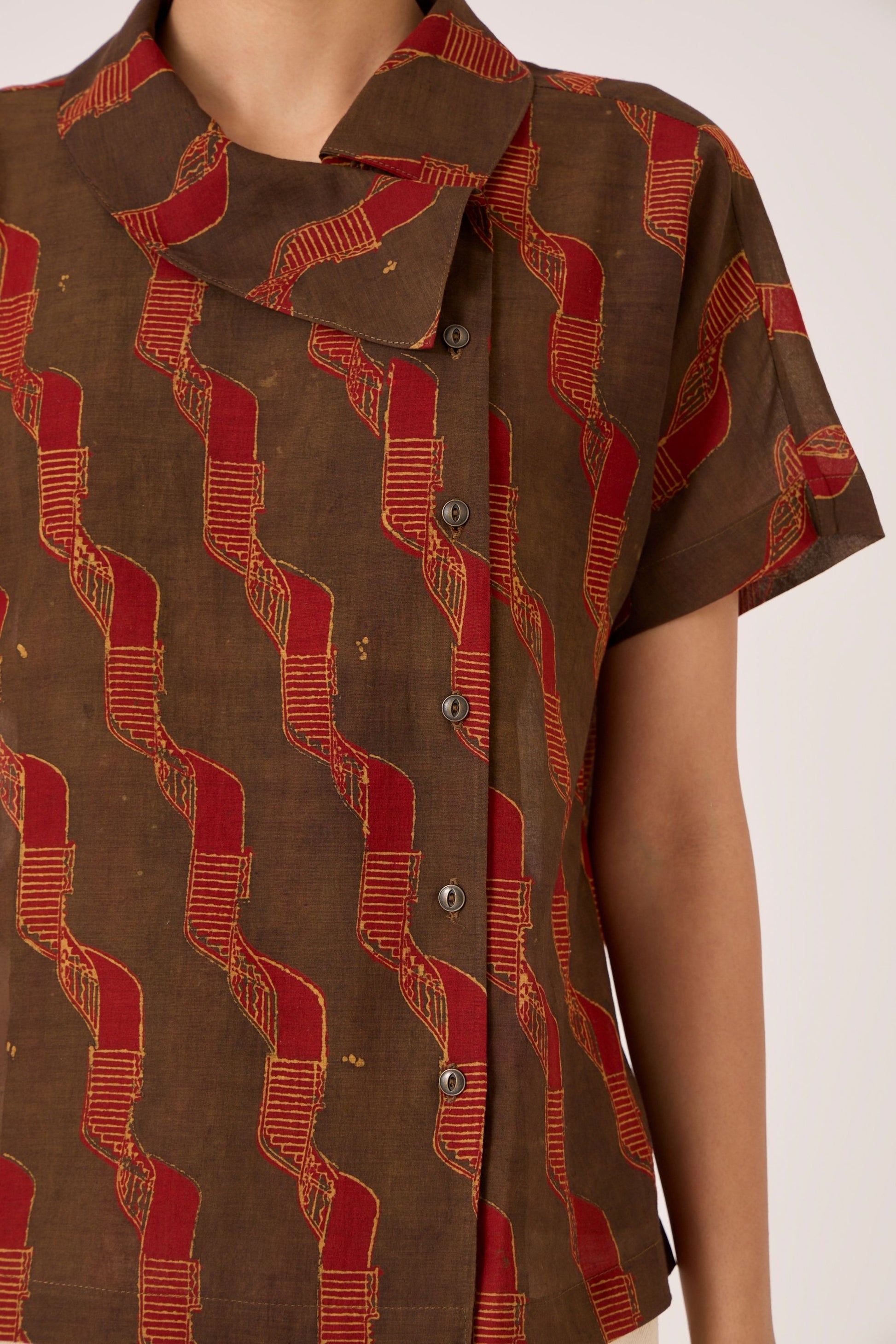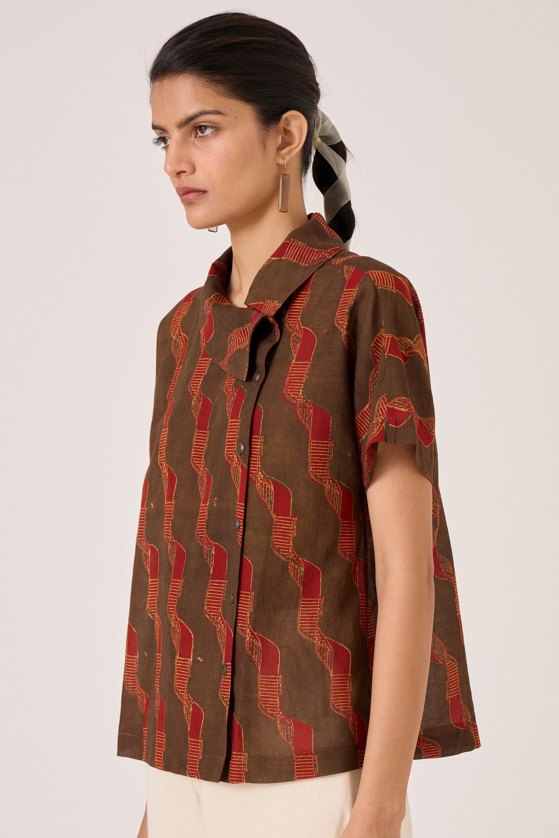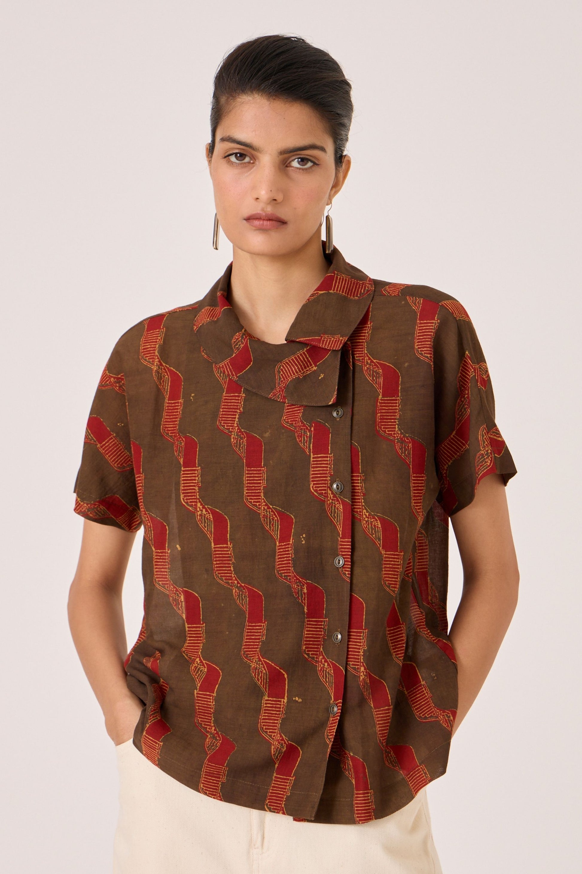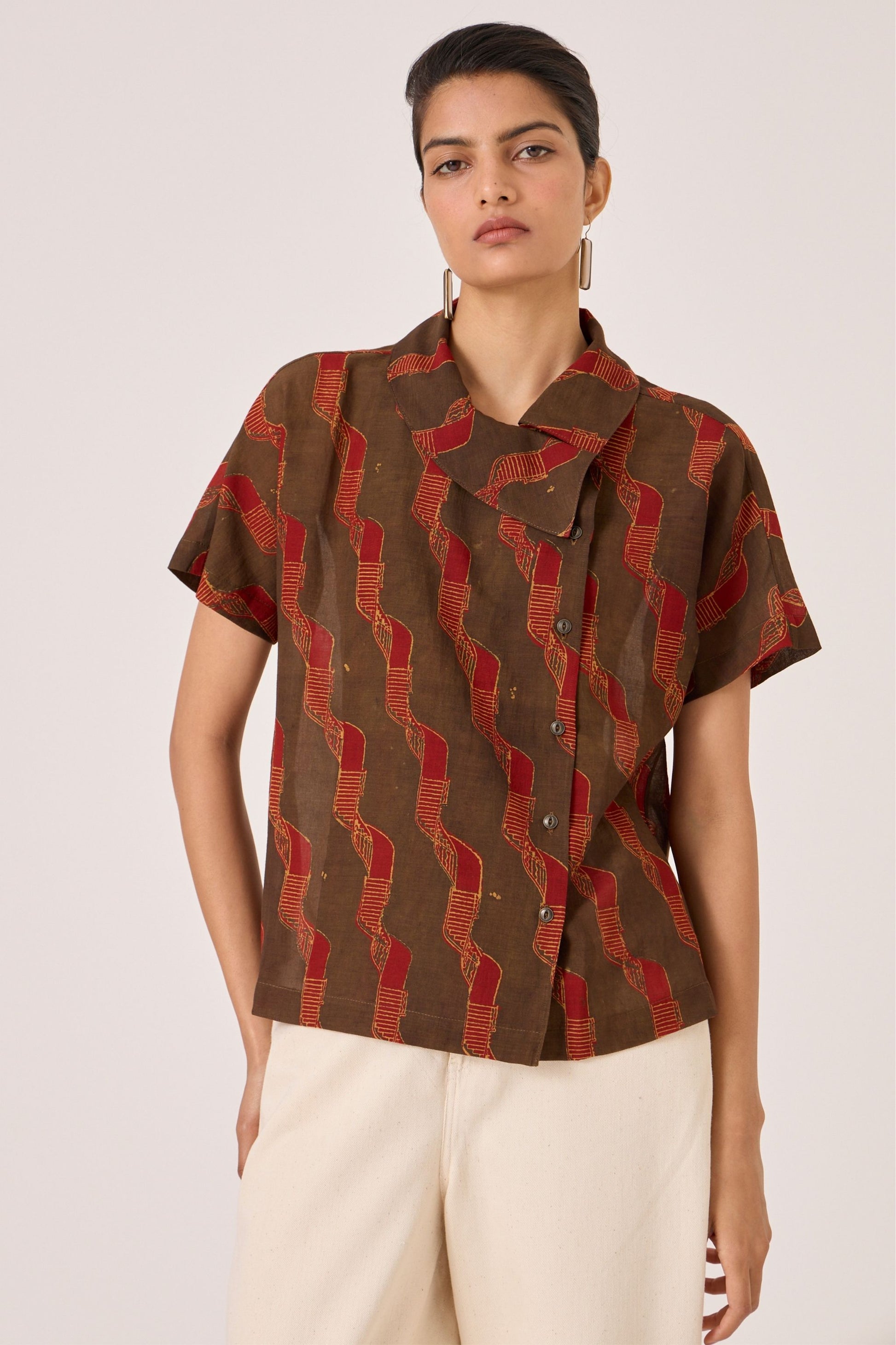 This signature ajrakh block print is designed in our studio and hand block printed by traditional artisans in Gujarat. Print placement may vary from garment to garment. Slight irregularities in print are common and speak to the hand processes involved.