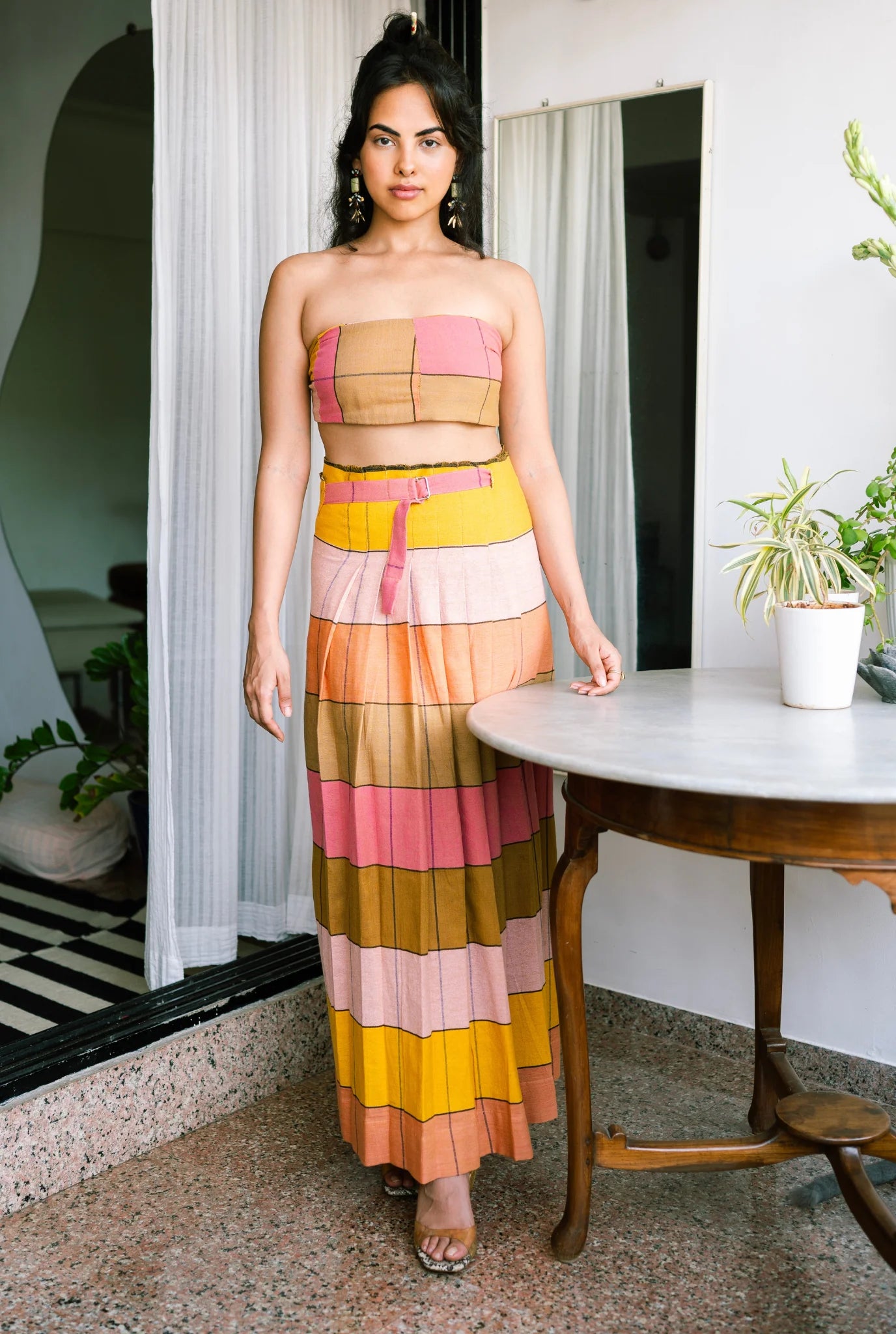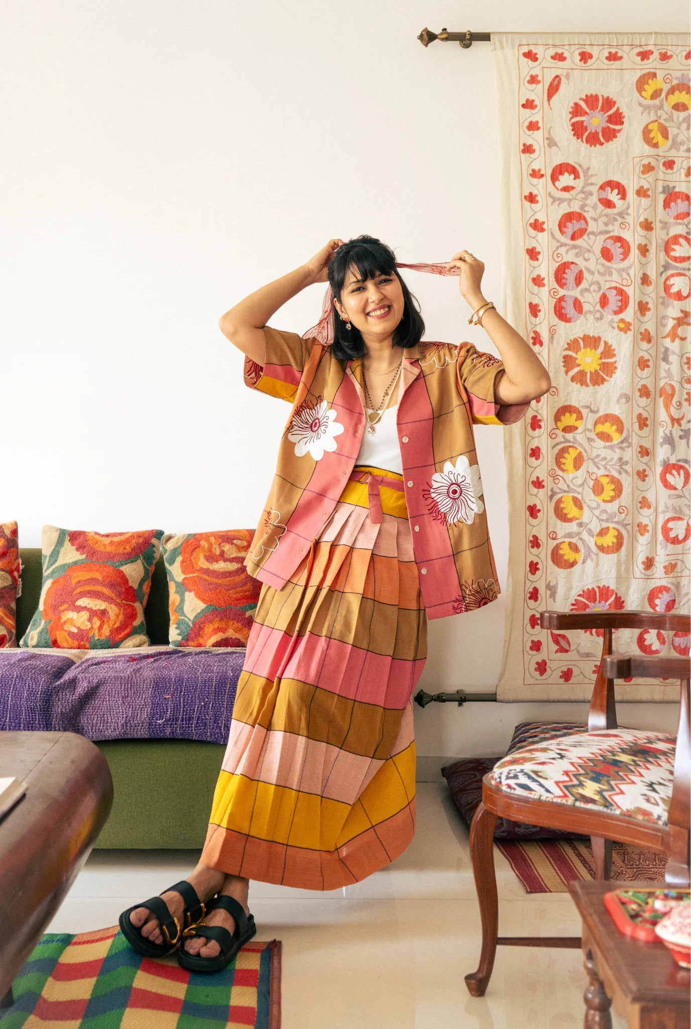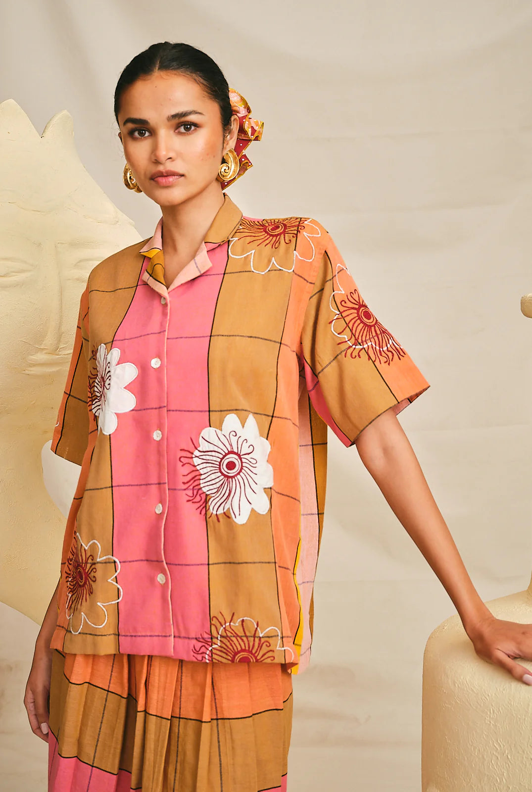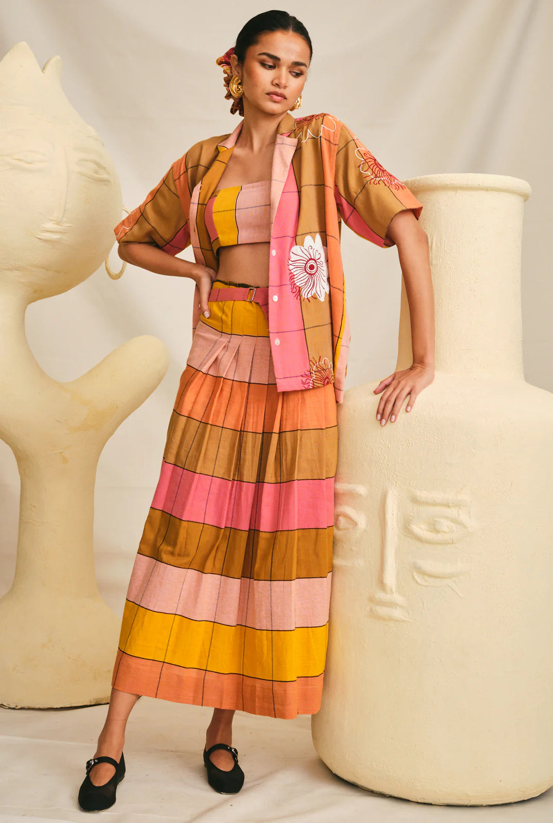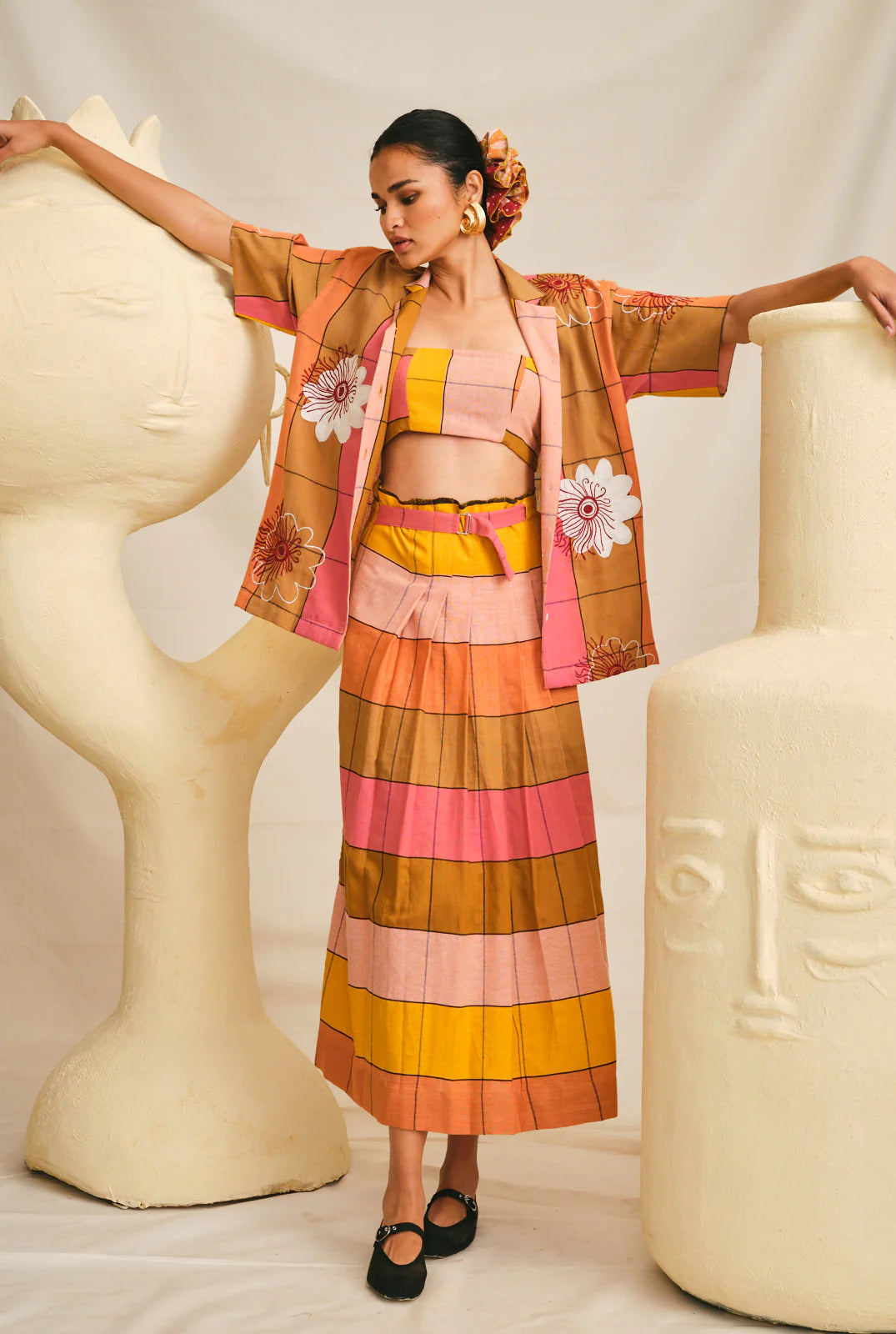 Nothing beats a co-ord set that's low on effort and has maximum impact. This handwoven checkered set includes a bralette, shirt and skirt and captures the essence of summer. It’s embellished with embroidered appliqué flowers for a blooming look!