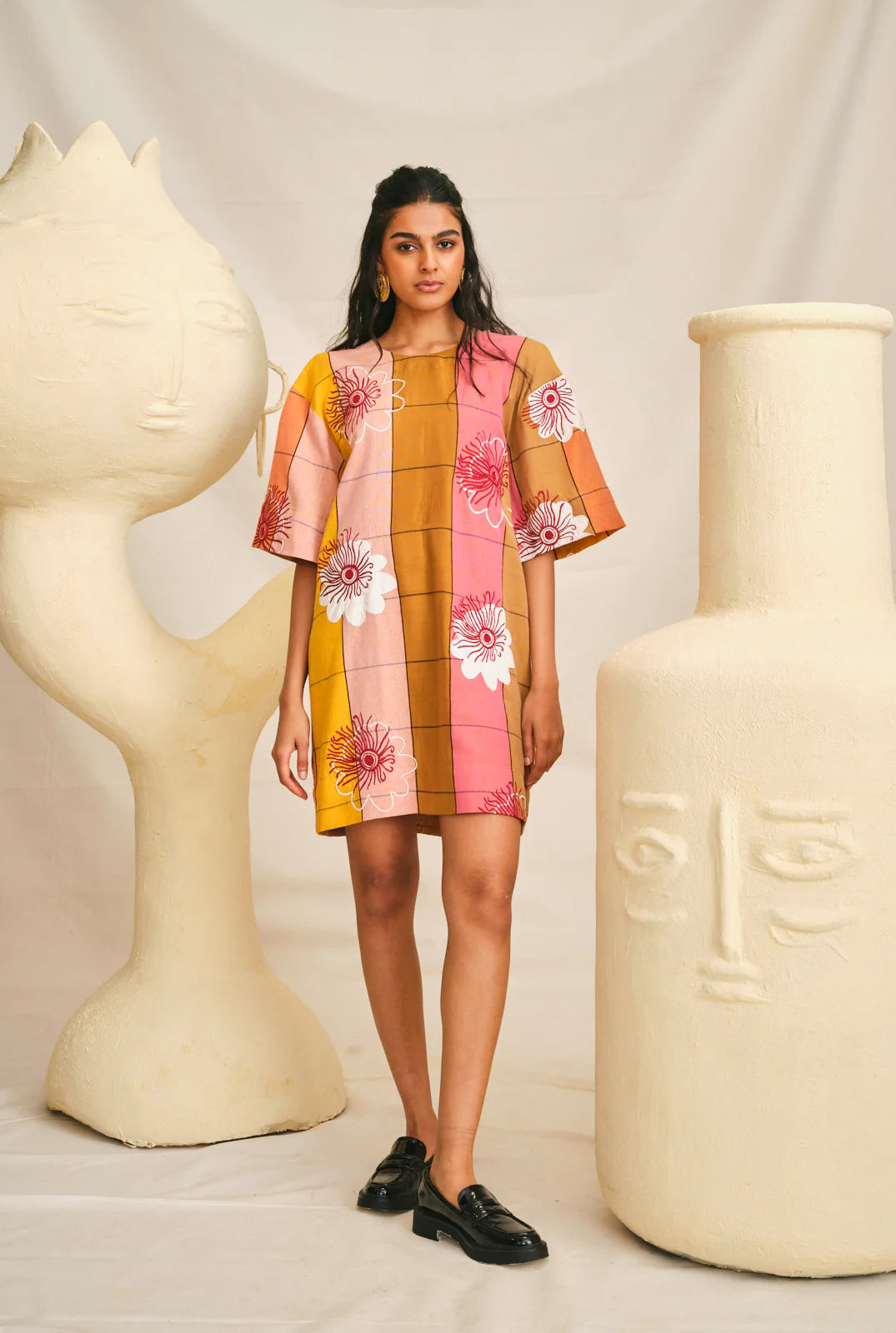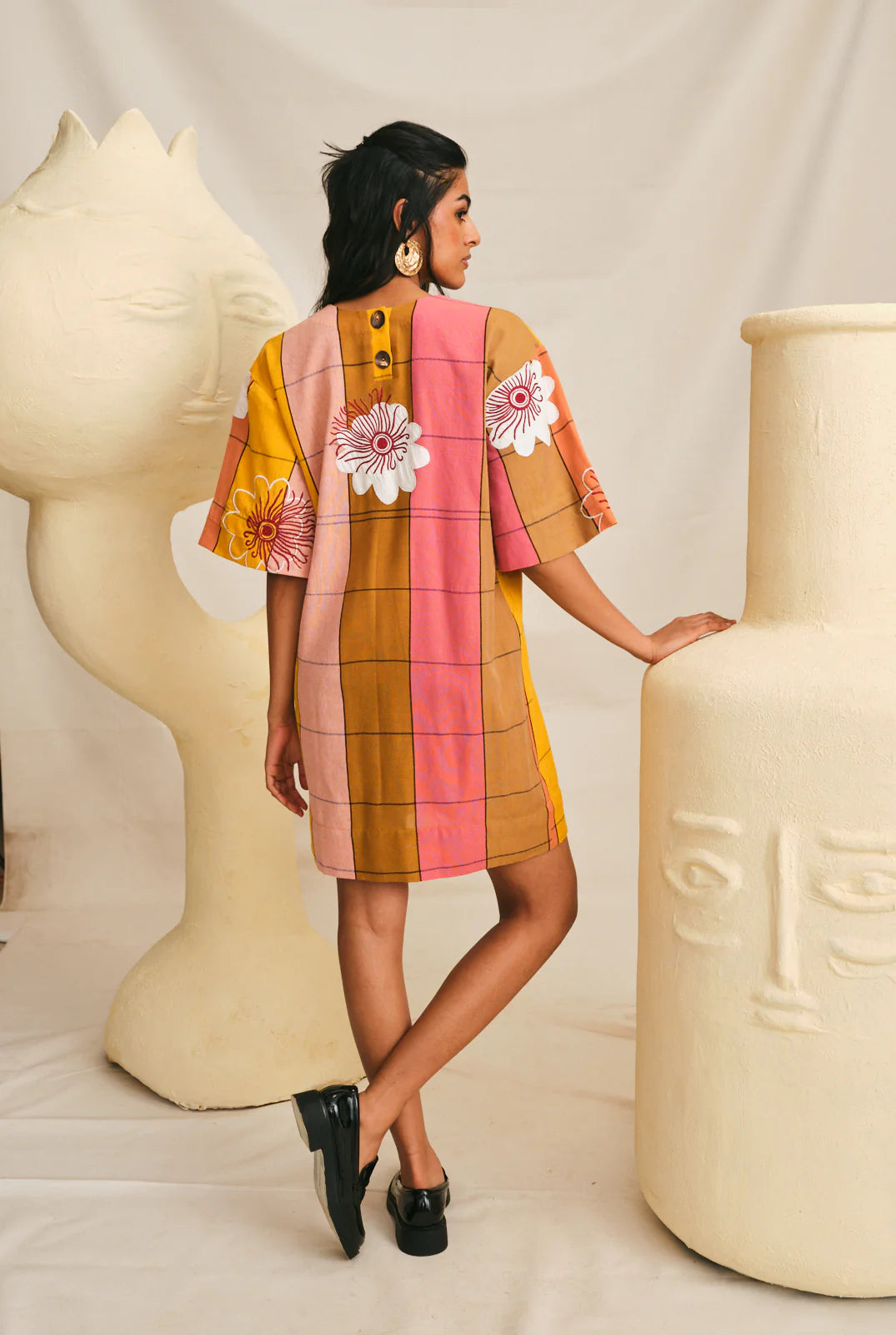 Checkmate the heat with our handwoven checkered shift dress ;) The mini dress you need this summer to make you look and keep you effortlessly cool. Crafted in a handwoven textile, it features appliqué detailing and hand embroideries.