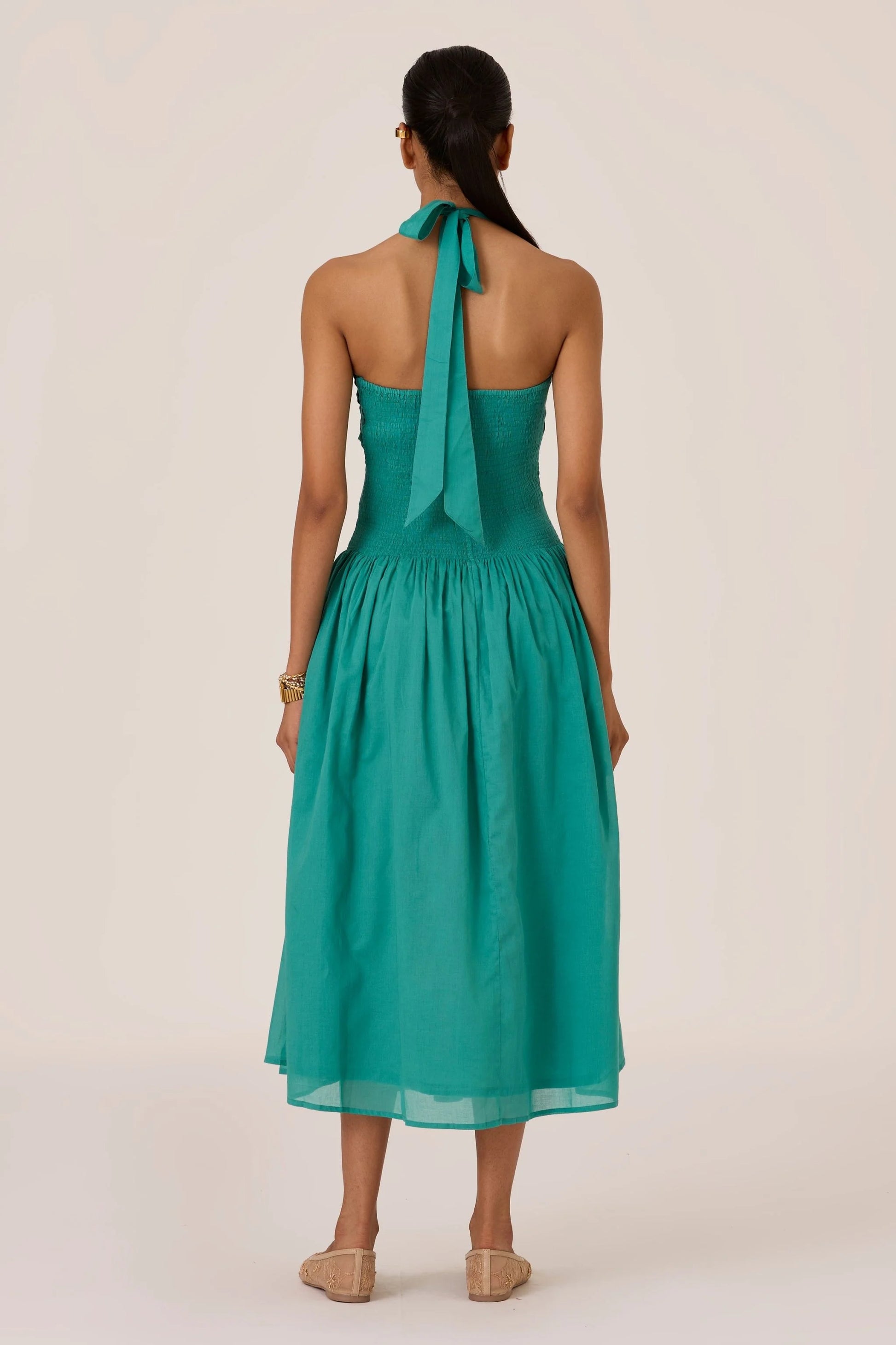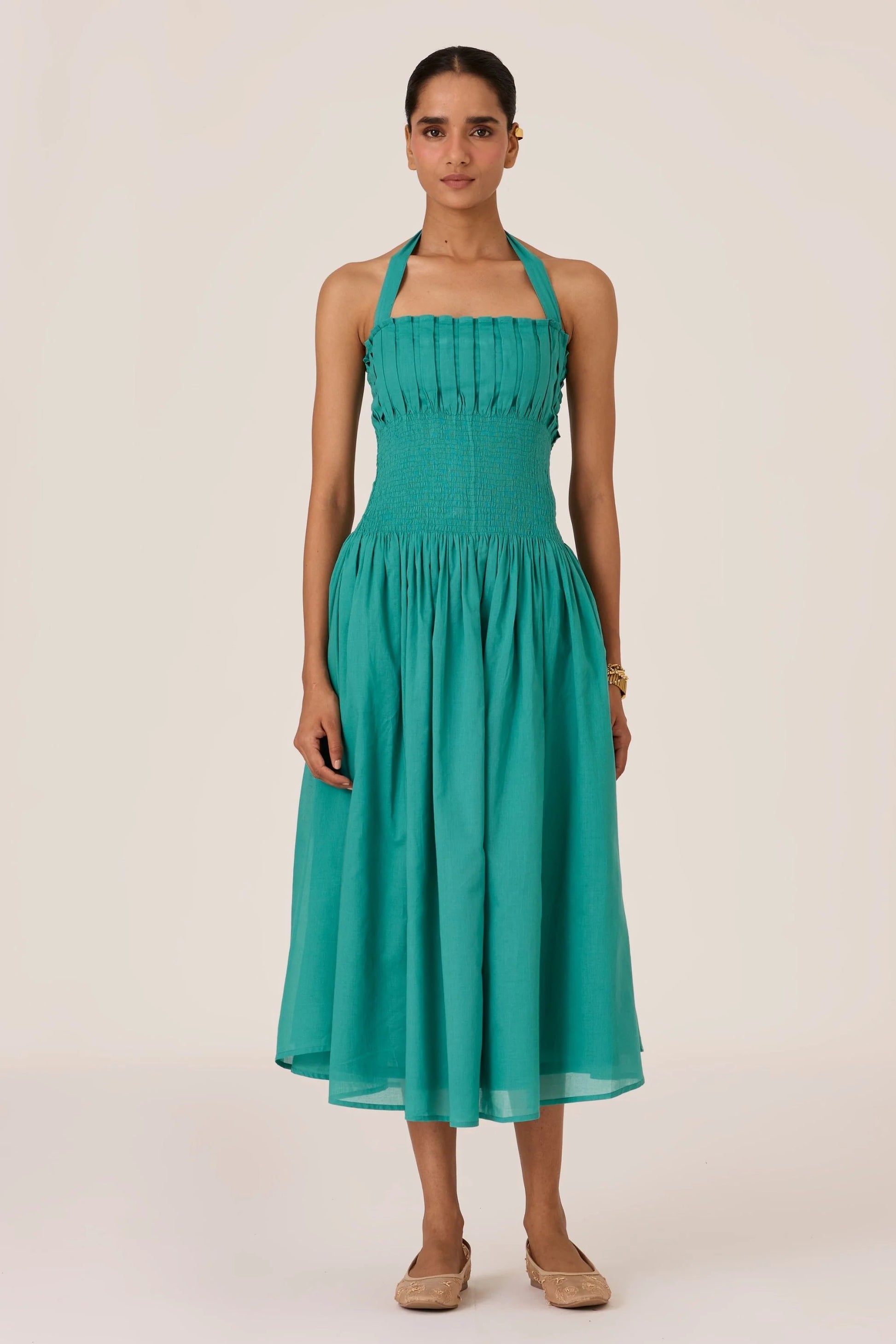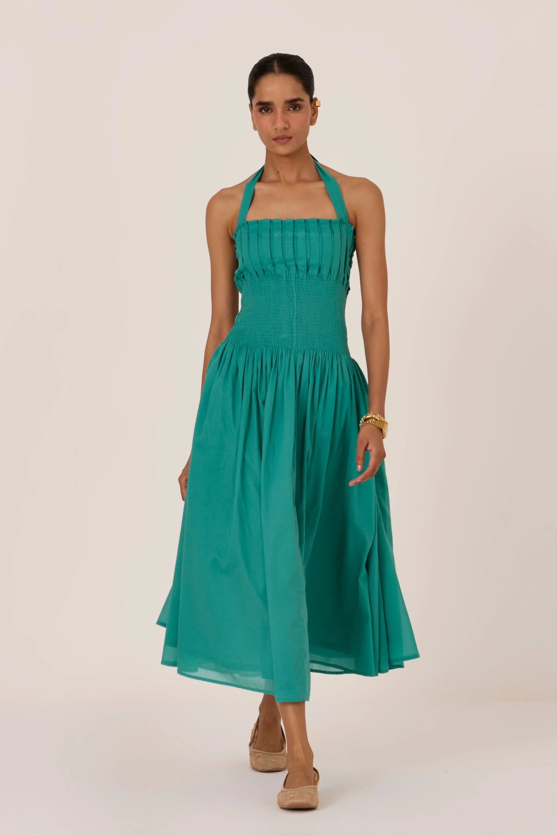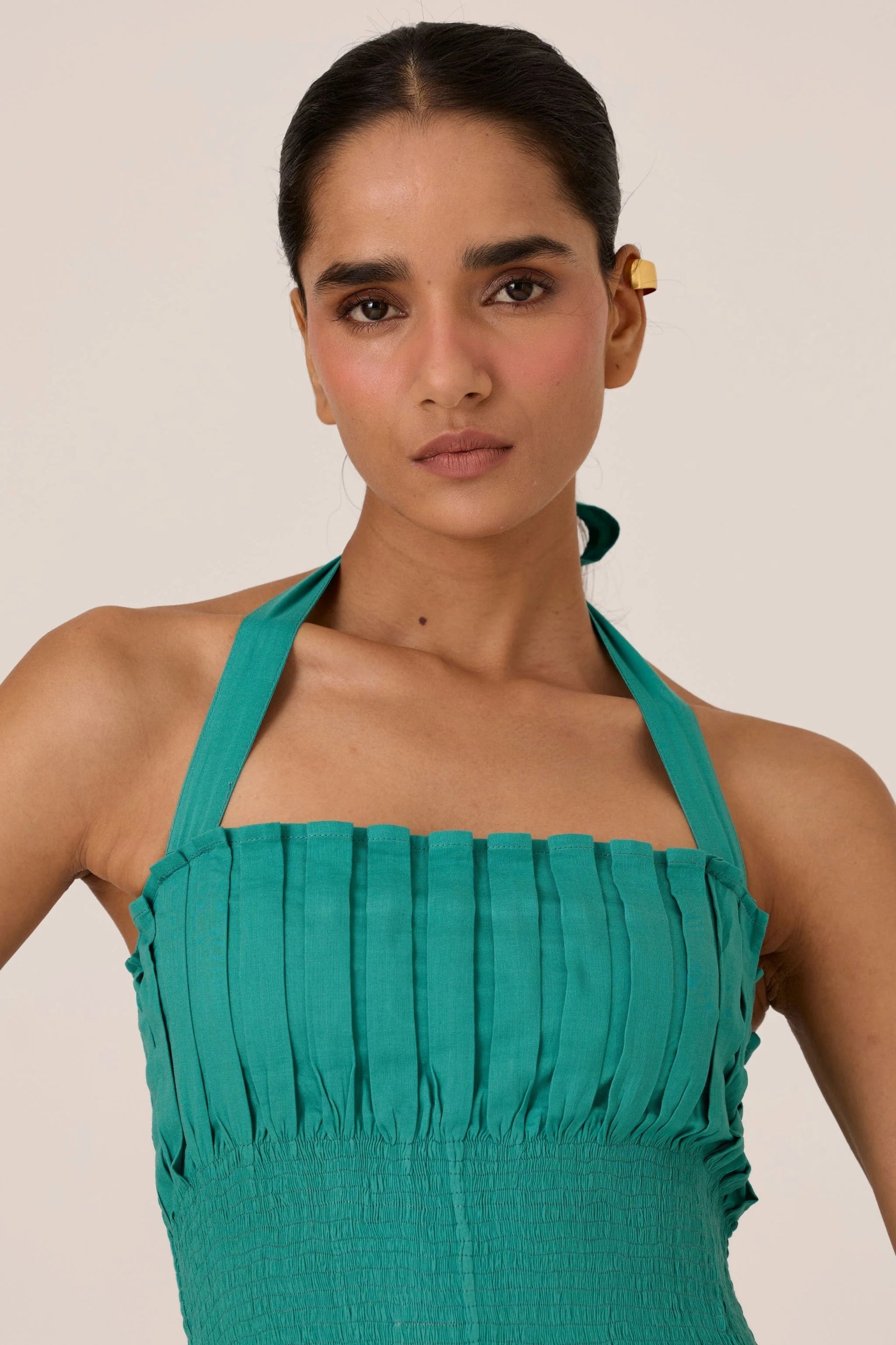 This statement halter neck dress flows from sharp pleats into soft ruching. Fully lined. In-seam pockets. Impeccably tailored in our studio.