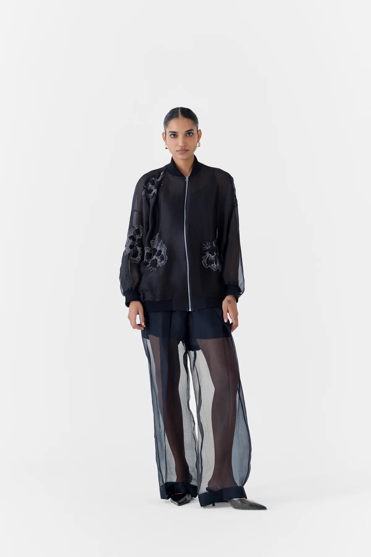 The Ajisai Organza Trousers crafted from our stunning organza fabrication, trans-seasonal, is a statement piece. This trousers, made in our hand dyed black colour, has a relaxed fit. It has a crepe lining till the thigh and a side zipper. It can be paired with our Ajisai Bomber jacket. Wear it with heels for an elegant look.