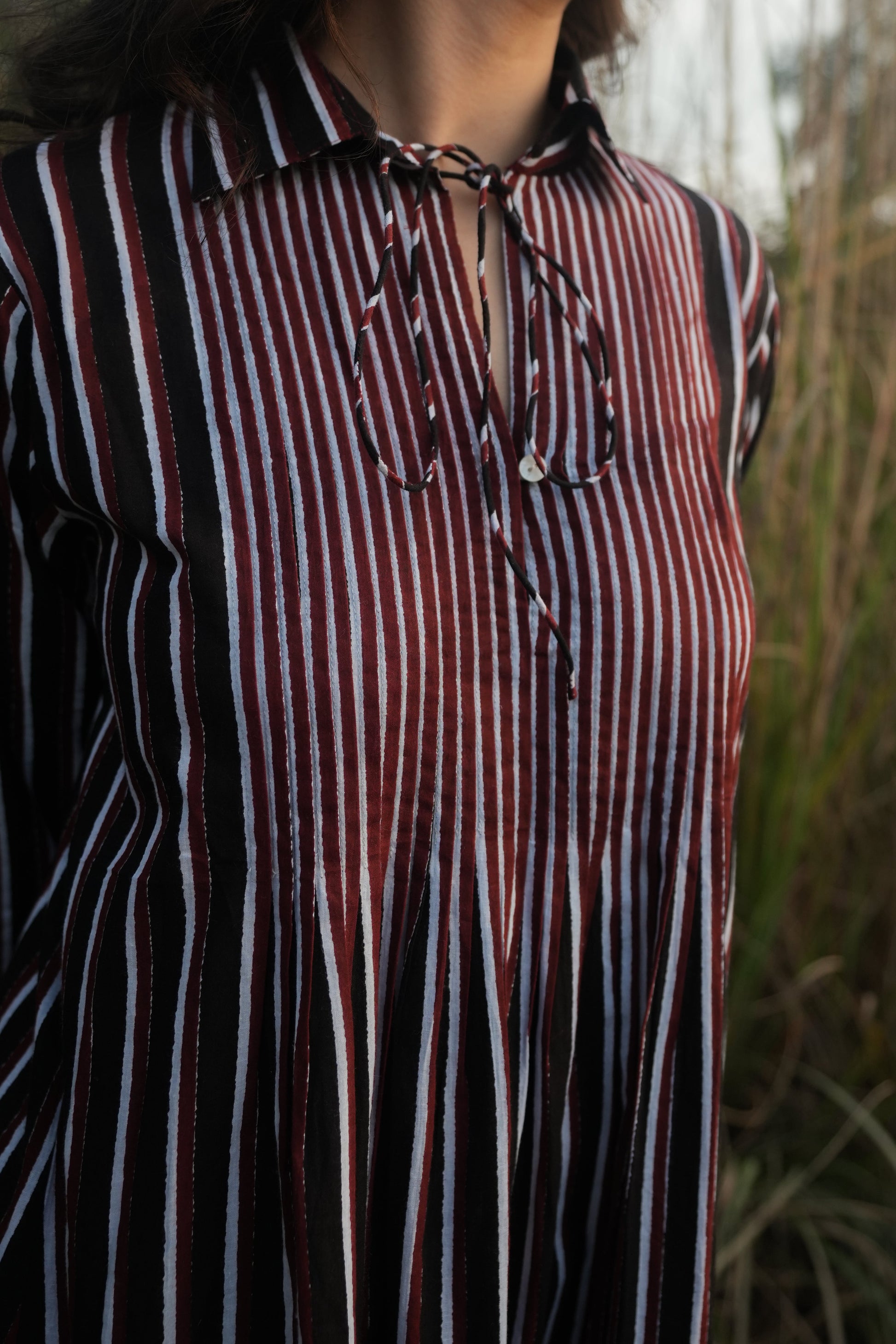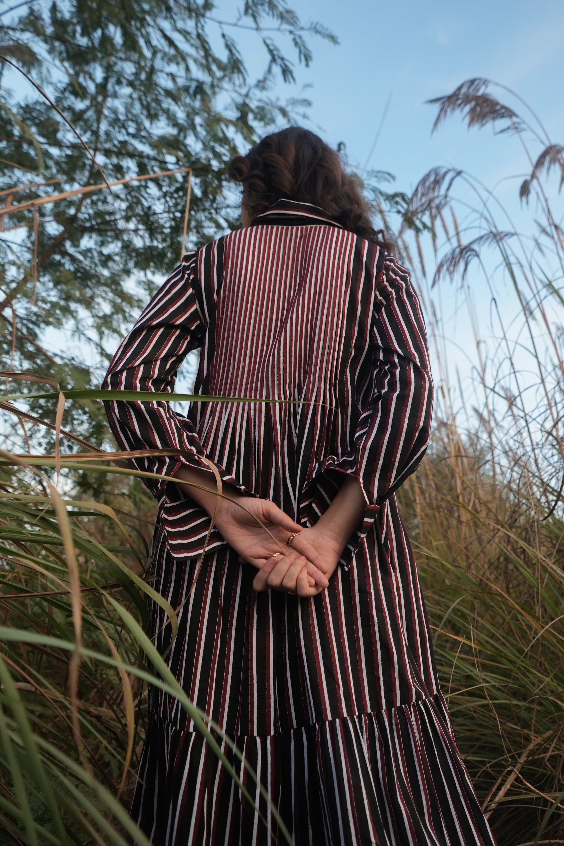 The Akari Striped Dress is a long, flowing column broken gently by tiers and pleats. From the collar and buttoned neckline down to the full-length hem, the stripes shift subtly as the fabric moves, giving depth to the otherwise simple shape. It feels composed yet unrestrictive, with enough volume to feel free and enough structure to feel considered