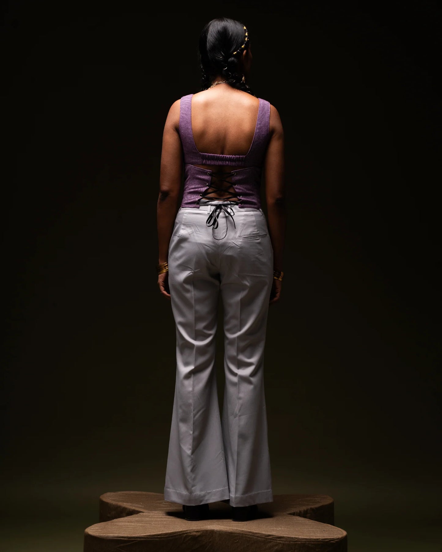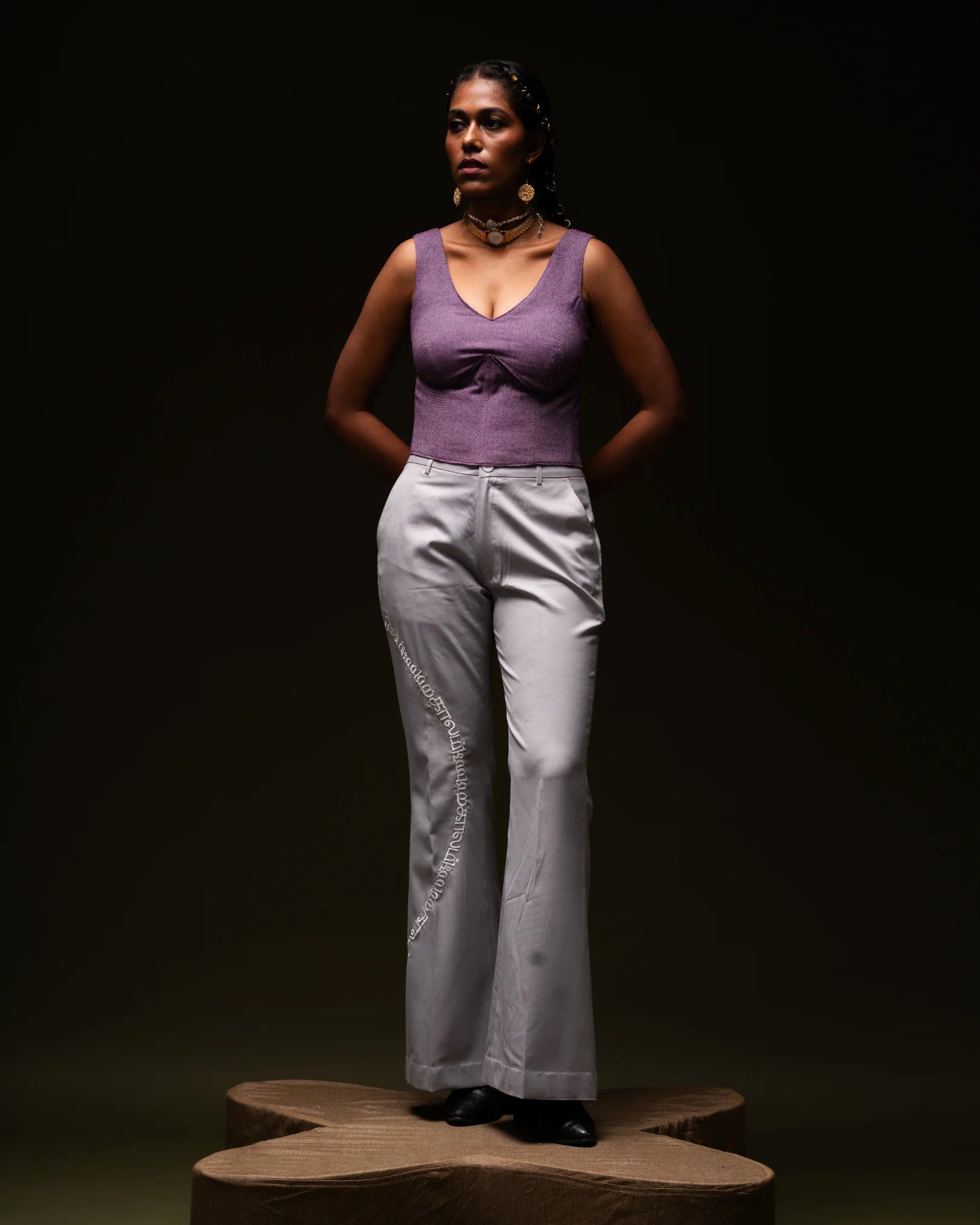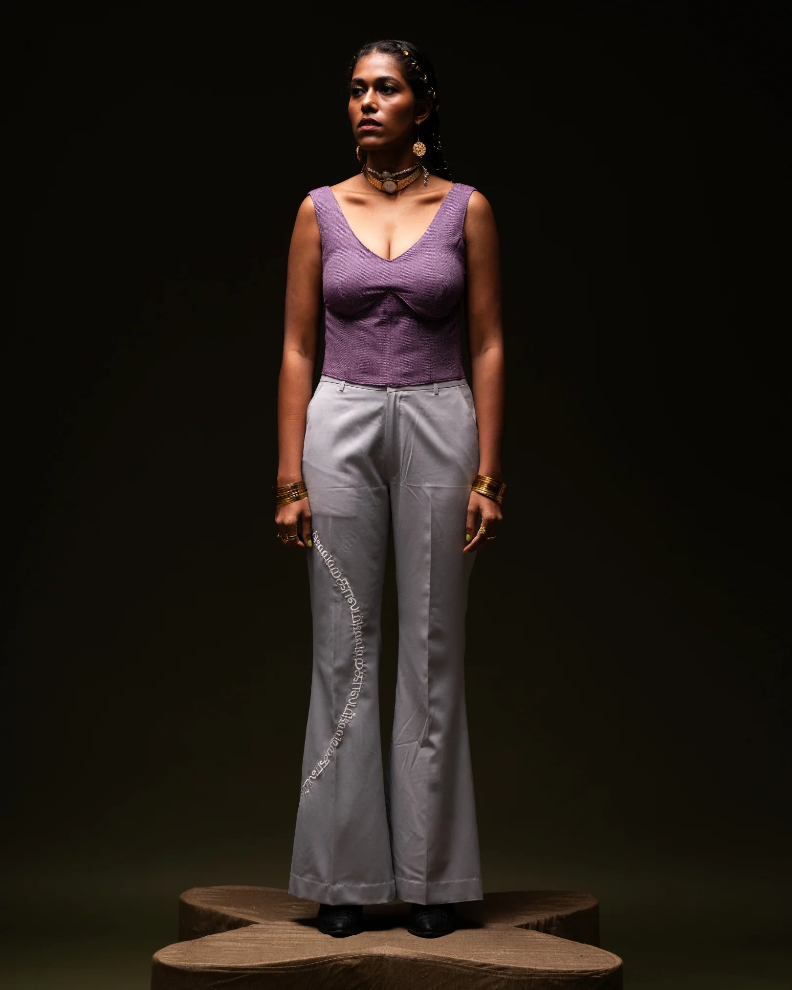 Get ready to turn heads with our Almighty Goddess bralette. Crafted from purple Jamakkalam cotton, it features curvy straps and a detachable corset belt detail. The tiny wired cup top has side cutouts under the bust, while the corset belt features crisscrossing back straps. Designed for versatility, the bralette can be worn in three ways: as a top, a corset, or both together, connected by a hook.