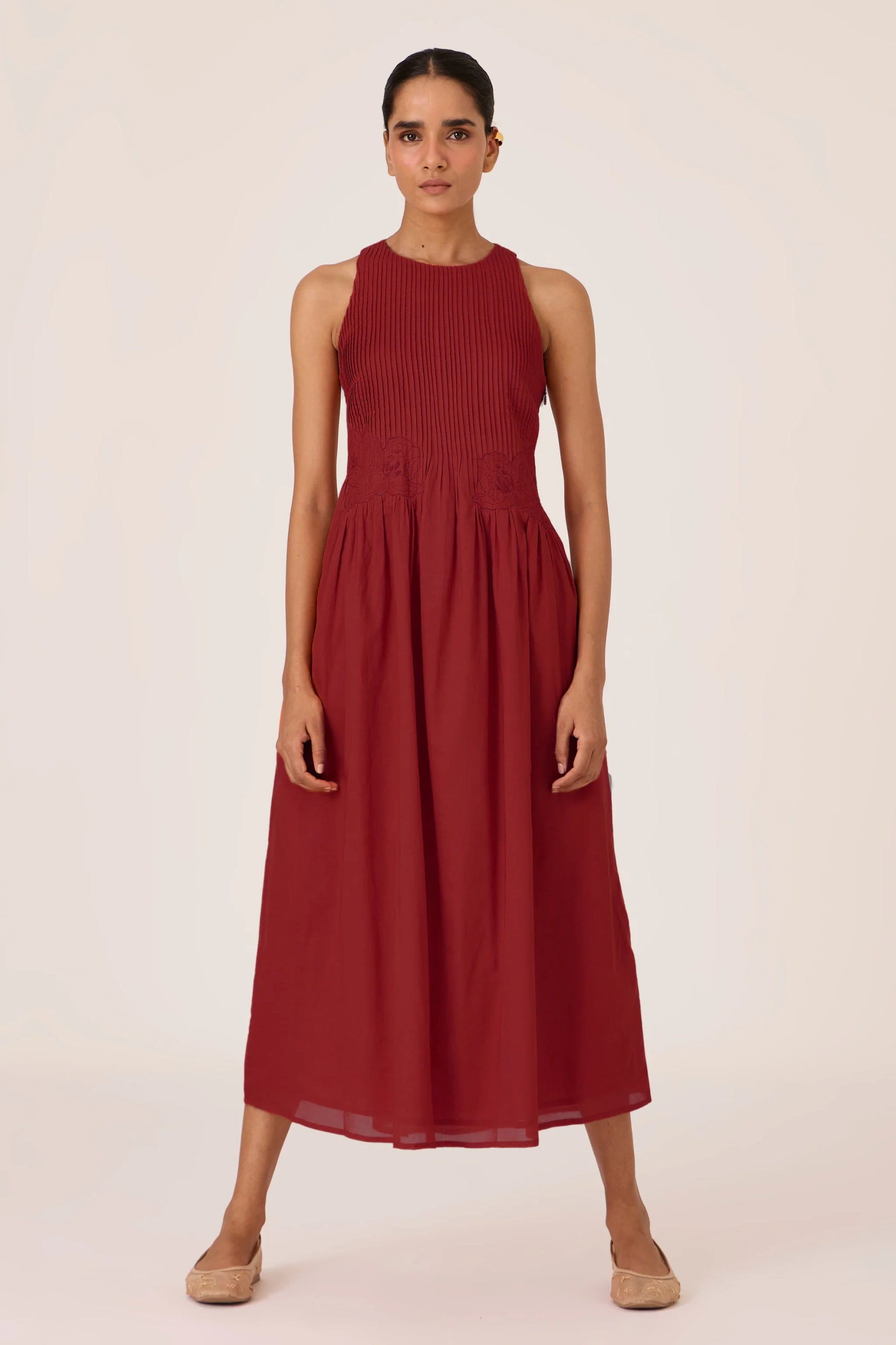 Gathered waist sleeveless dress with fine pintuck bodice. Waist gathers for gentle movement. Single rouleau button at the back. Side zip for ease.