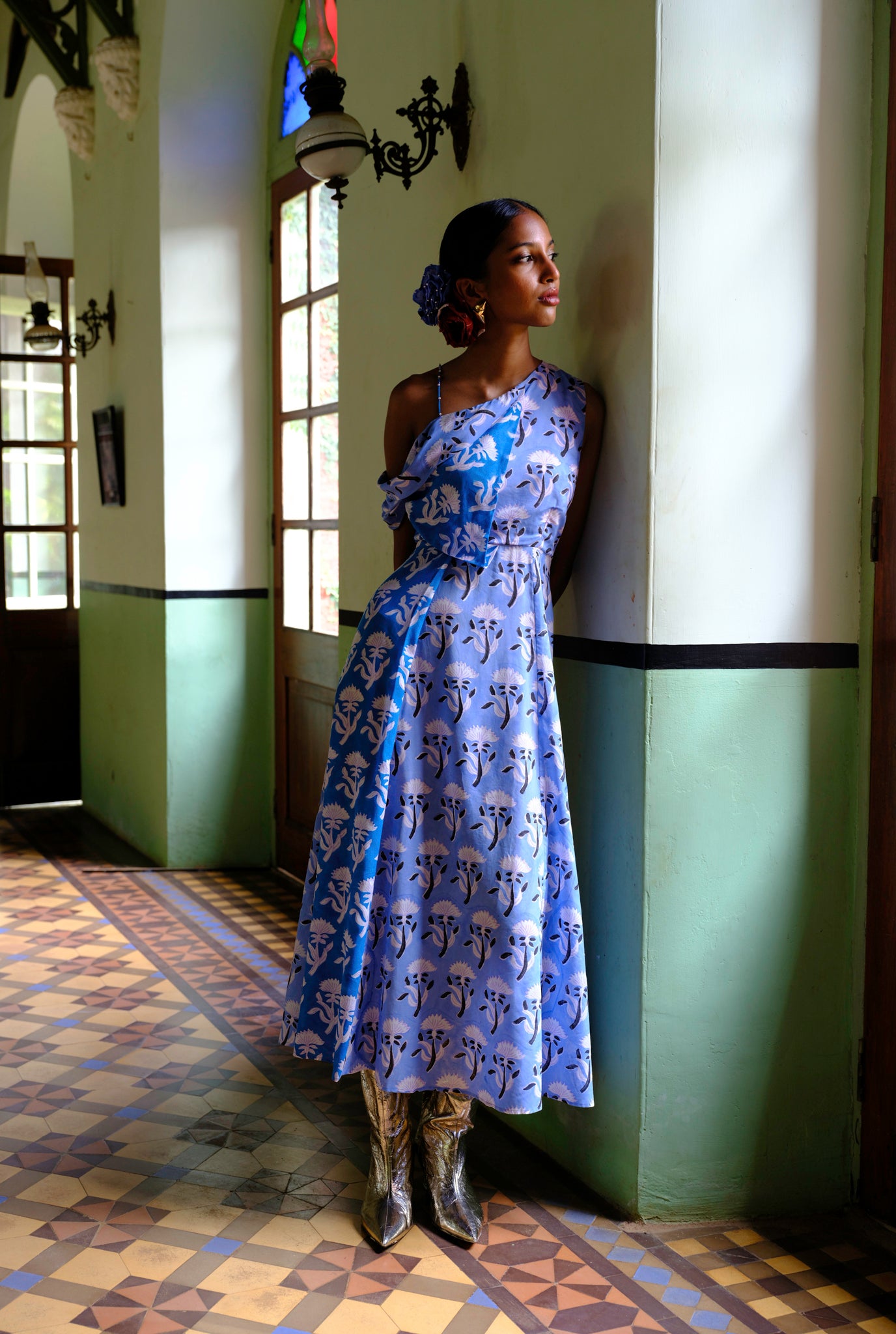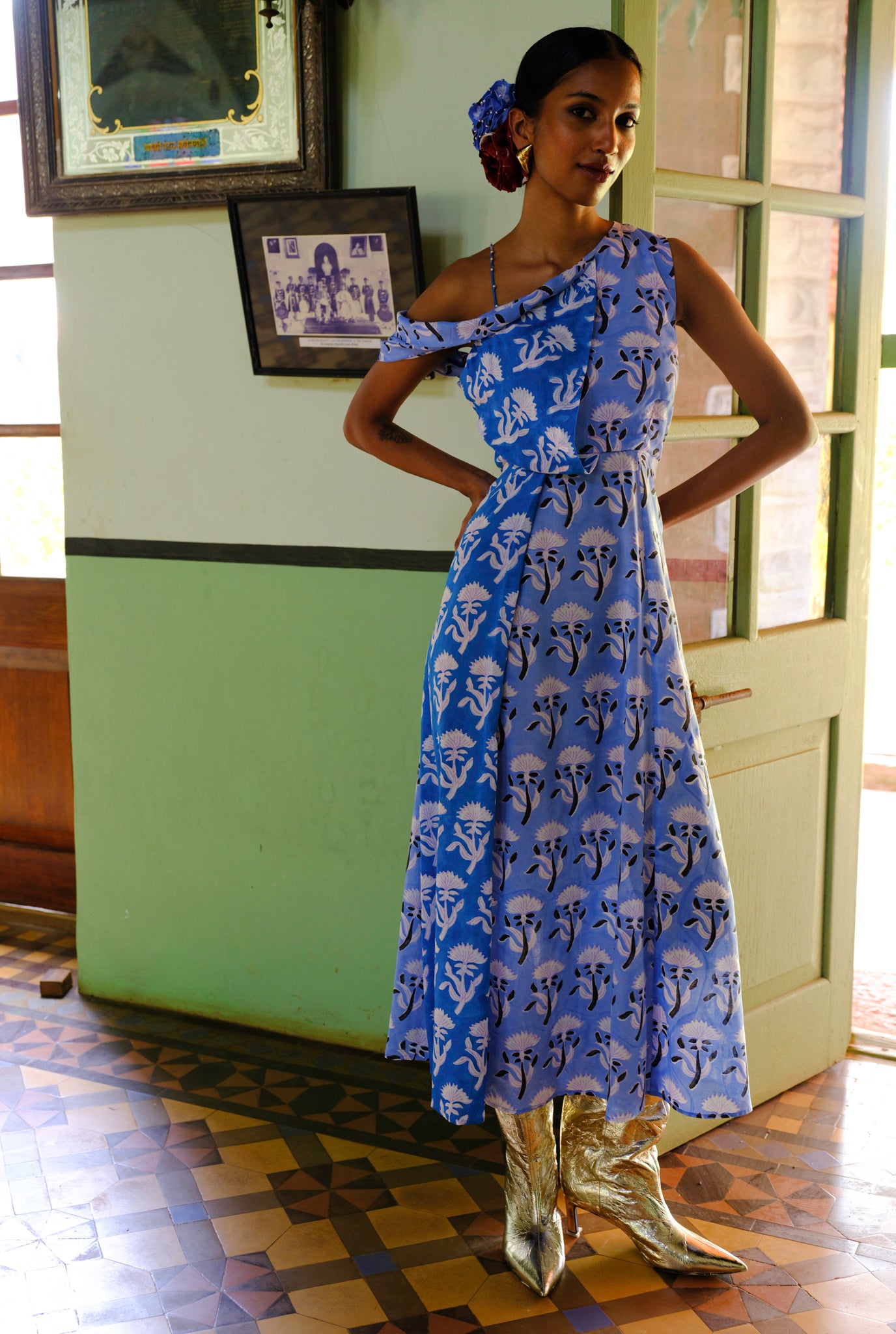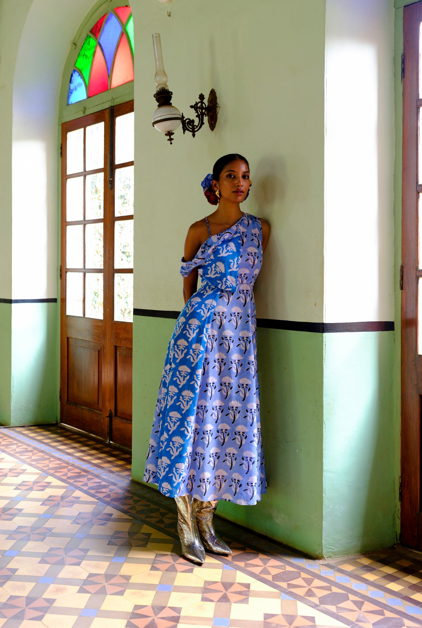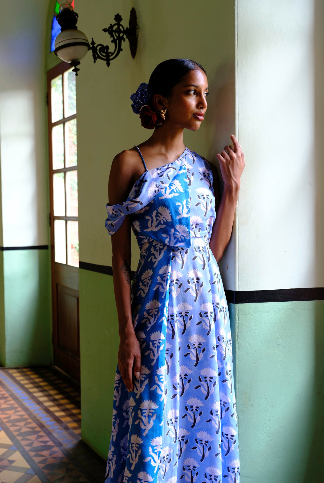 This dress makes a statement with its one shoulder drape, a delicately embroidered strap, paneled bodice and use of fabrics. Crafted in flowy cotton for that easy elegance, this silhouette is a go to for an evening soiree!