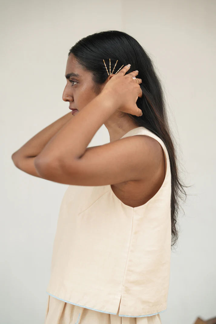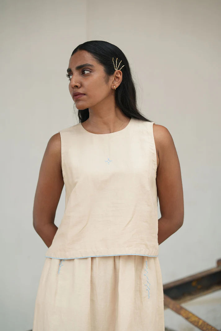 Paired with a sleeveless crop top, the ensemble balances structure and fluidity. The loose fit ensures comfort, while minimal cord embroidery lends a refined, understated charm.