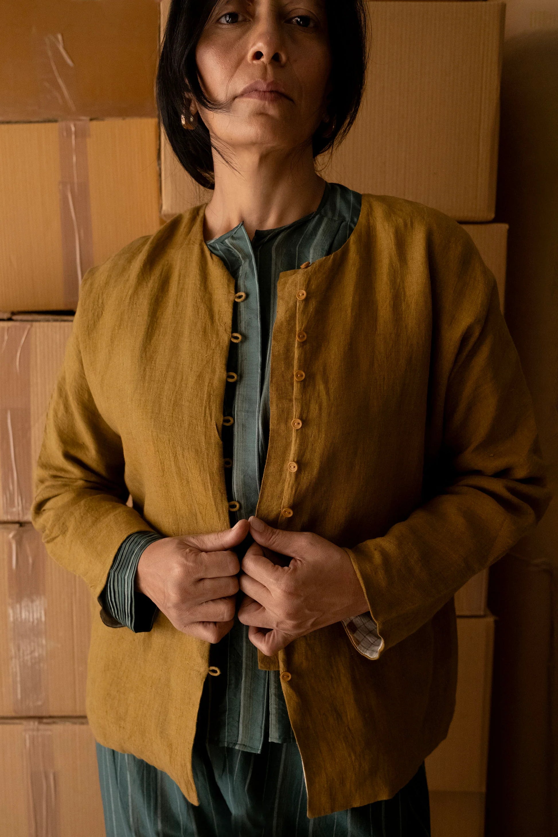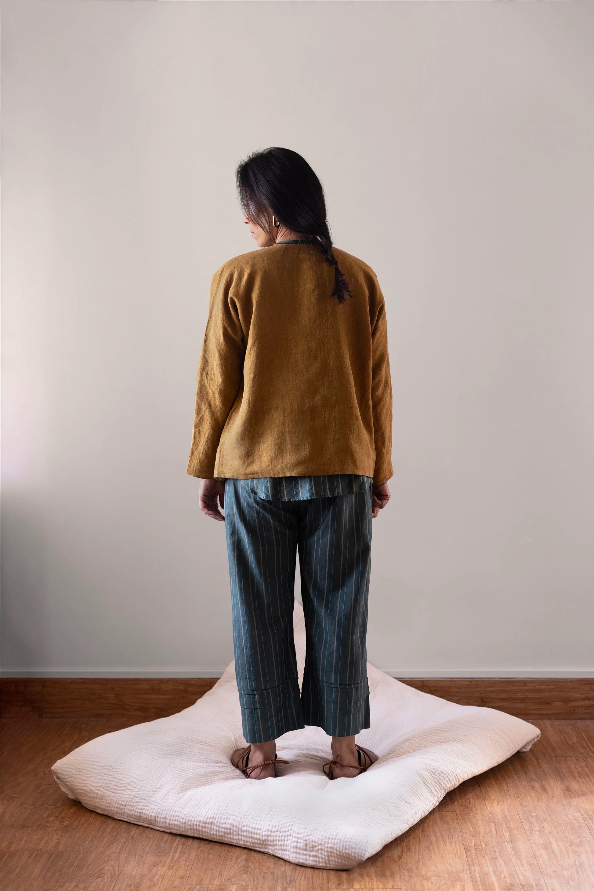 The Bawalia shirt jacket is made with handloom linen woven in West Bengal. The jacket is lined with an 84 count checkered cotton with asymetical aari embroidery. Expertly crafted with handloom linen from West Bengal, the Bawalia shirt jacket brings both quality and style to your wardrobe. The jacket features an 84 count checkered cotton lining, adorned with unique asymmetrical aari embroidery.