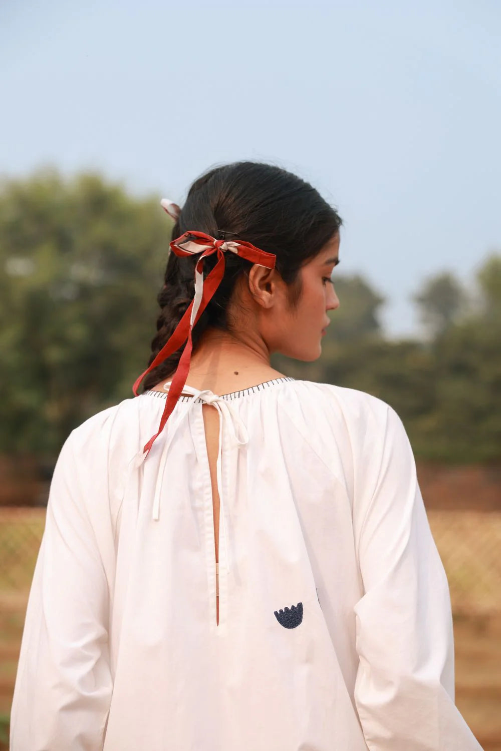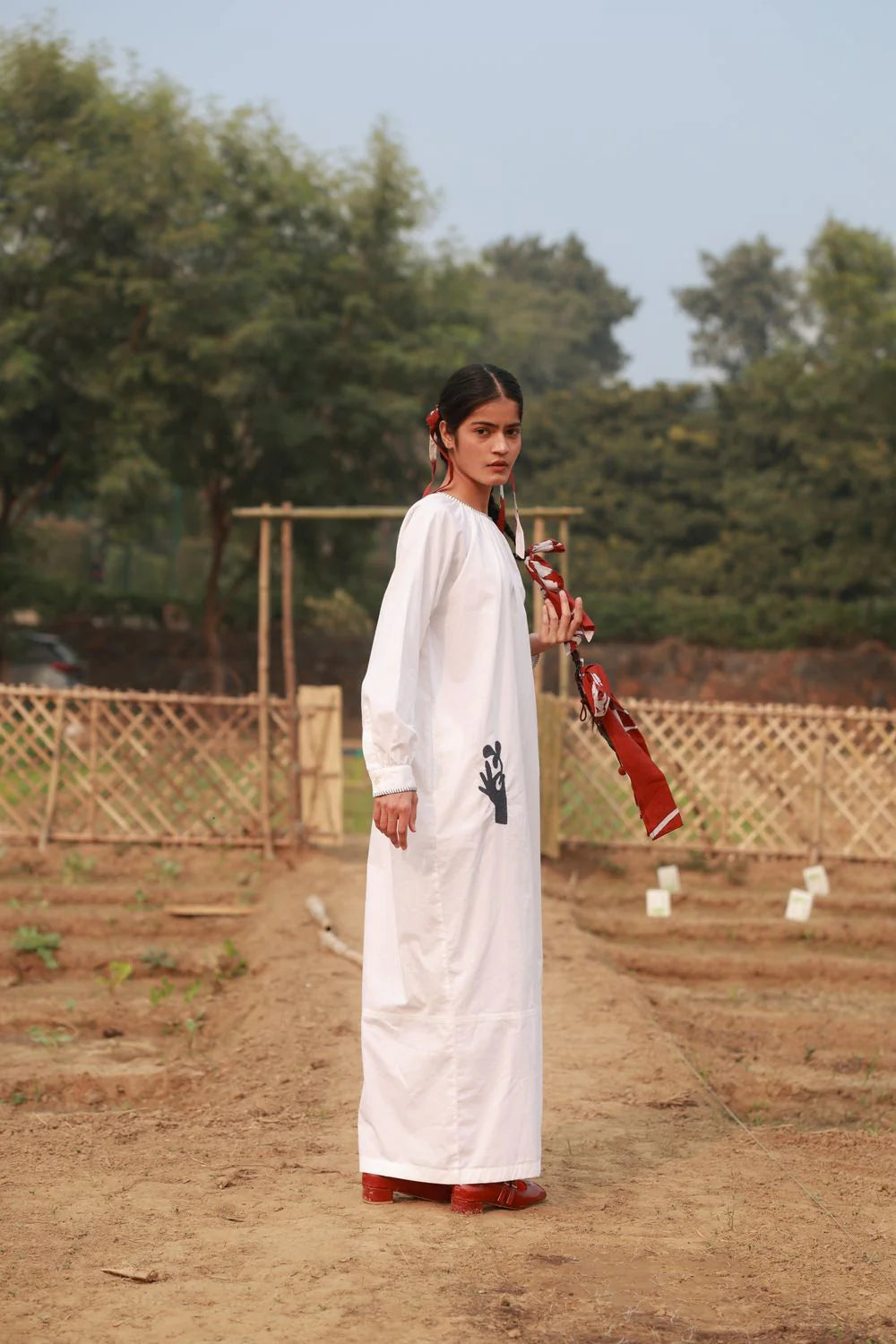 Full length neck gathered dress with little patch work embroidery to mend and repair. The dress has a small side slit to make it comfortable to walk and two inseam pockets. Closure for the neck is a back tie. A fun silhouette to style in many ways.