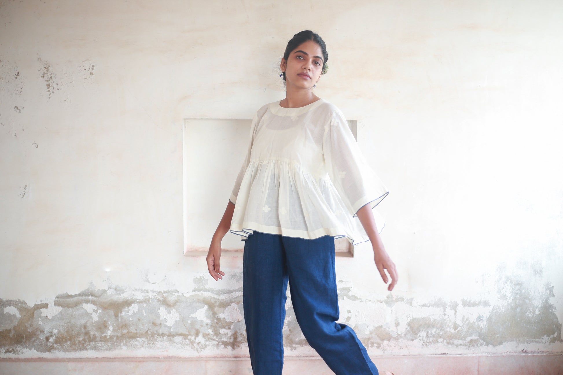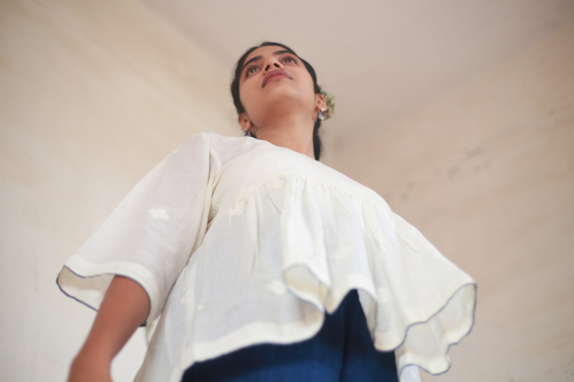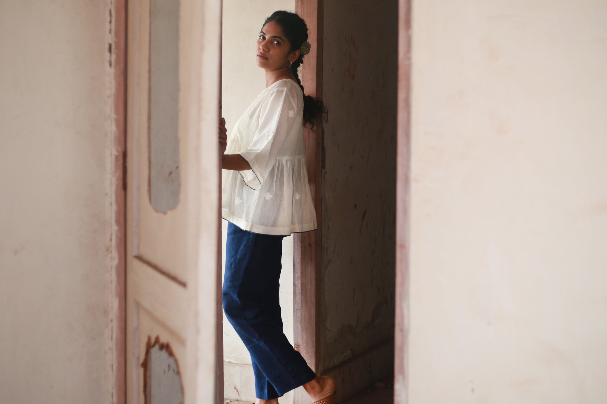 Flared top bearing Jamdani motifs in a floral shape inspired by the tiles of Athangudi; A deep Indigo selvedge making the subtle textile come alive!