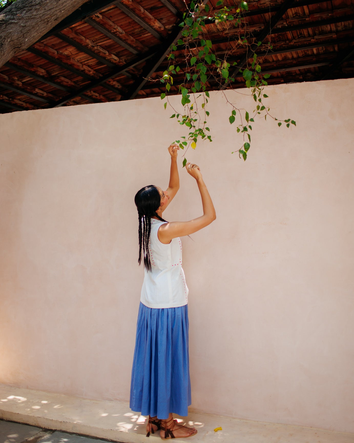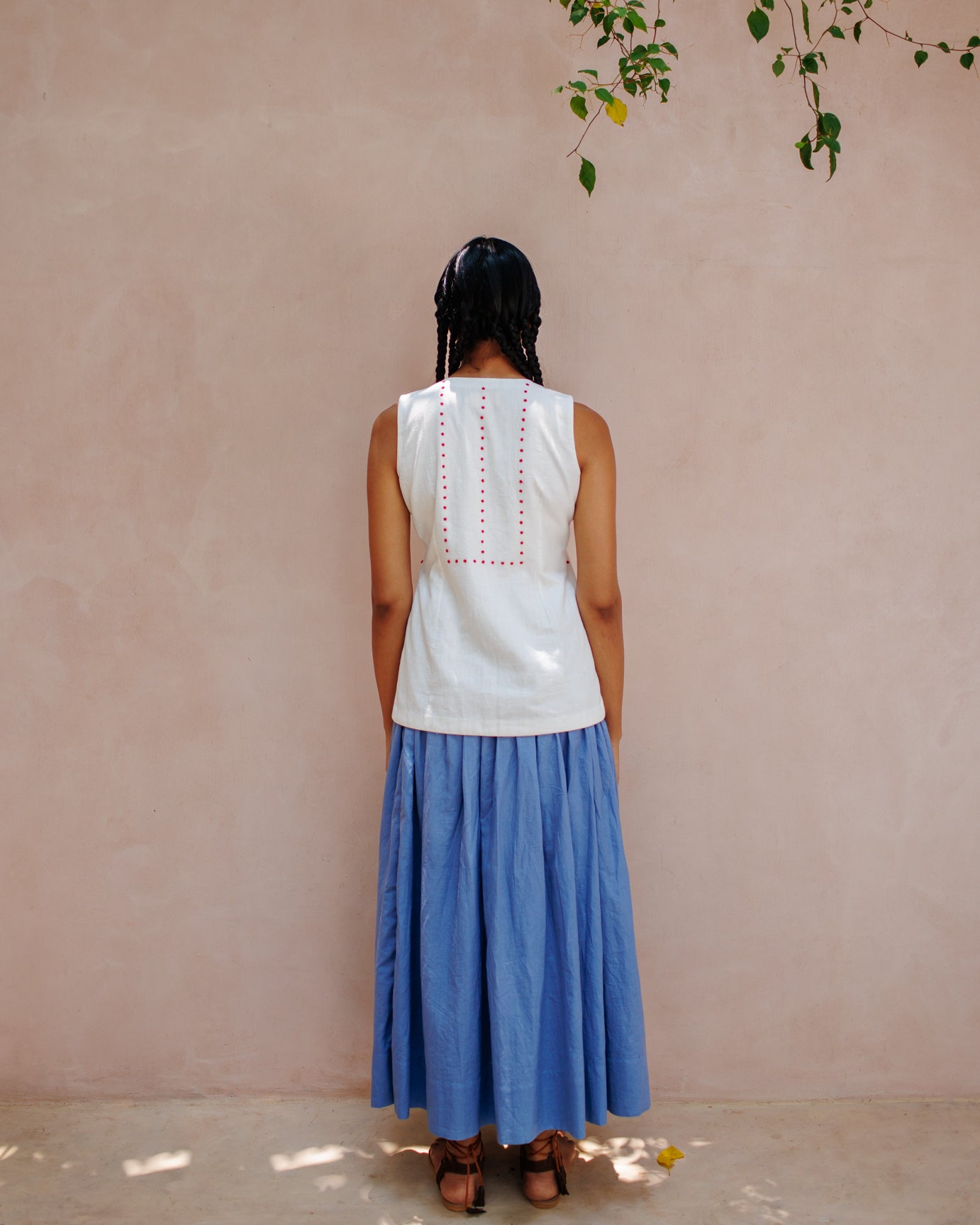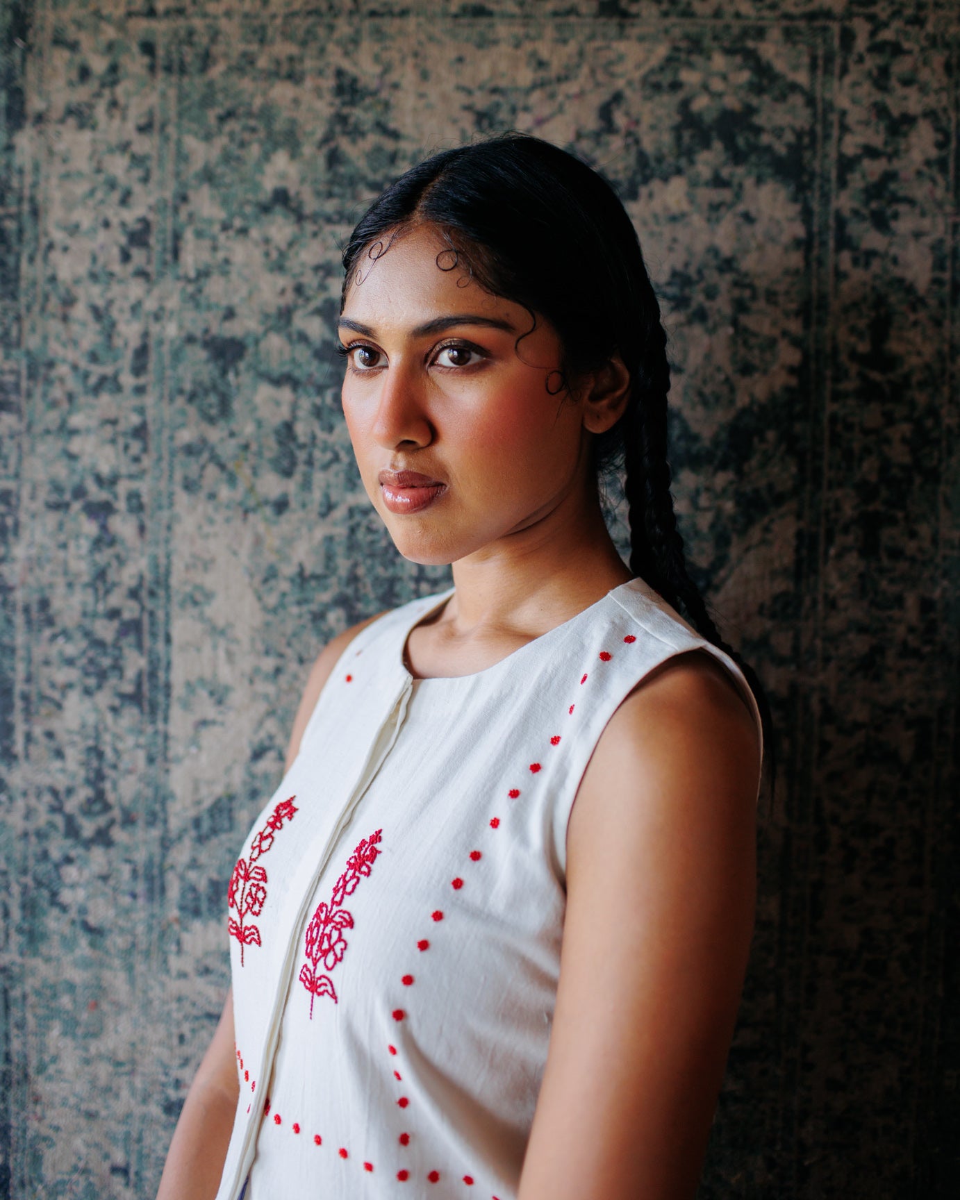 A classic vest made in Handwoven Khadi, hand embroidered using traditional Aari Embroidery along the bodice. Features a crew neckline and a rounded hemline, with a concealed placket.