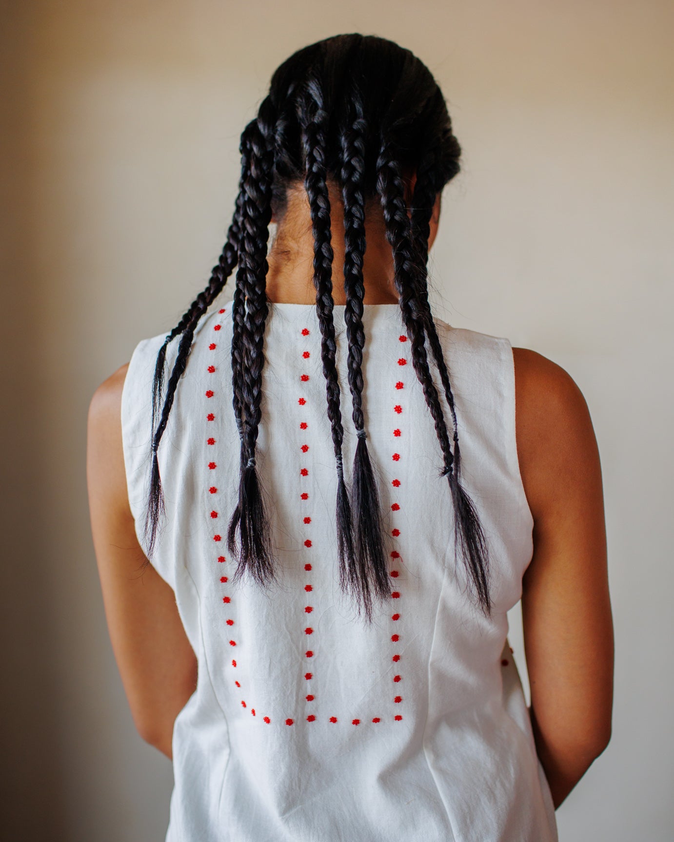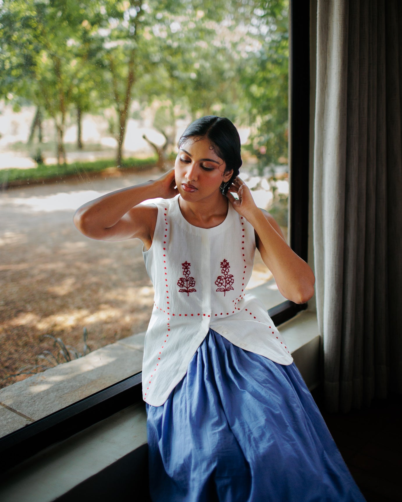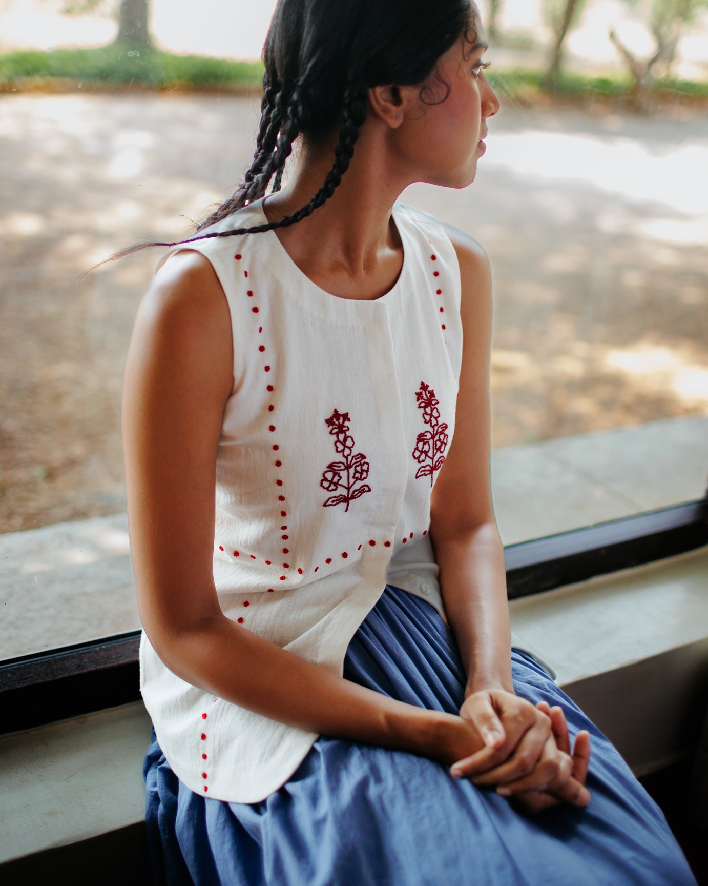 A classic vest made in Handwoven Khadi, hand embroidered using traditional Aari Embroidery along the bodice. Features a crew neckline and a rounded hemline, with a concealed placket.