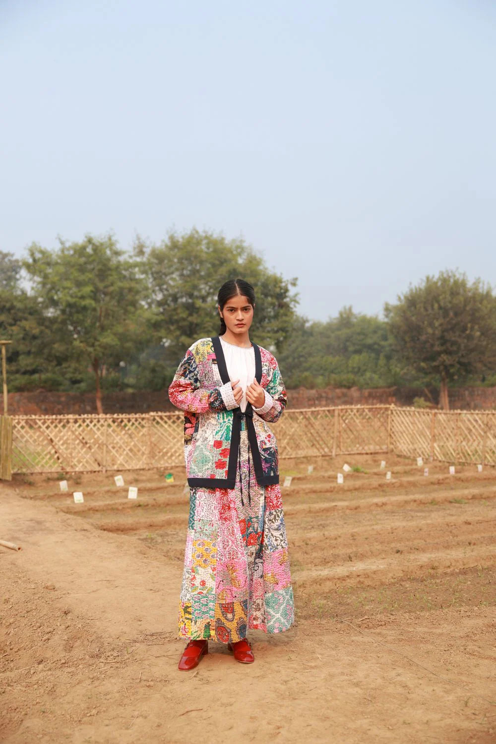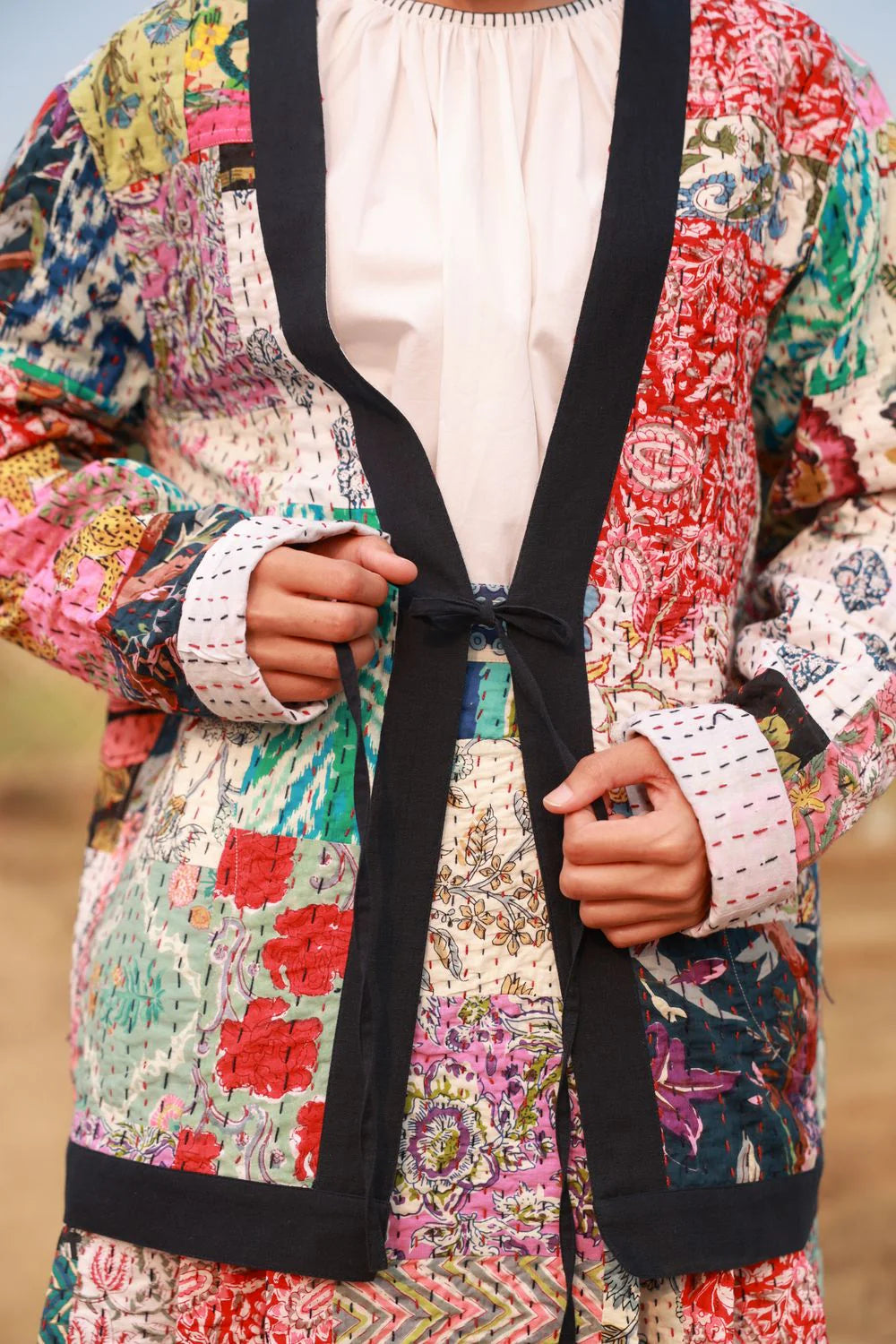 A stunning Kantha patchwork unisex jacket designed in an open-front silhouette with tie-up closures. This hip-length piece features vibrant hand-stitched patterns and a mix of colors, making it a statement layer for any outfit. The contrast trim adds a refined touch to this artisanal creation.