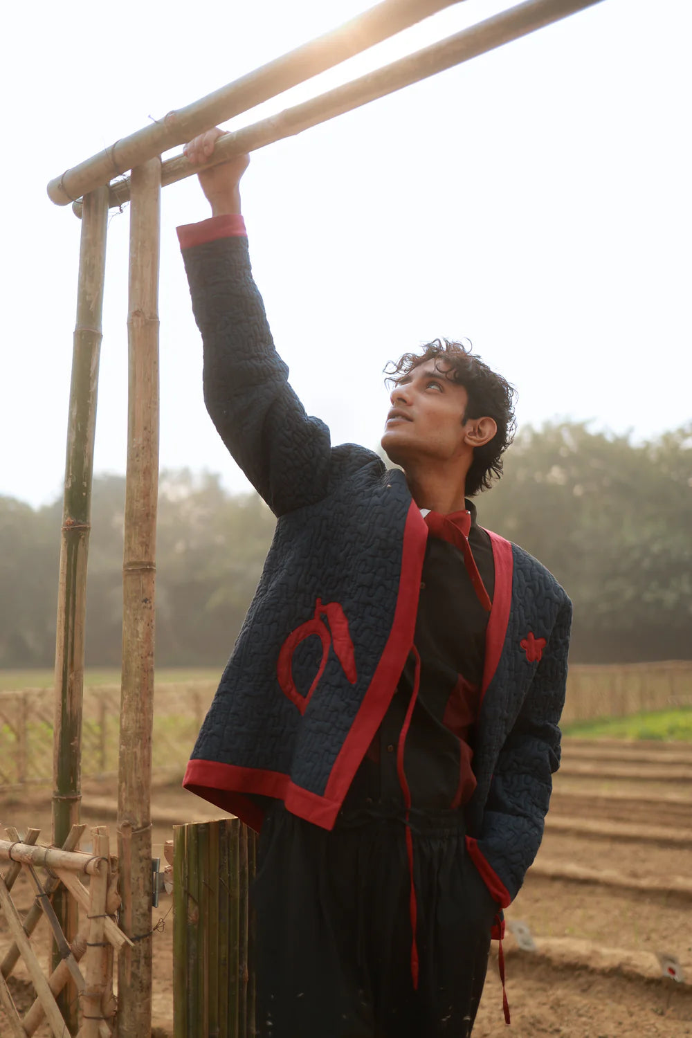 Elevate your layering game with this elegant quilted unisex jacket featuring bold red appliqué motifs with a tie-up front. The open-front silhouette with contrast red trims adds sophistication, making it a versatile piece for both casual and formal styling.