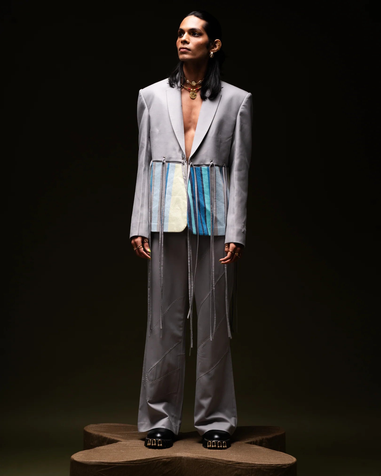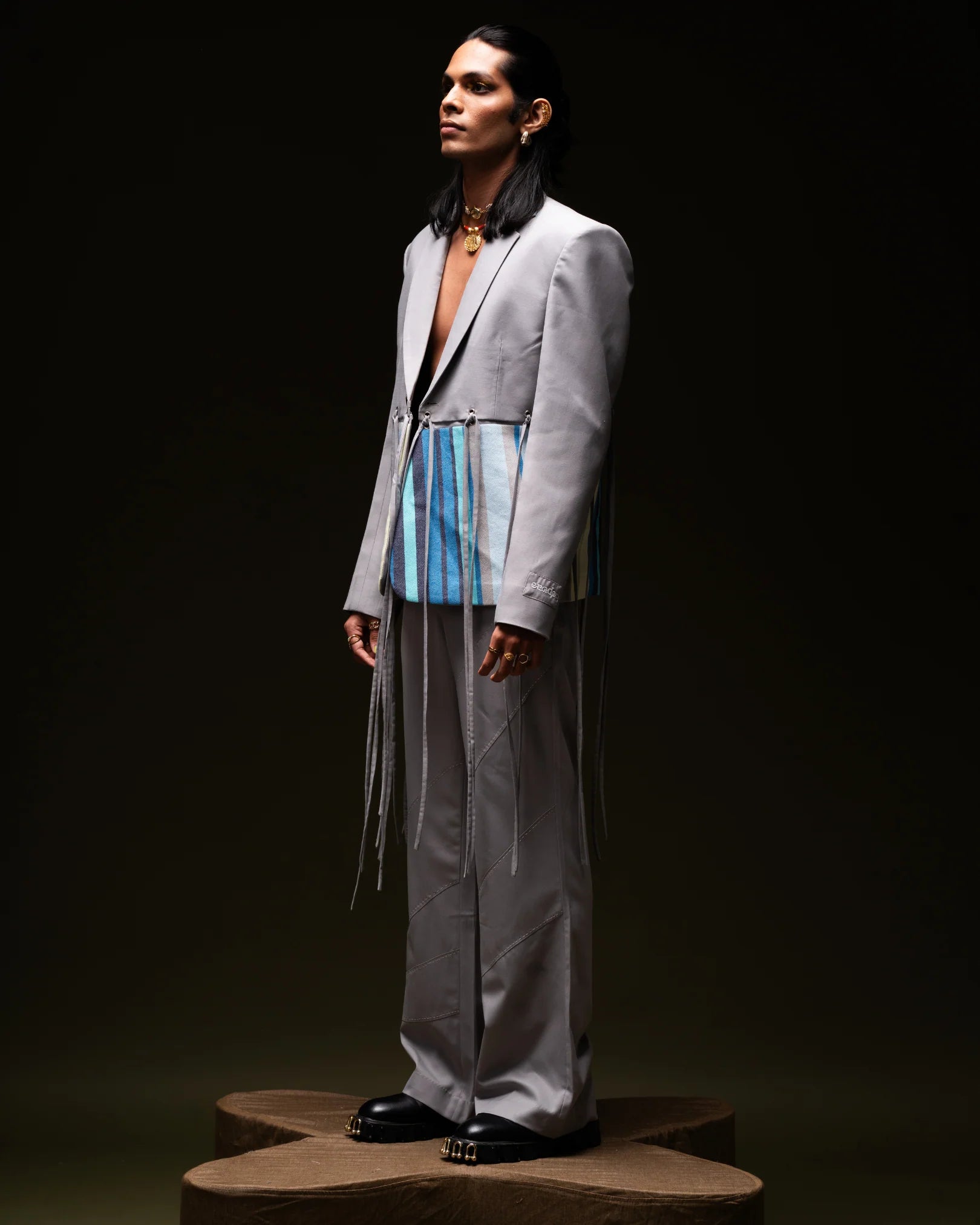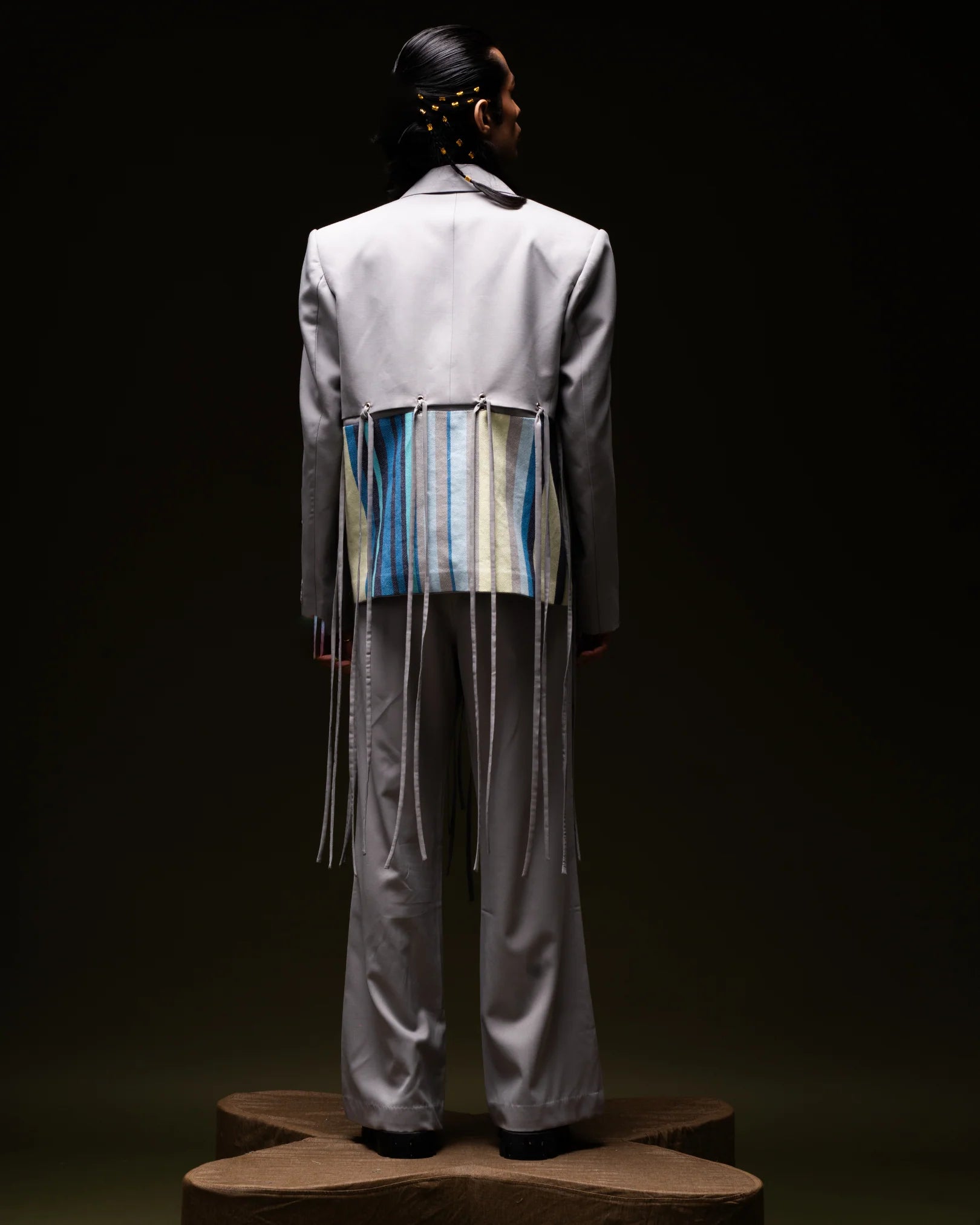 Axis: Happening Again is a striking reversible blazer combining grey crepe and Jamakkalam fabric for a bold contrast. The deconstructed top-notch collar, adorned with a unique motif on the right, enhances its avant-garde design. Featuring a printed viscose lining and meticulously placed ties that hold the top and bottom halves together, the blazer offers versatile styling options. The ties and button closure ensure a secure fit, making this piece both functional and fashion-forward.