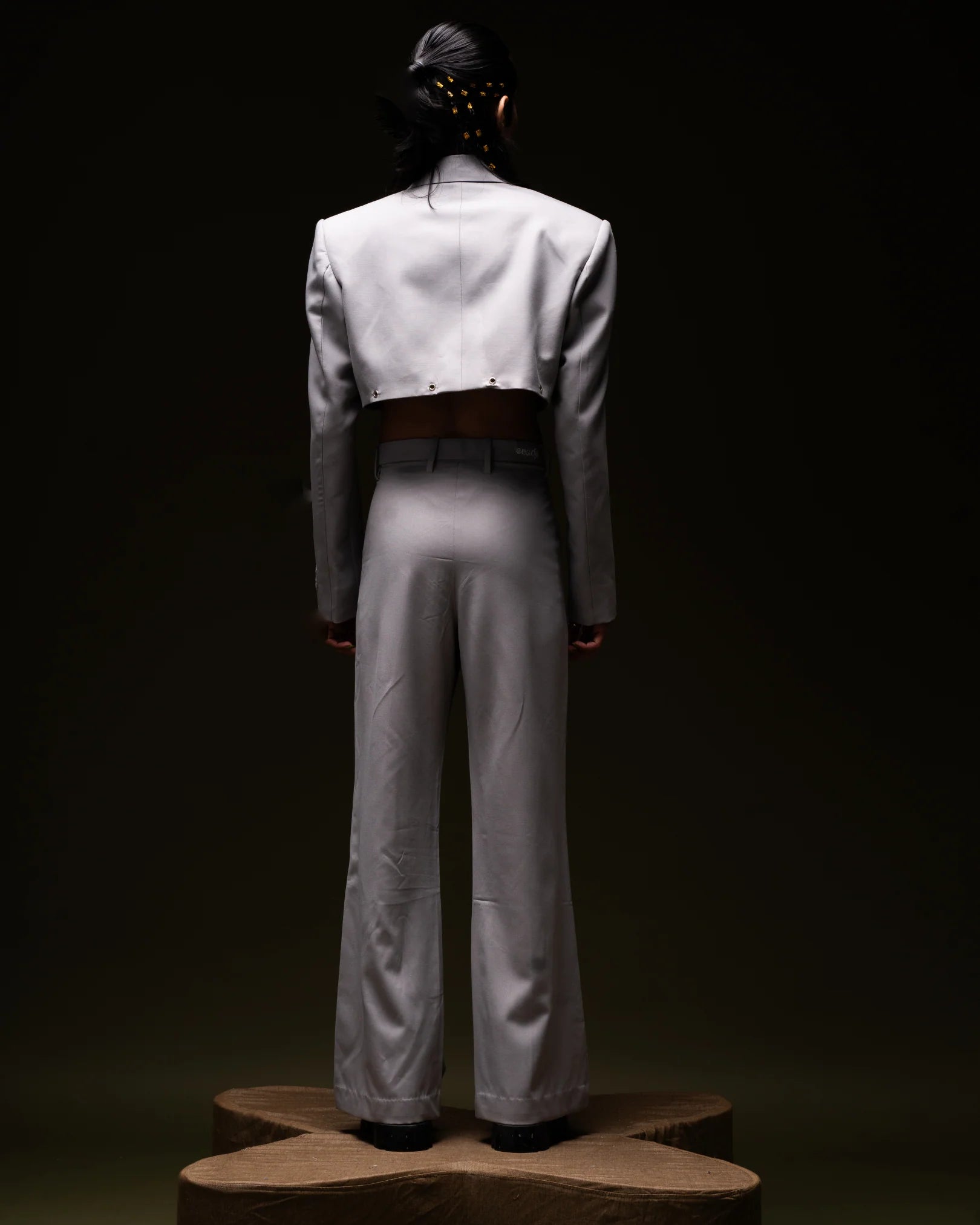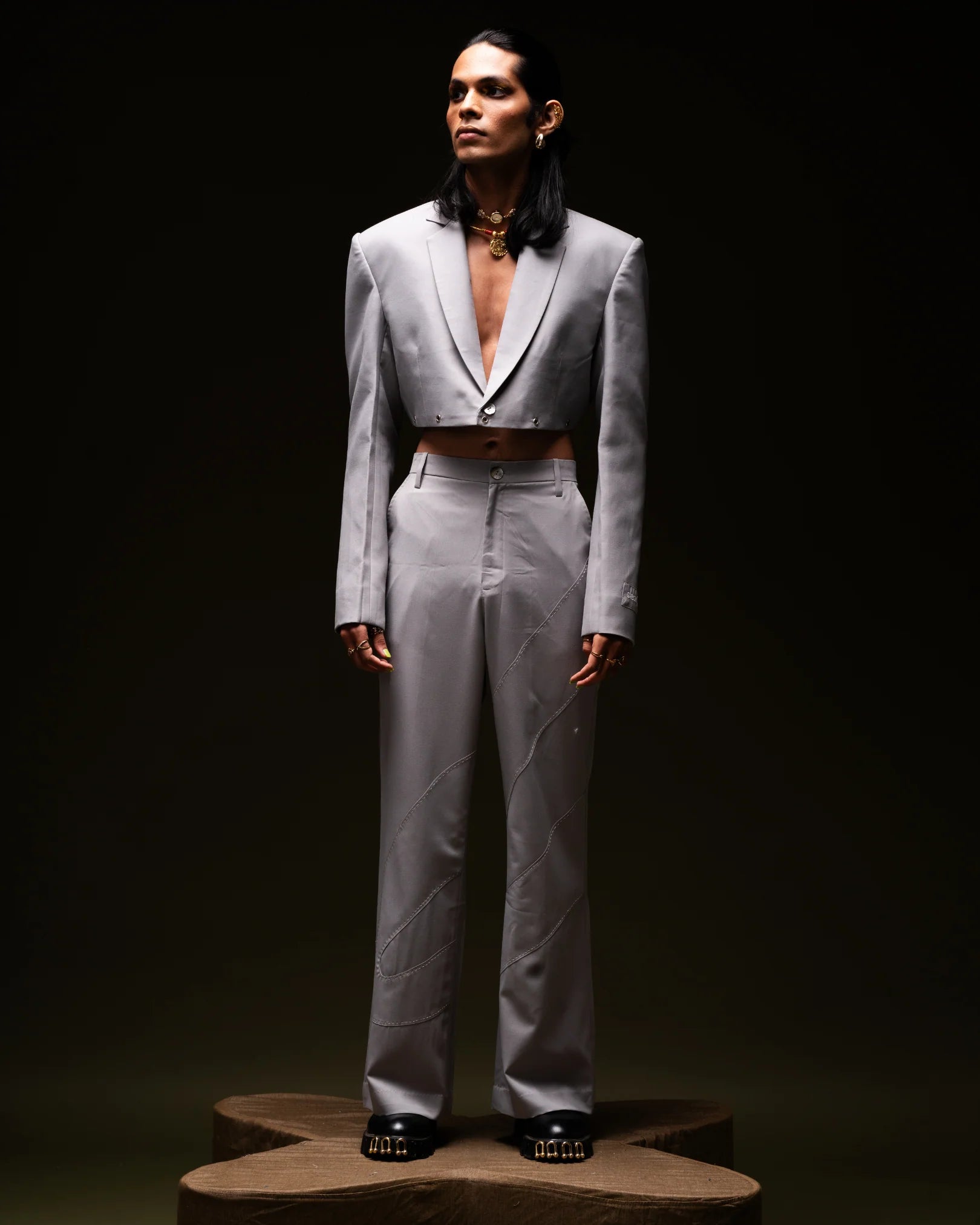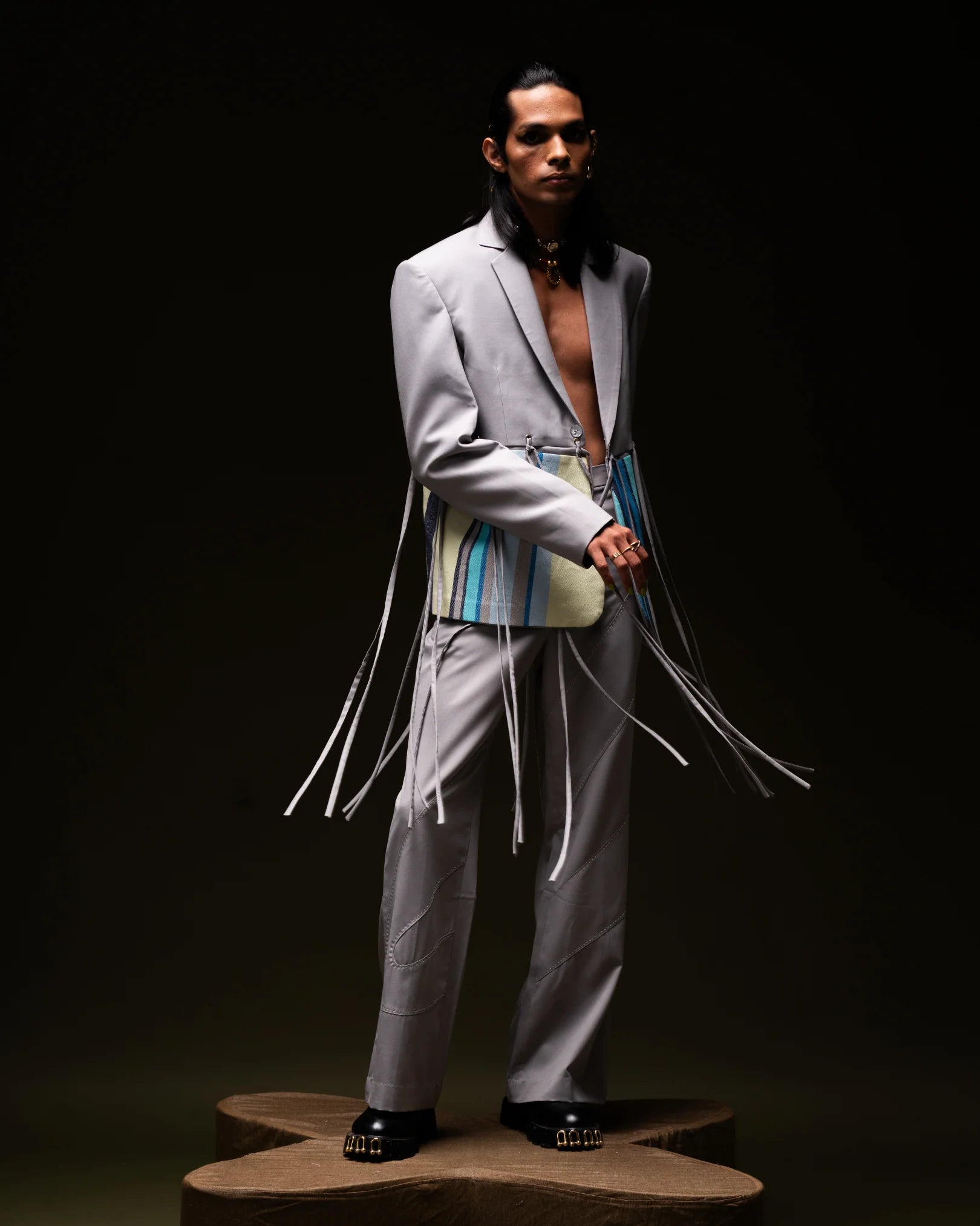 Axis: Happening Again is a striking reversible blazer combining grey crepe and Jamakkalam fabric for a bold contrast. The deconstructed top-notch collar, adorned with a unique motif on the right, enhances its avant-garde design. Featuring a printed viscose lining and meticulously placed ties that hold the top and bottom halves together, the blazer offers versatile styling options. The ties and button closure ensure a secure fit, making this piece both functional and fashion-forward.