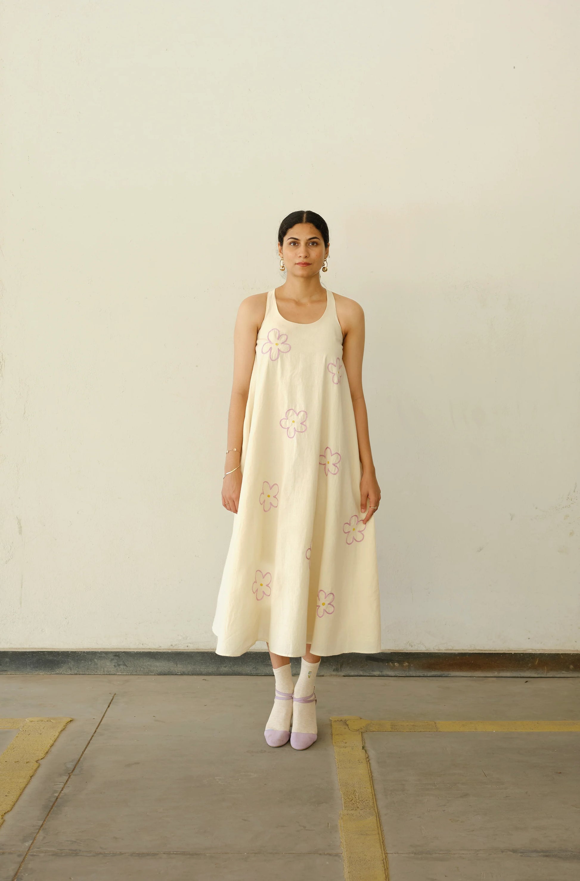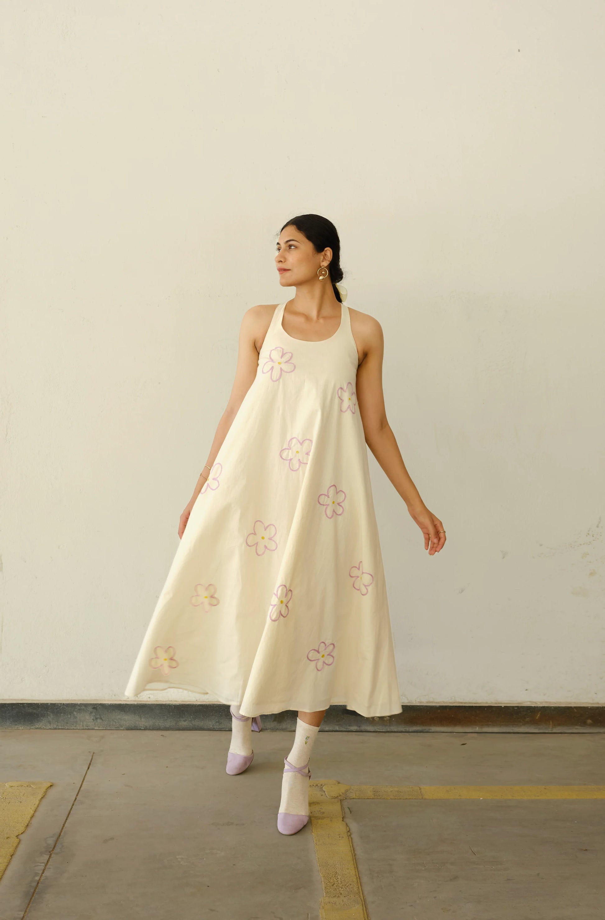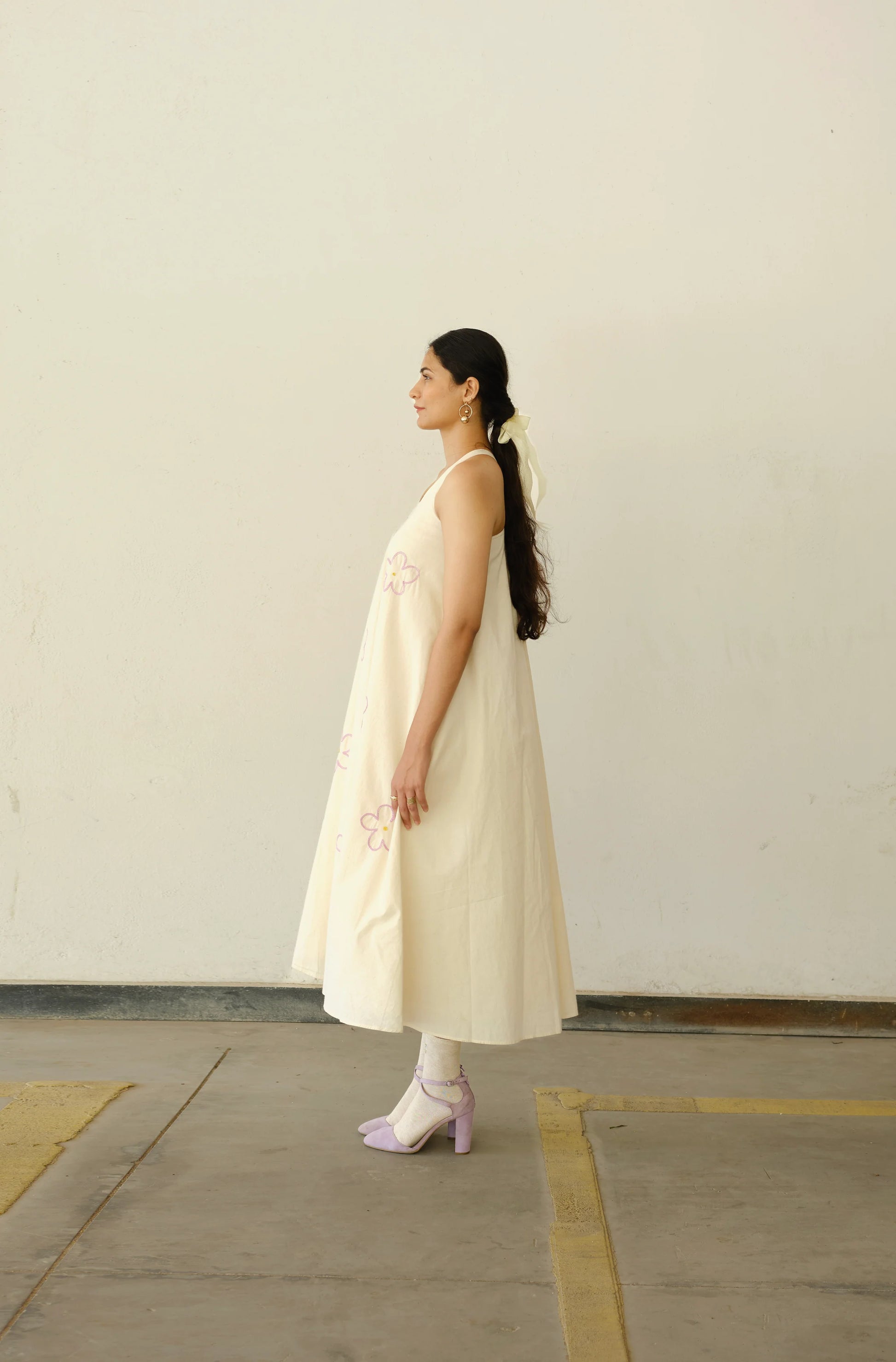 The perfect summer dress, with cross strap back and flared silhoutte. It is also adorned with the beautiful hand embroidered motifs.