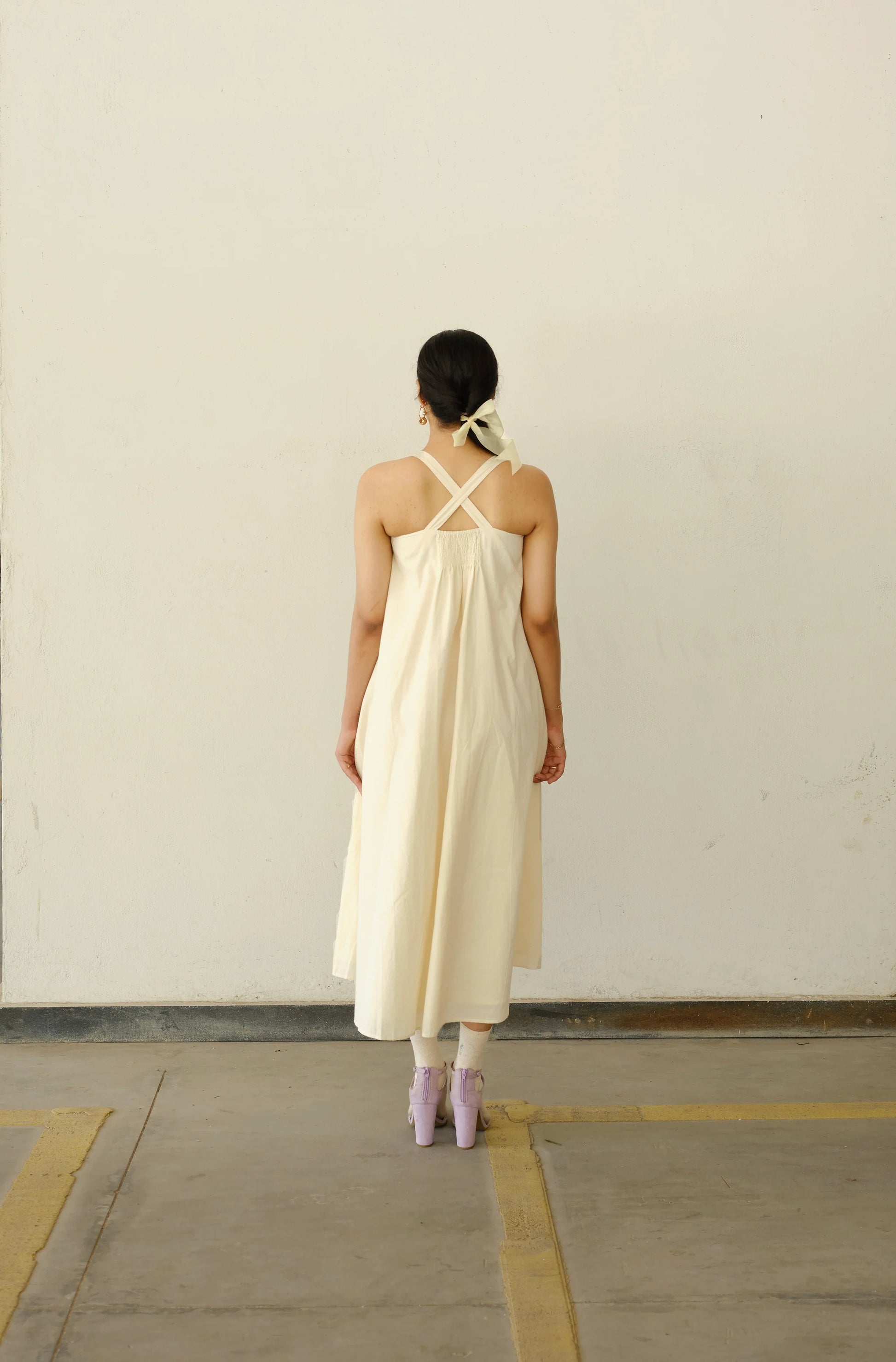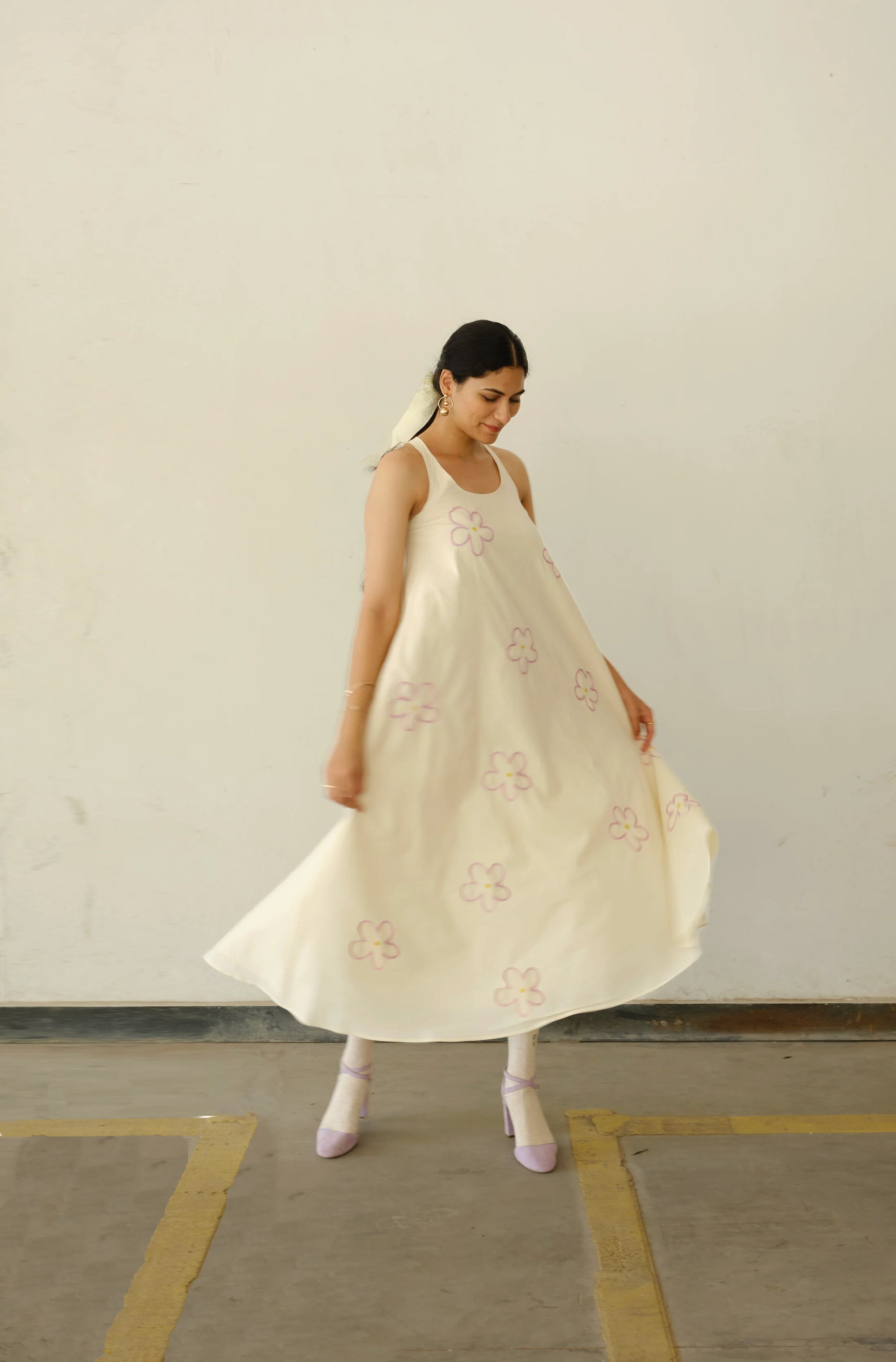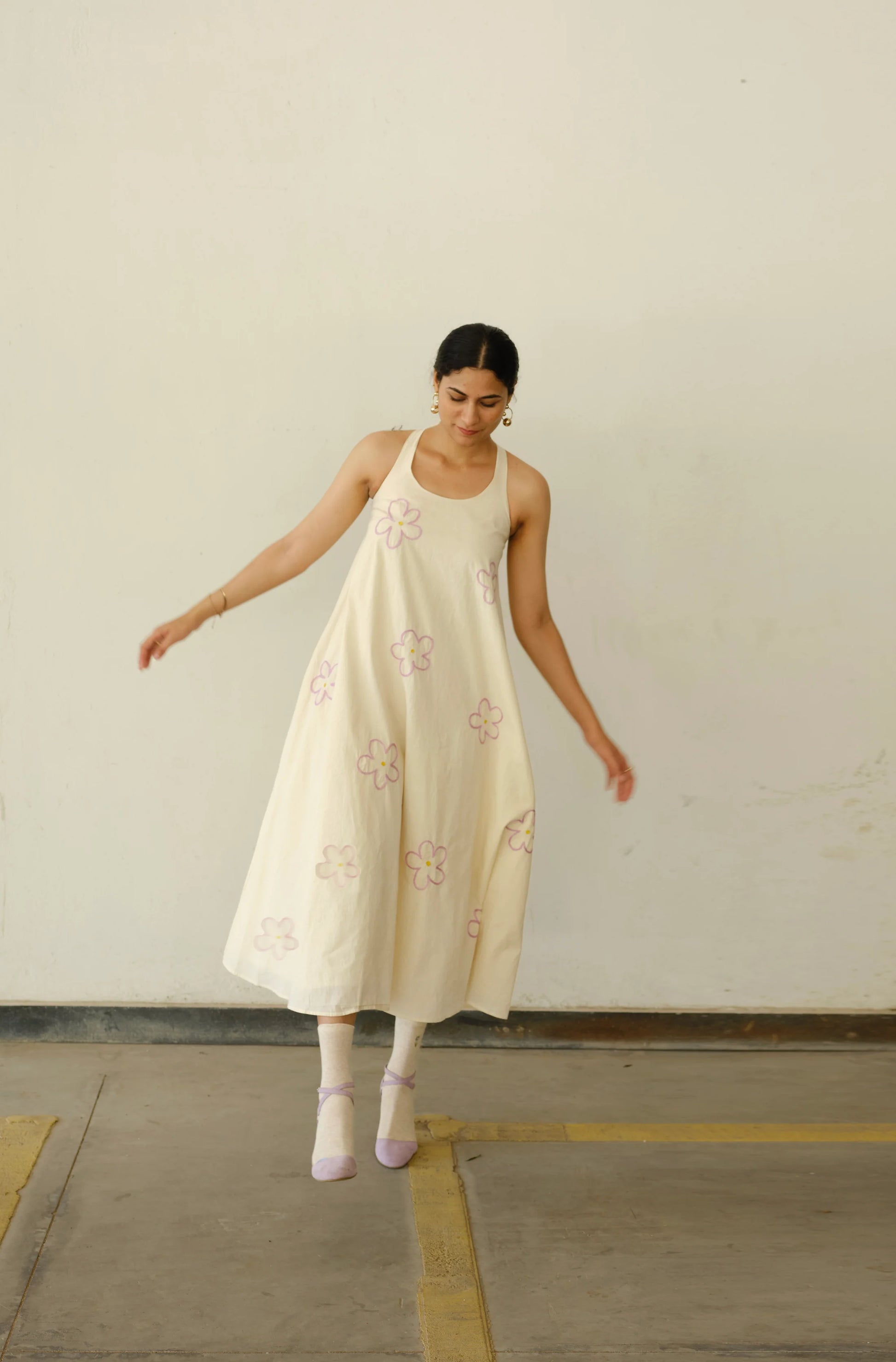 The perfect summer dress, with cross strap back and flared silhoutte. It is also adorned with the beautiful hand embroidered motifs.