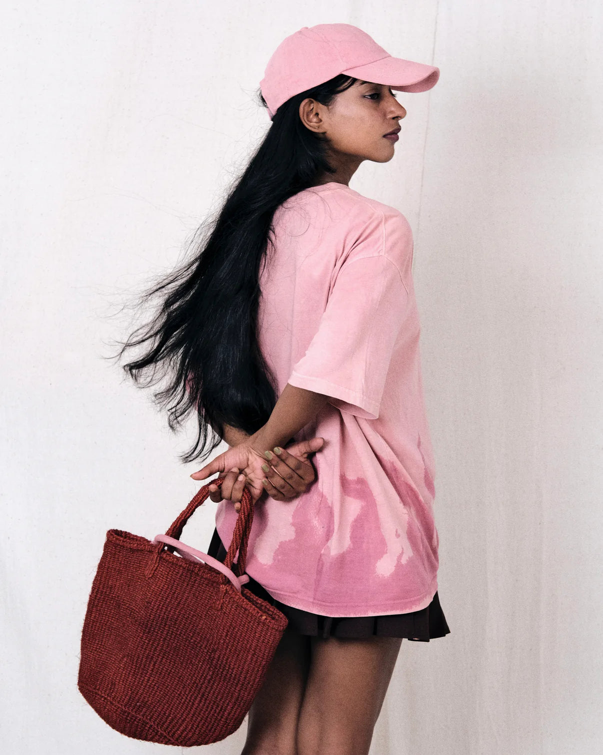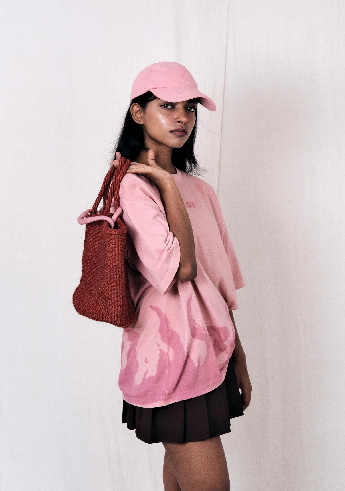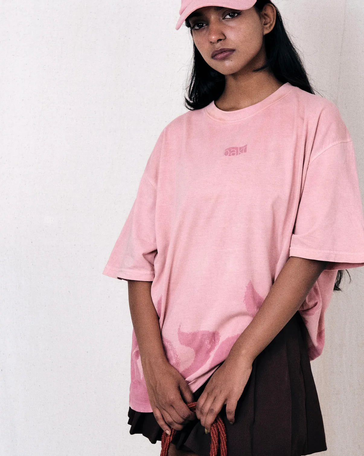 Bakr's oversized t-shirt "Flame" in the shade "PEACH PINK" is hand- dyed in Madder roots, which is later hand-printed in a natural Lac.