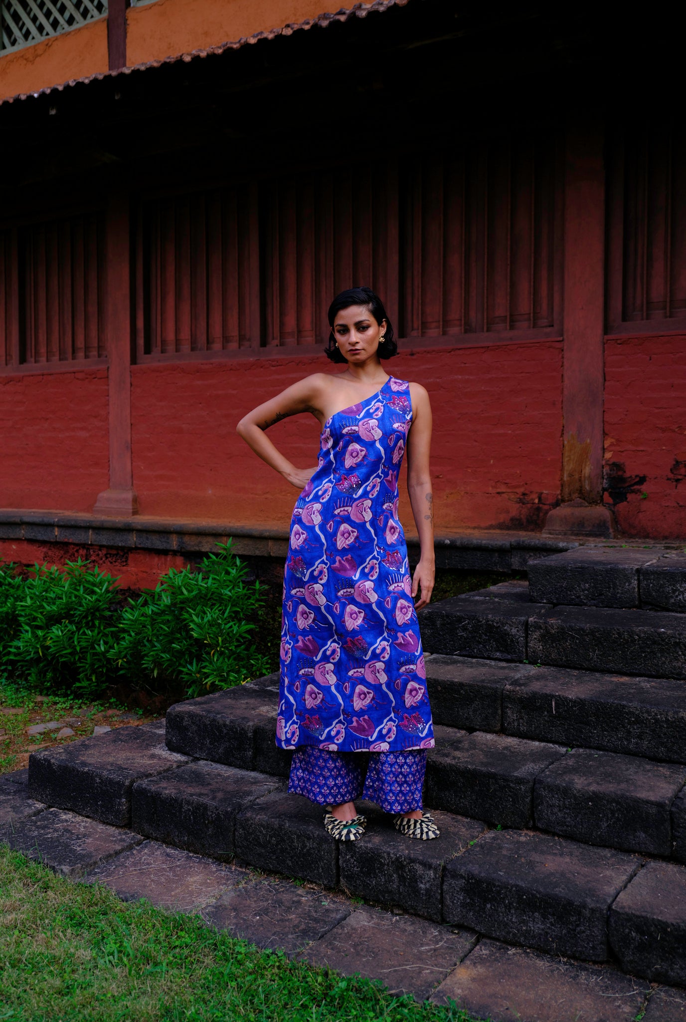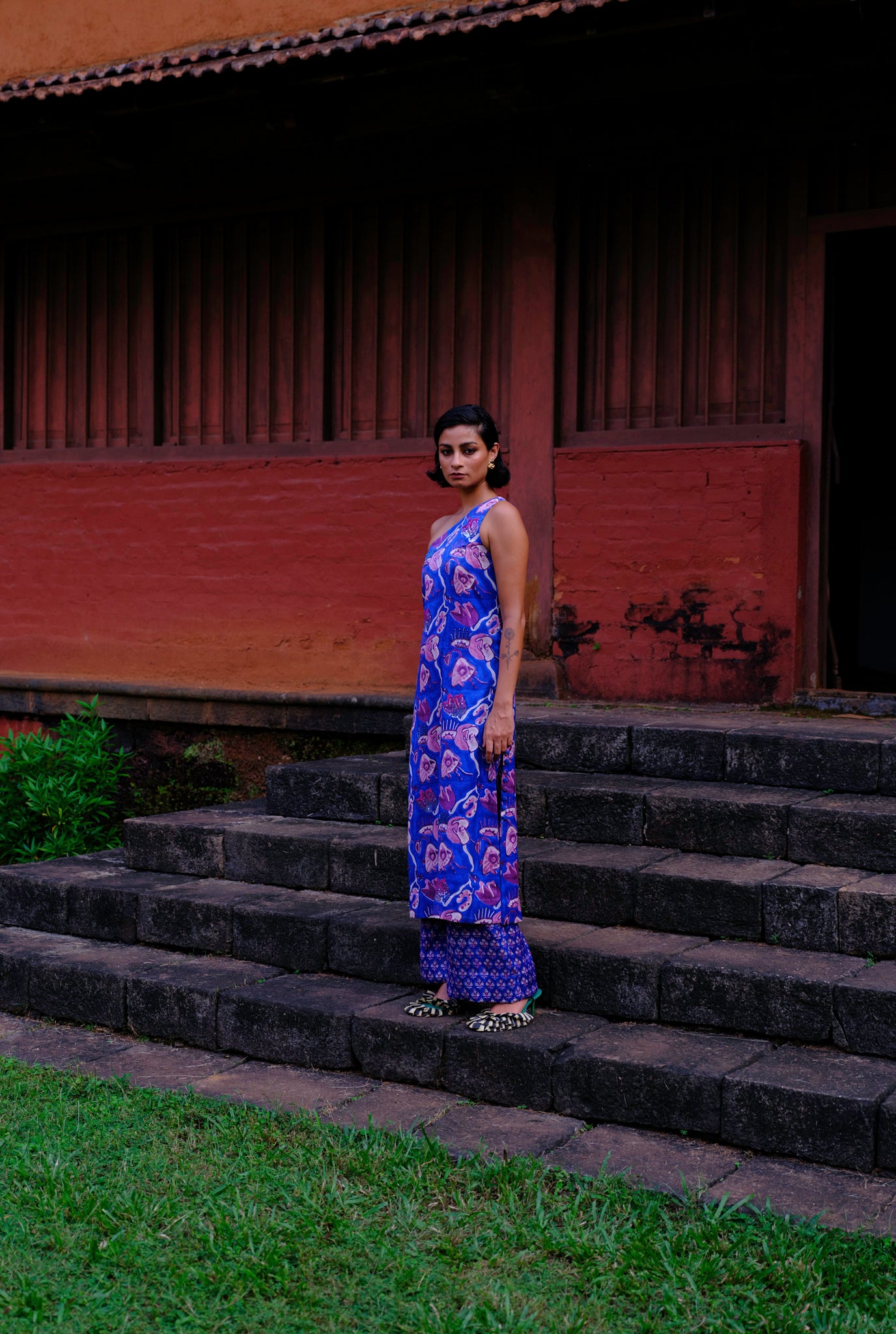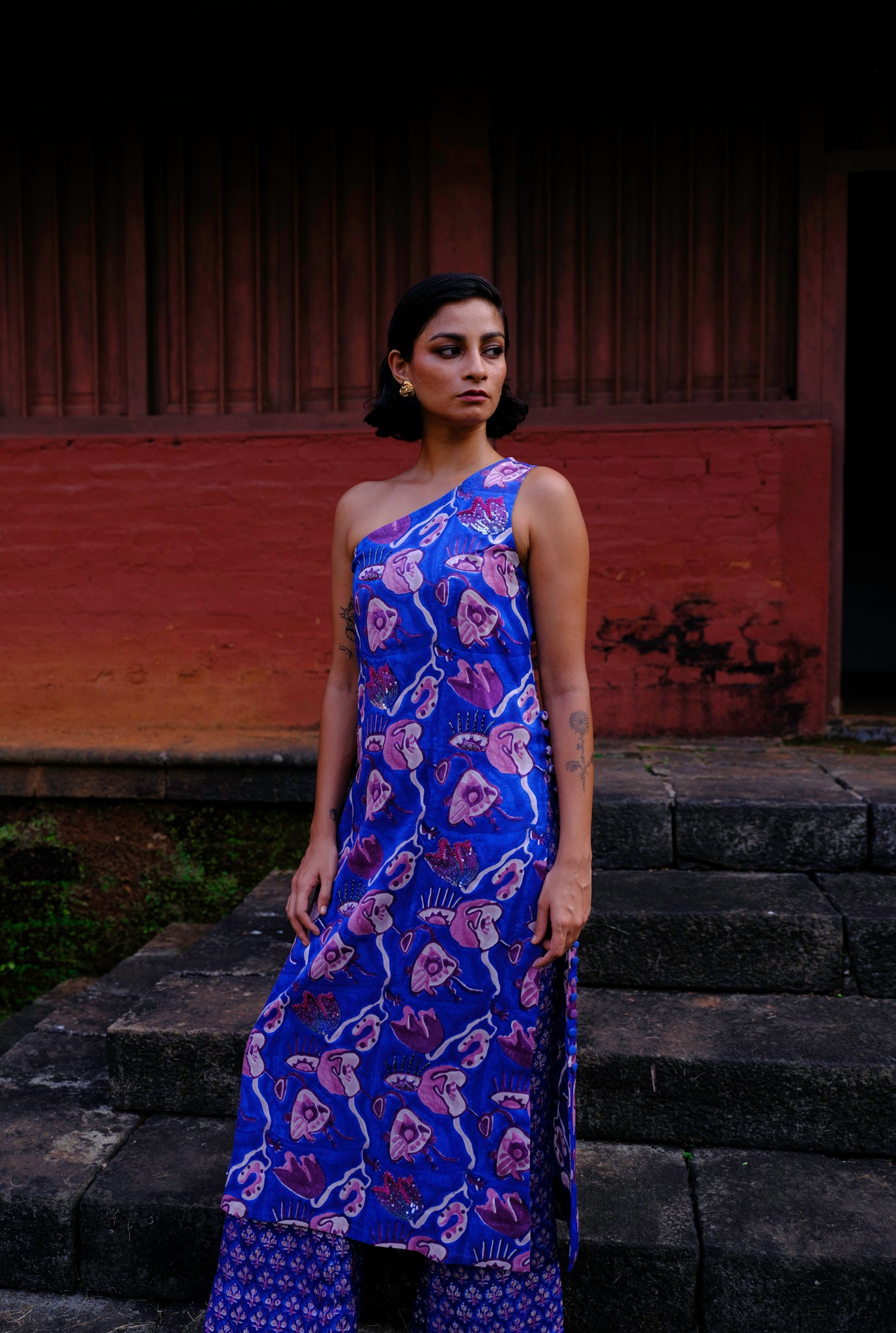 Escape from traditional festive wear in our contemporary kurta set. It’s crafted in Mashru silk, hand blocked printed in floral motifs. It features a one shoulder design with delicate hand embroidery highlights. Completes the ensemble with fine hand-block printed wide leg trousers. Wear it with barely-there sandals and a statement clutch.