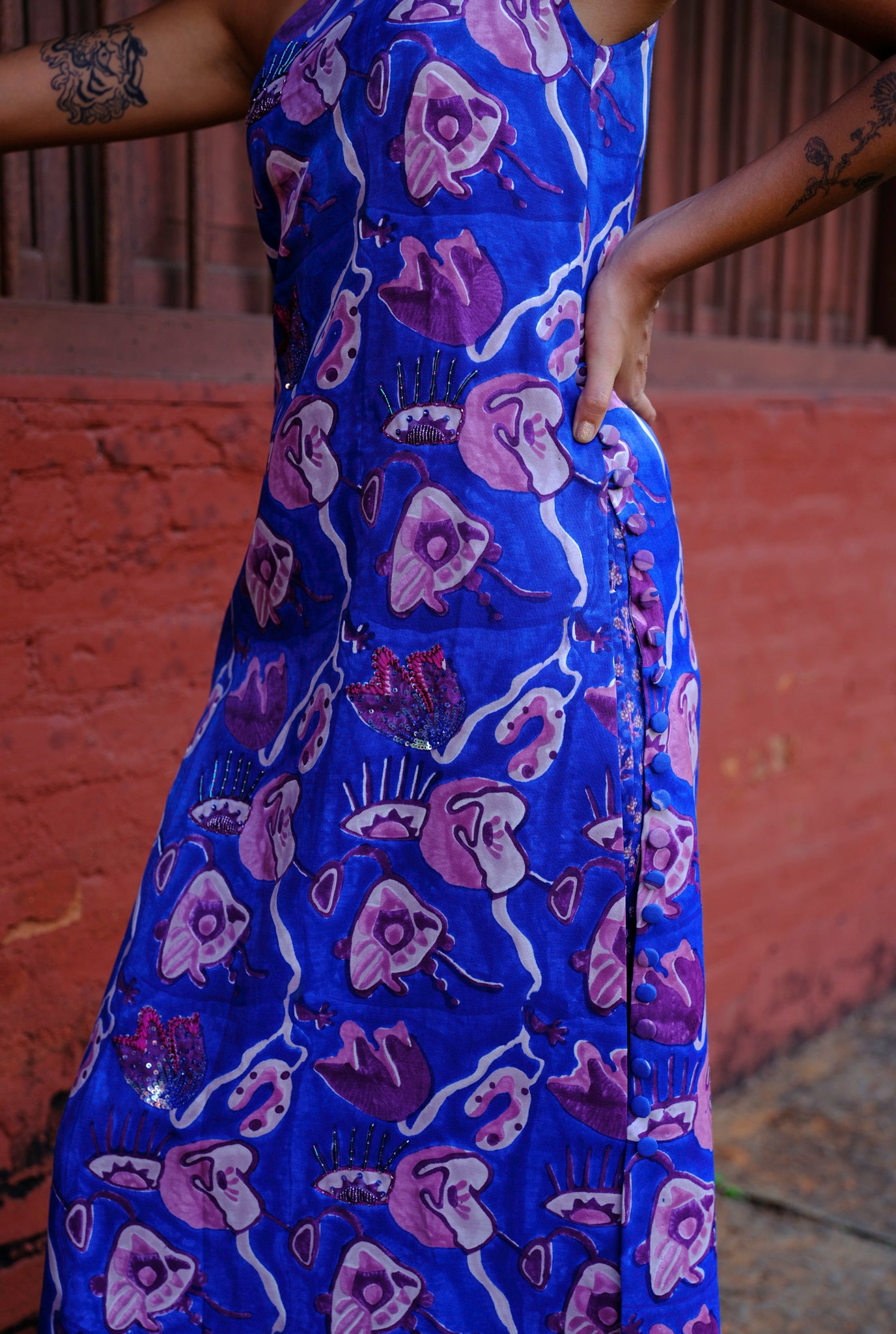 5.5 meters of Mashru silk sourced from Gujarat has been used for this piece. Hand-block printed in Jaipur. Hand embroidered and manufactured at a workshop in Pune, India. This product is crafted in Jaipur, India using the traditional artisan technique of hand-block printing, and is hand embroidered by our skilled artisans in Pune. Subtle variations in patterns are natural to this process.