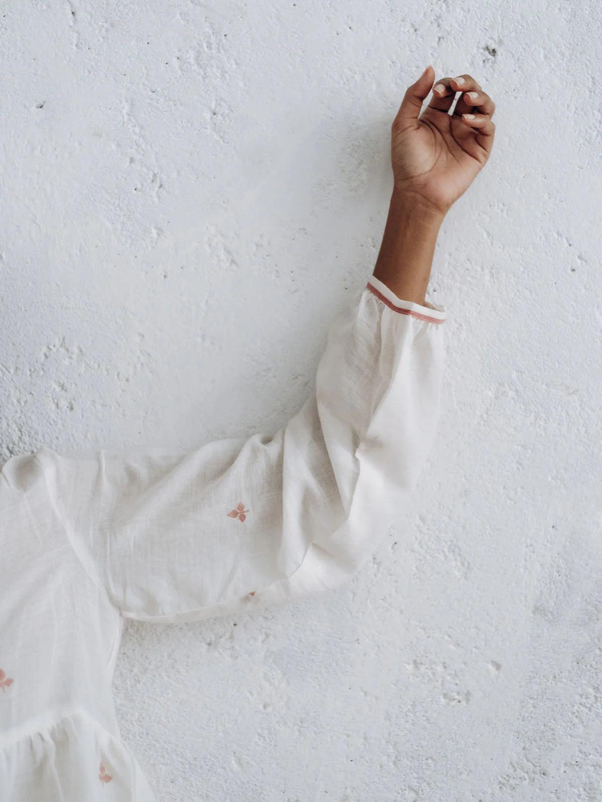 Full sleeves top with soft gathers at the waist, button closure at the back. Selvedge details along the hem of the top and the sleeves. The garment features Bel patra motifs, made using the Jamdani technique, in a dusty red derived from madder root.