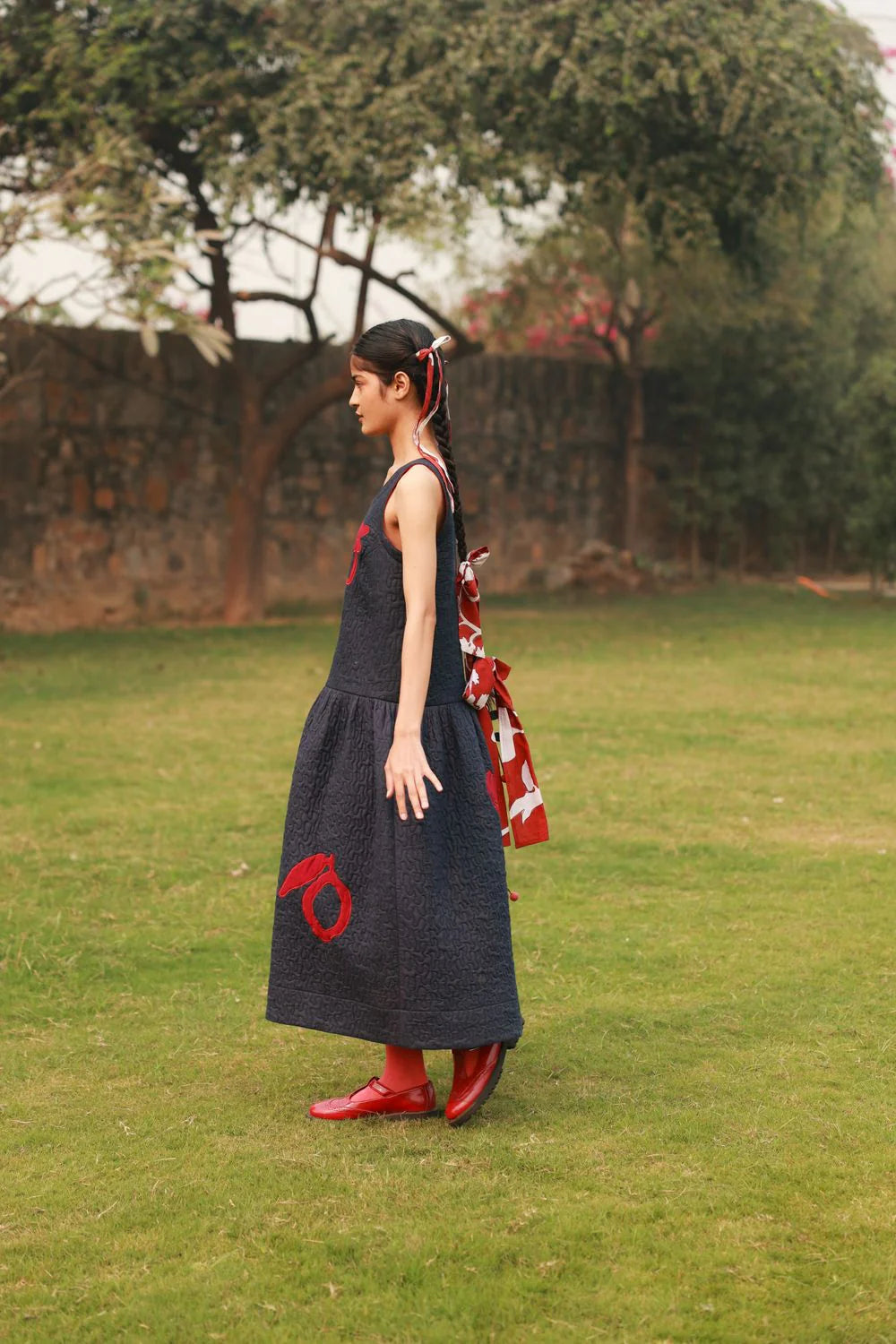 A sleeveless navy dress featuring a textured quilted pattern and playful hand-appliquéd red abstract motifs. Designed with a relaxed fit and a gathered drop-waist silhouette, this piece is perfect for casual outings or artistic flair.