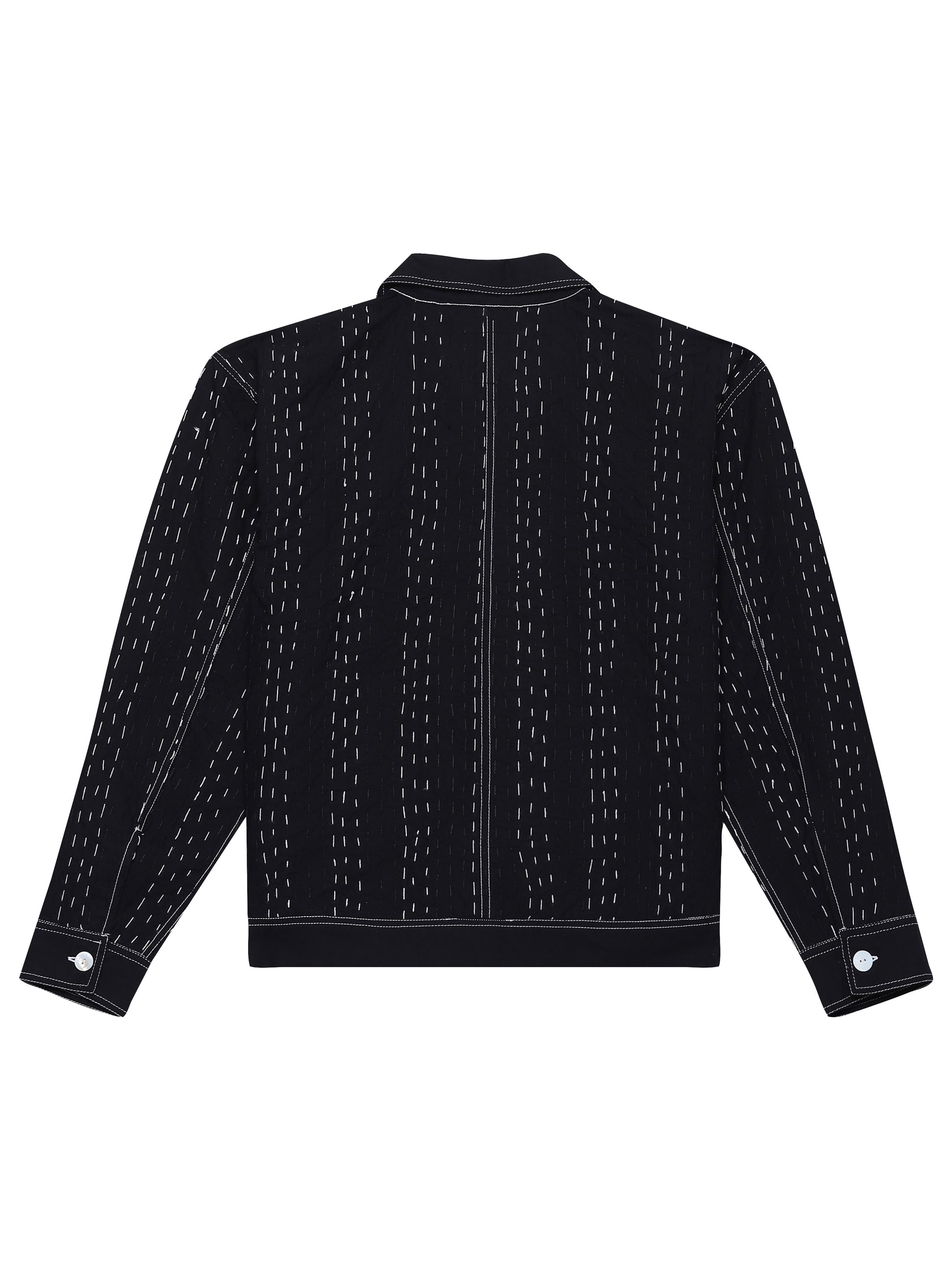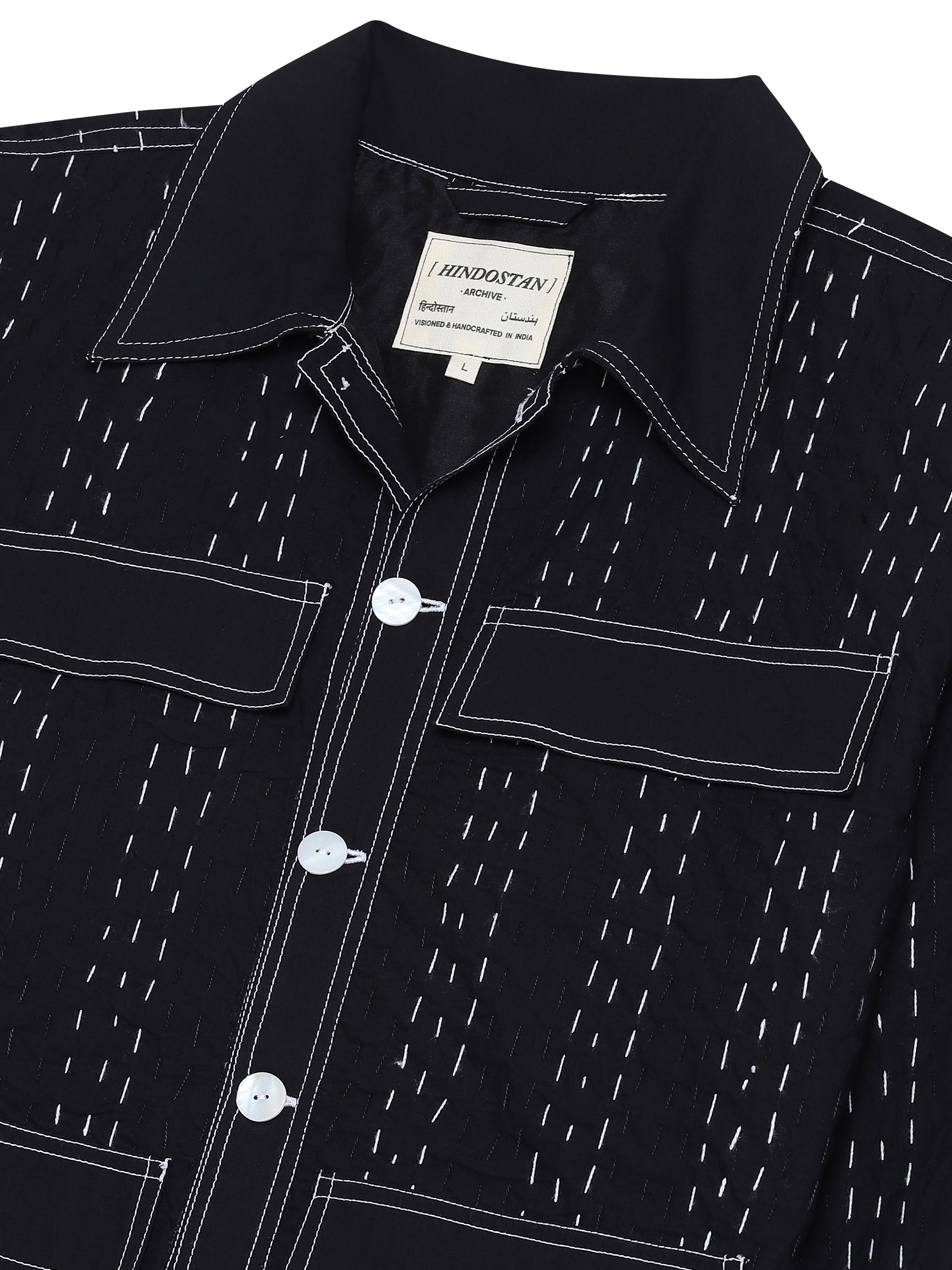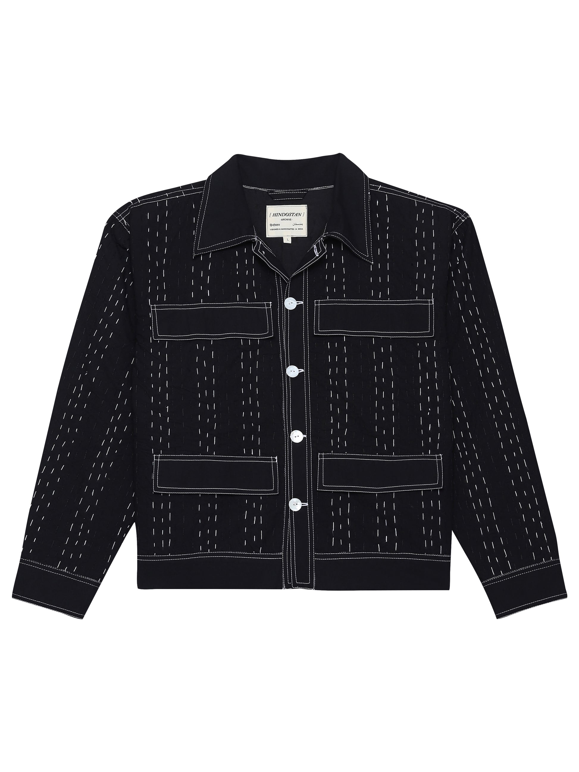 A four-flap jacket with plain-woven cotton fabric and hand-done Kantha embroidery throughout the surface.