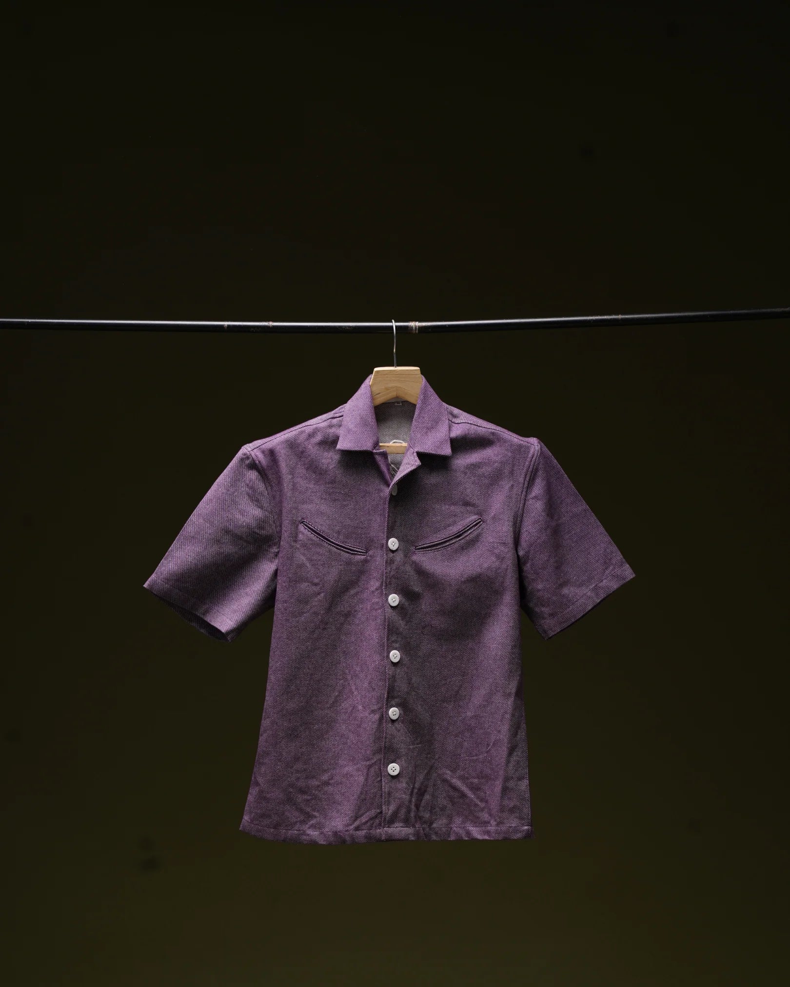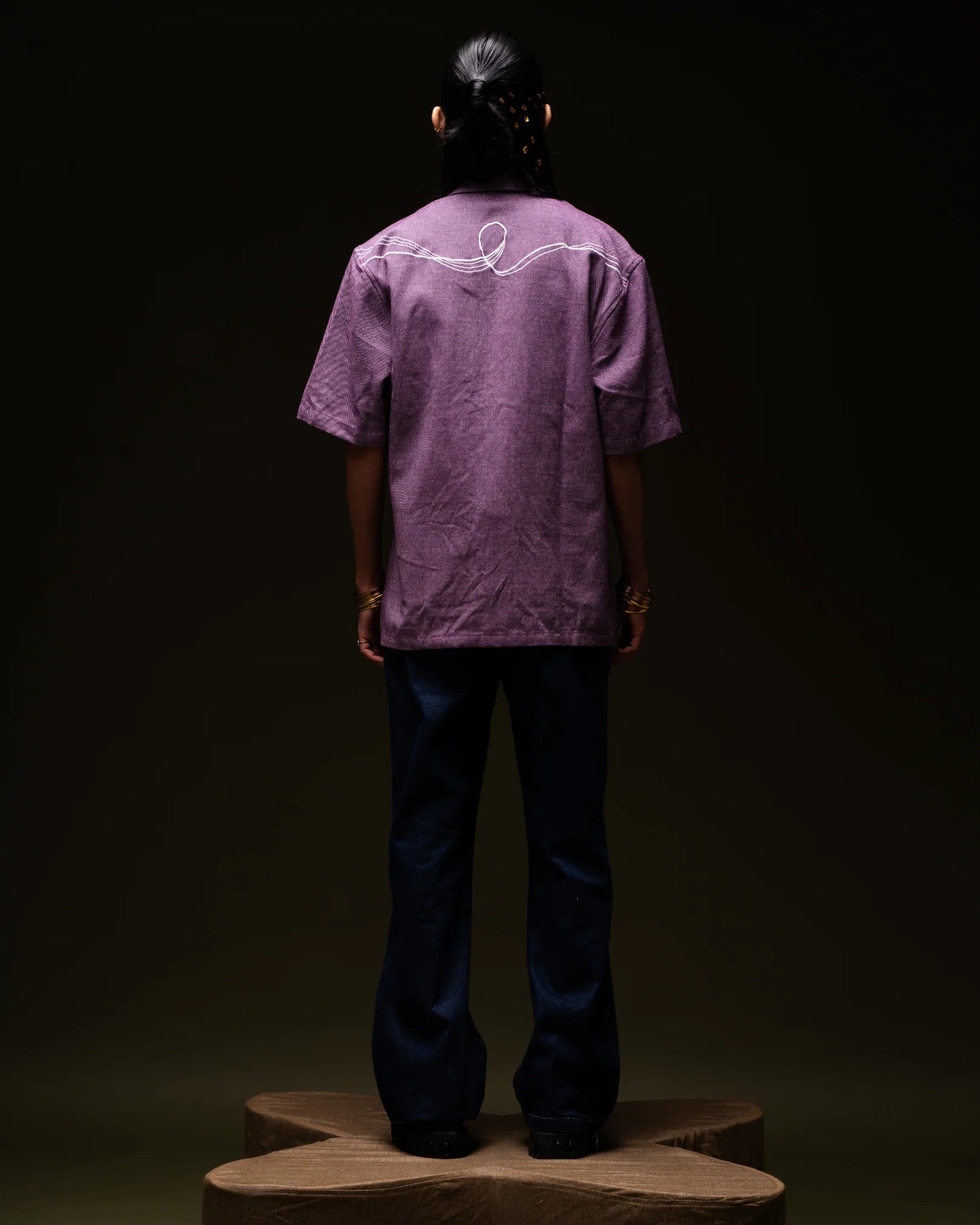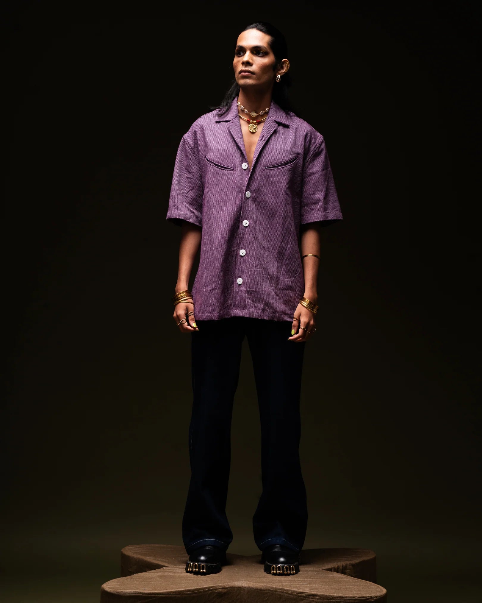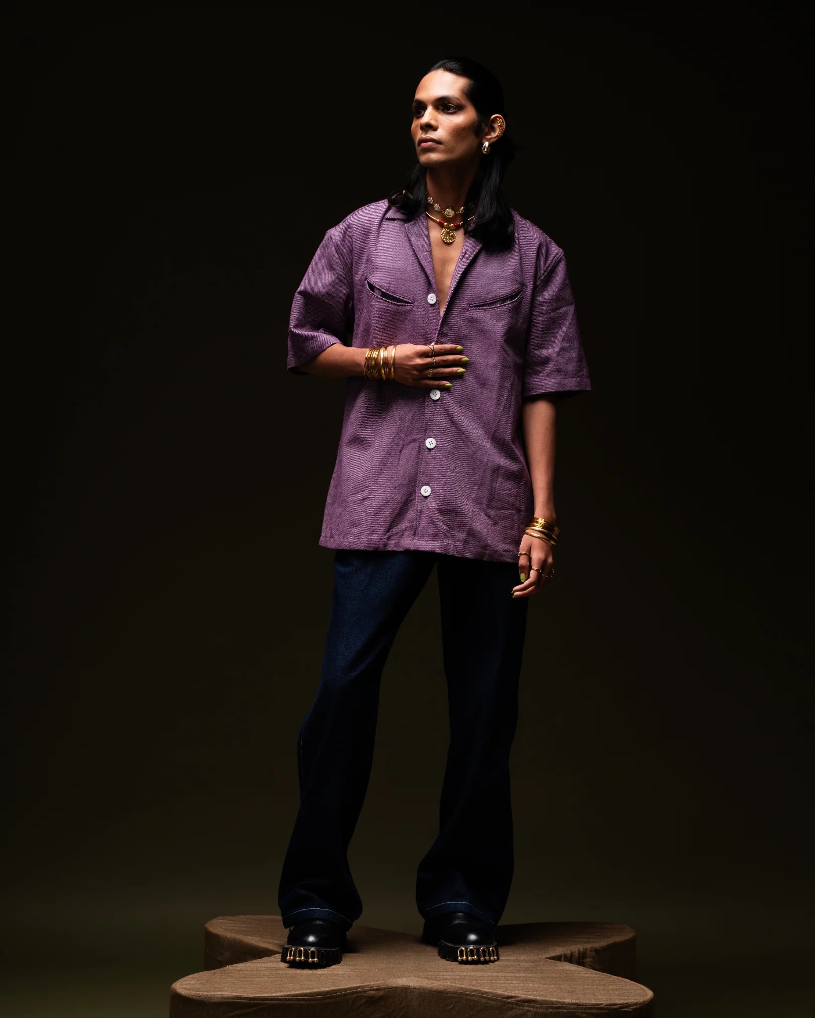 Born Kaalam is a quintessential purple shacket, blending traditional Tamil Nadu style with modern flair. Crafted entirely from Jamakkalam fabric, it features an oversized fit, short kimono sleeves, and a lapel neckline. The front showcases all-button detailing and gracefully designed cowboy pockets. A contemporary take on our first shacket, it's a perfect mix of tradition and innovation.