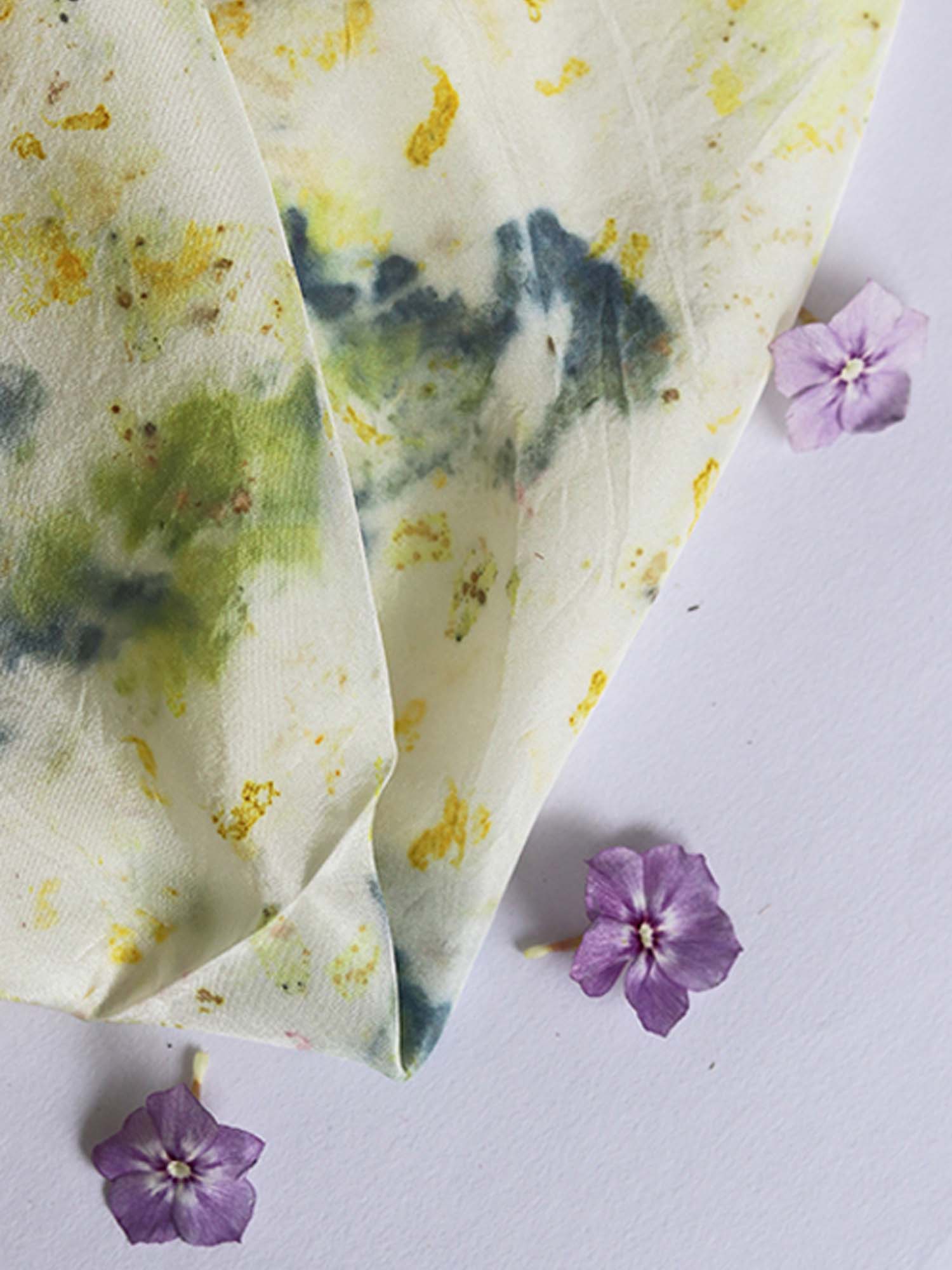 Elevate your textile experience with our exclusive fabric collection. Each piece is meticulously eco-printed with temple flowers, capturing the essence of nature and the sophistication of HABUTAI SILK. Mulya fabric, 44 inches wide, boasts unparalleled beauty and comfort, crafted entirely from luxurious silk. Handmade by skilled artisans from the Himalayan region, each piece is a unique masterpiece