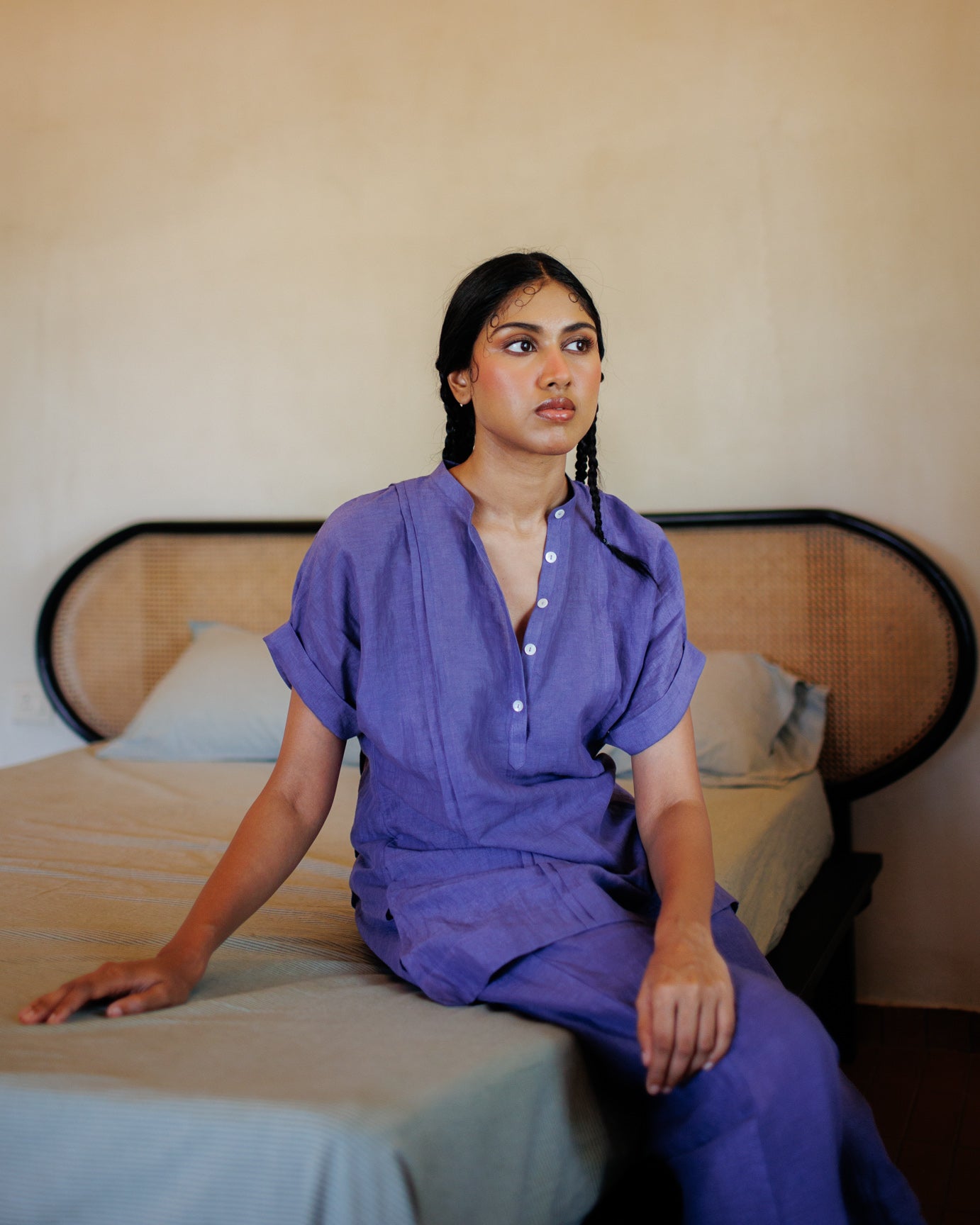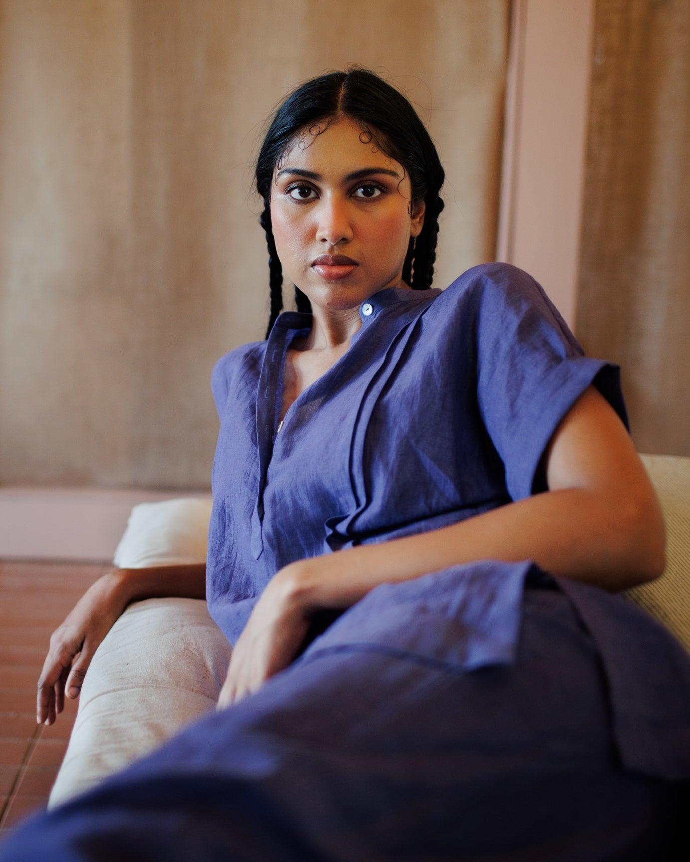 A relaxed-fit tunic crafted in handwoven linen-cotton, featuring a soft kimono sleeve and a subtle mandarin collar. Fine hand-pleated tucks run along the front and back, with slits on either sides, adding texture and detail to this effortless silhouette.