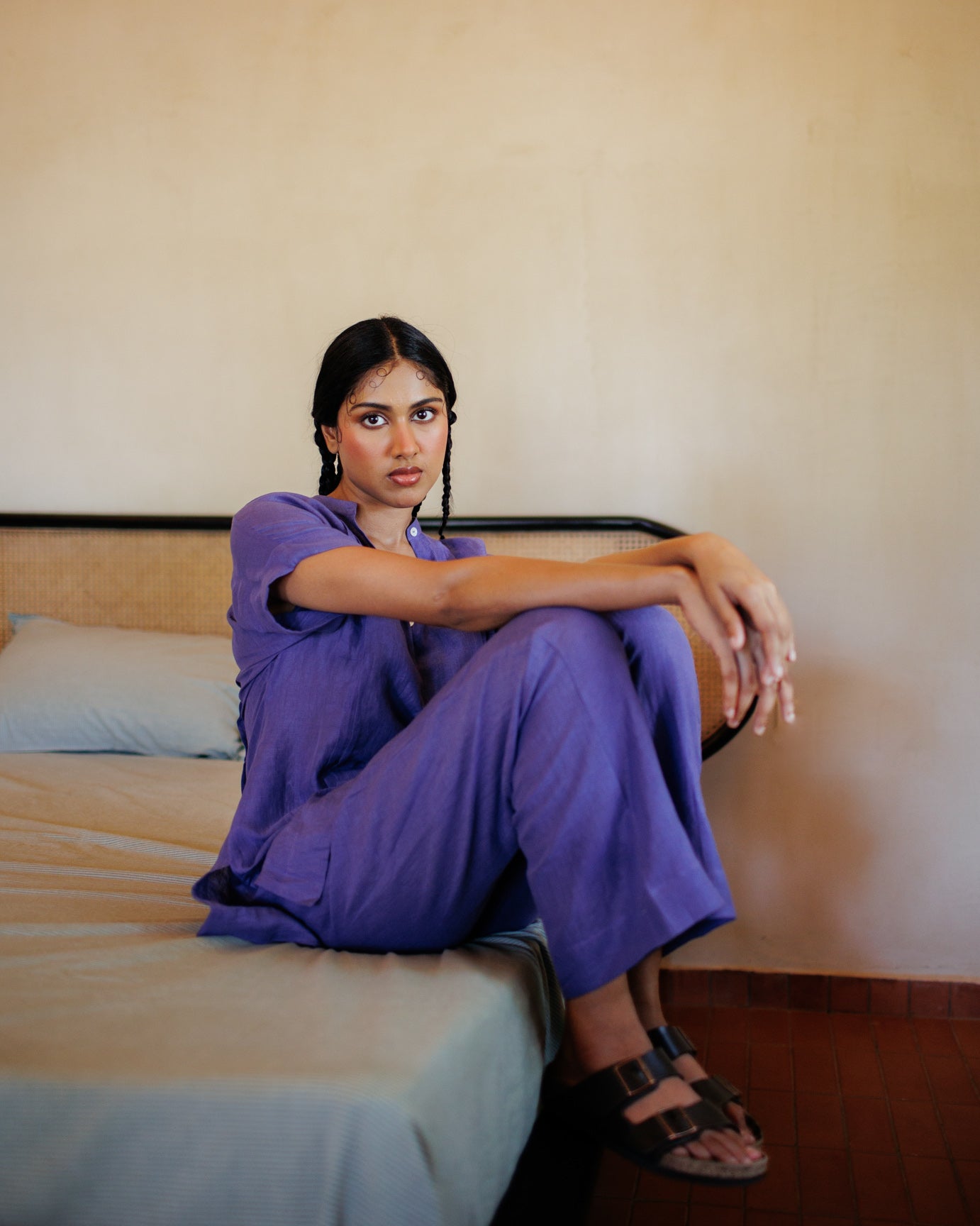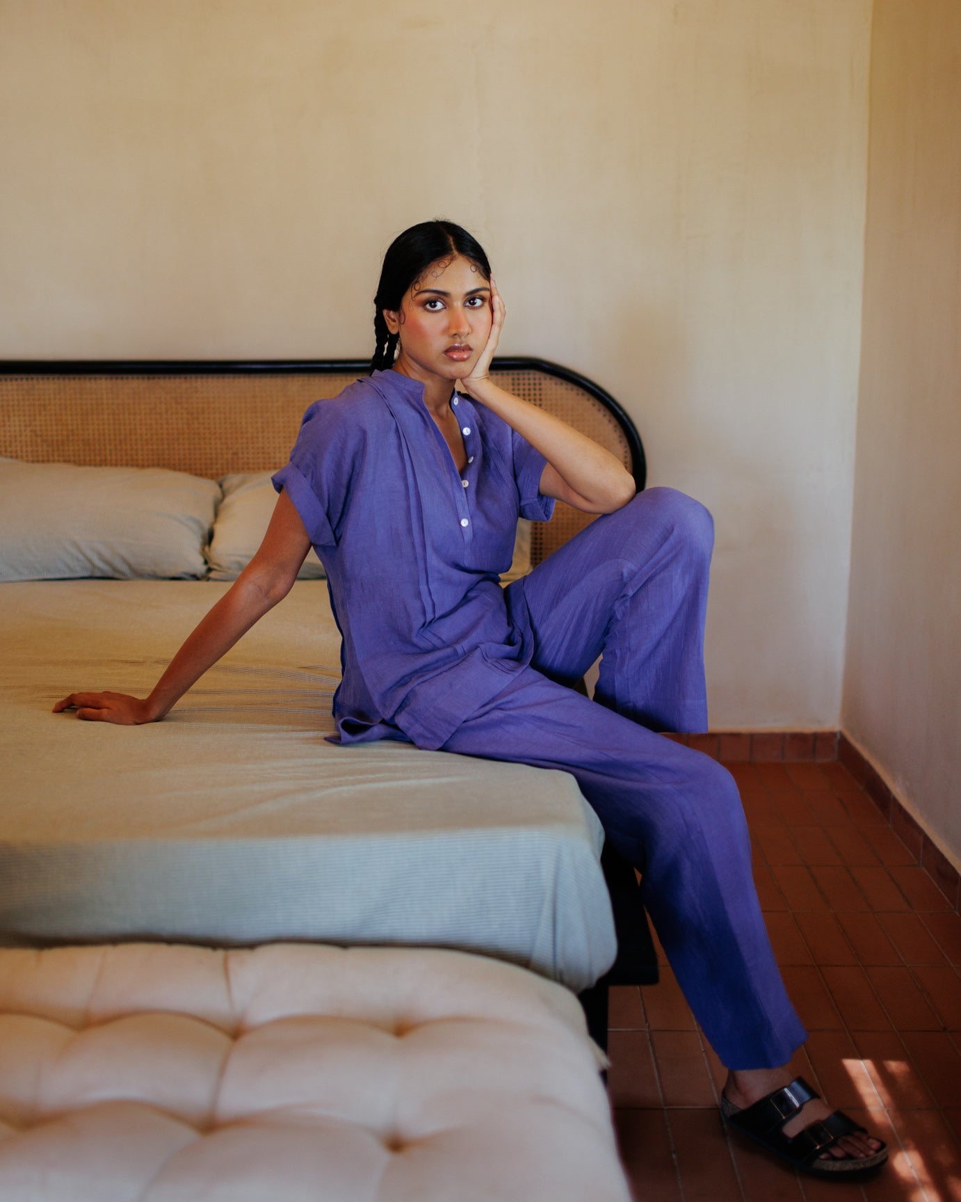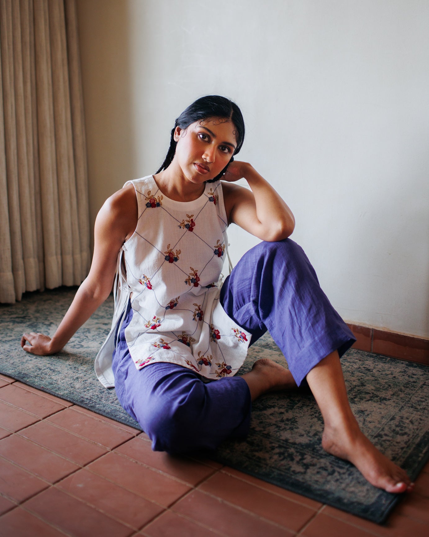 Charlie trousers are High-waisted trousers with a relaxed fit, crafted from handspun and handwoven linen-cotton. Designed for everyday comfort, they feature an elasticated waistband with a drawstring tie-up for an adjustable fit.