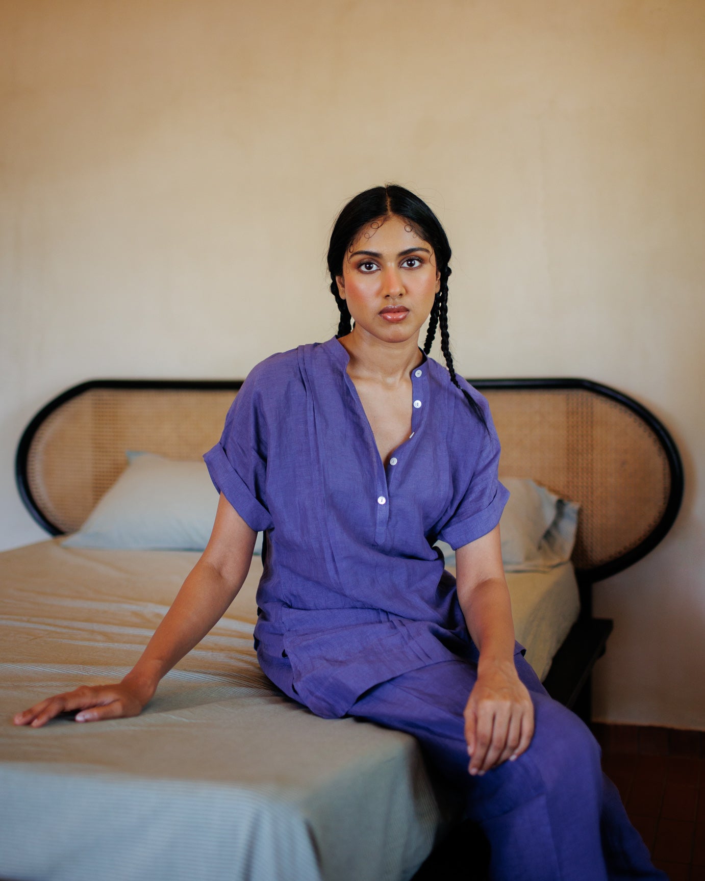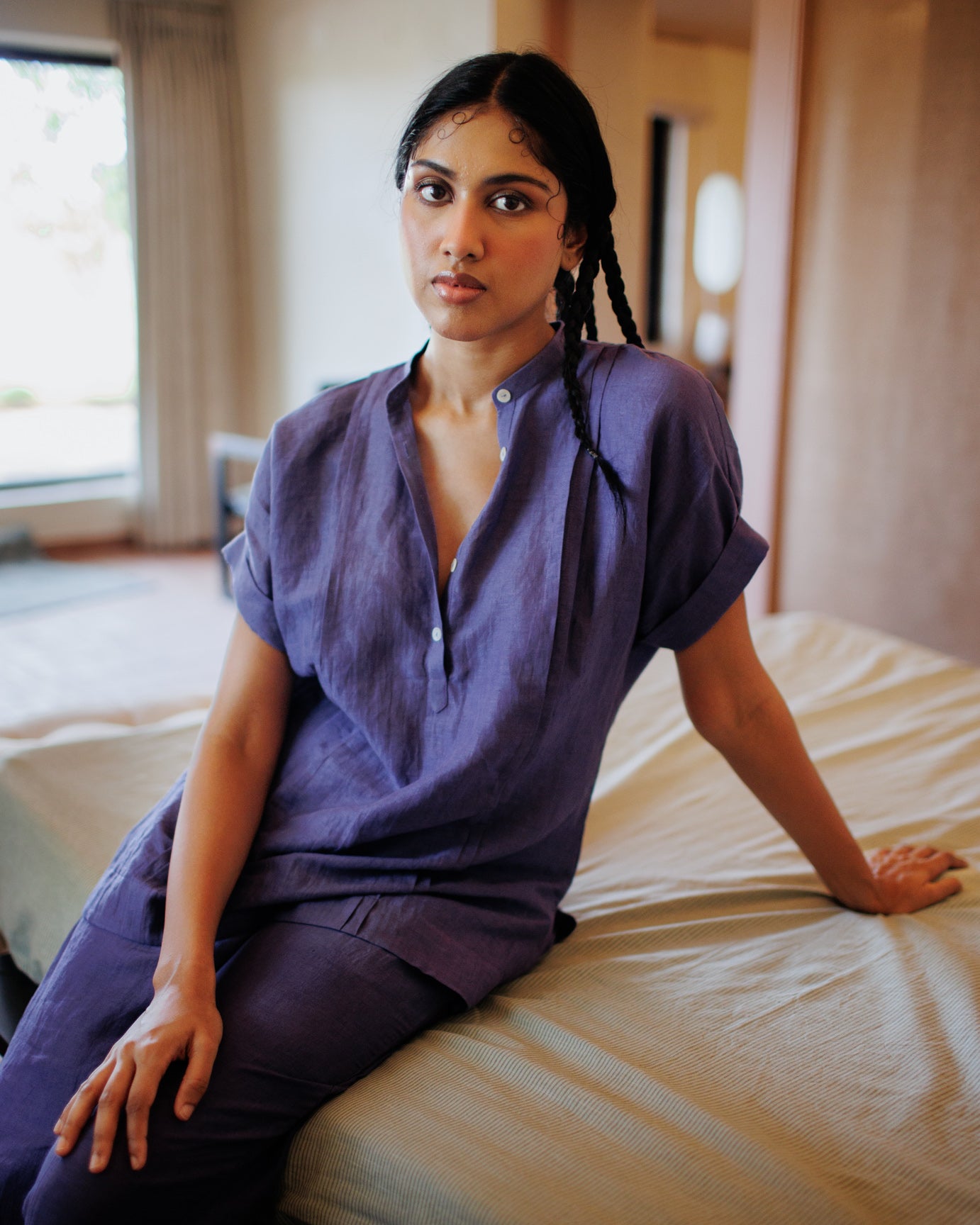 A relaxed-fit tunic crafted in handwoven linen-cotton, featuring a soft kimono sleeve and a subtle mandarin collar. Fine hand-pleated tucks run along the front and back, with slits on either sides, adding texture and detail to this effortless silhouette.
