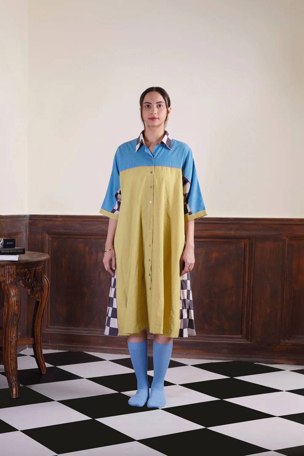 A relaxed collared shirt dress in our classic silhouette. It features panels dyed with indigo and pomegranate and hand-painted sections in kassim. It has button down front with hand-made brass buttons.