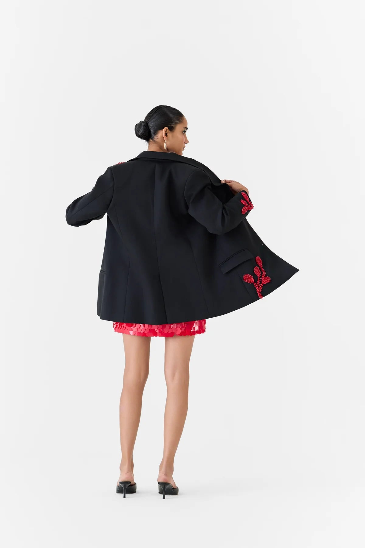 The Cherry Blazer crafted from our stunning cotton suiting fabrication, trans-seasonal, is a statement piece. The piece, lined suiting , has a straight. The blazer has been embroidered with cherry blossom like flowers. It has a lapel and collar. It can be worn with our ruby sequin bustier and skirt. Wear it with heels for an elegant look.