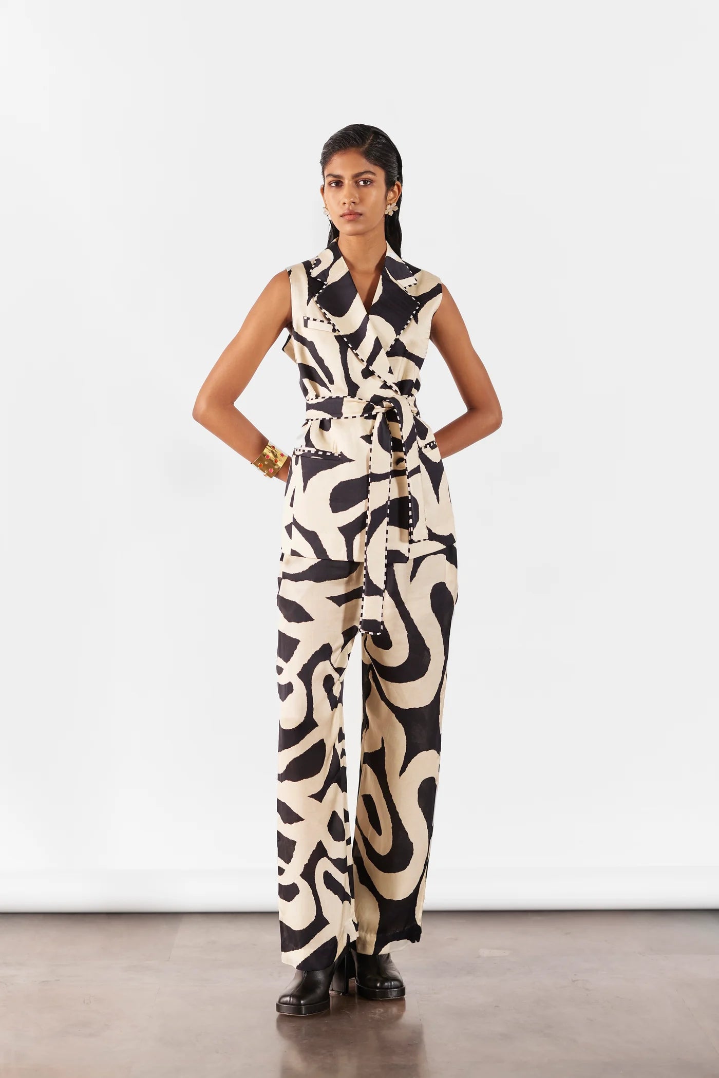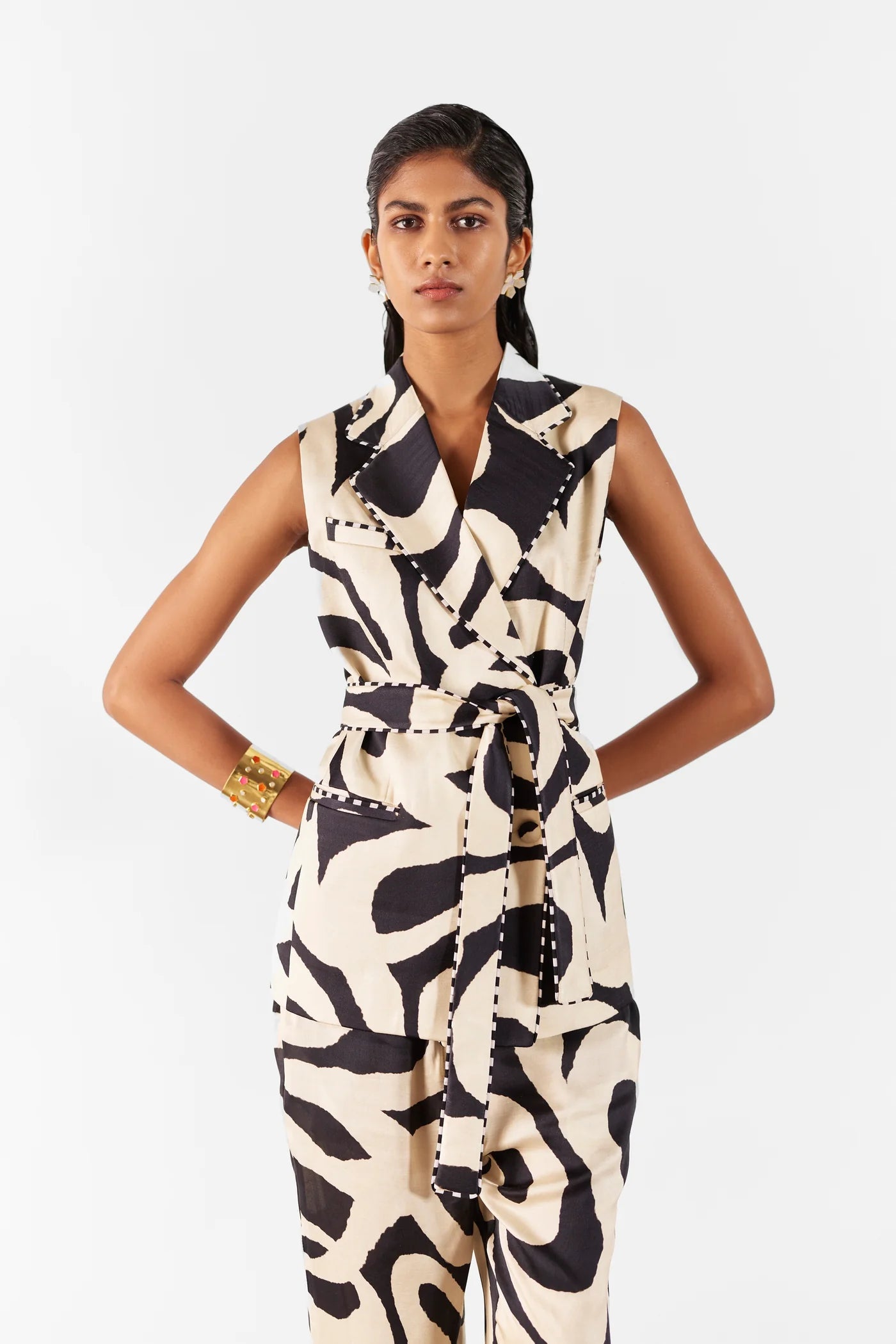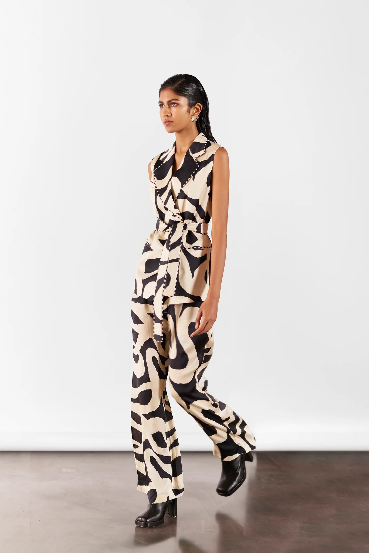 The Chestnut Blazer & Trousers crafted from our stunning Vegan Silk fabrication, trans-seasonal, is a statement piece. Made in our hand drawn Chestnut print inspired by the storm of cold winter, it has a straight fit. With a front button opening and lapel, it is chic. Featuring contrast piping details, this piece is sleeveless and can be styled in different ways. It also has a matching belt. Paired with our matching Chestnut Straight trousers. Wear it with heels for an elegant look.