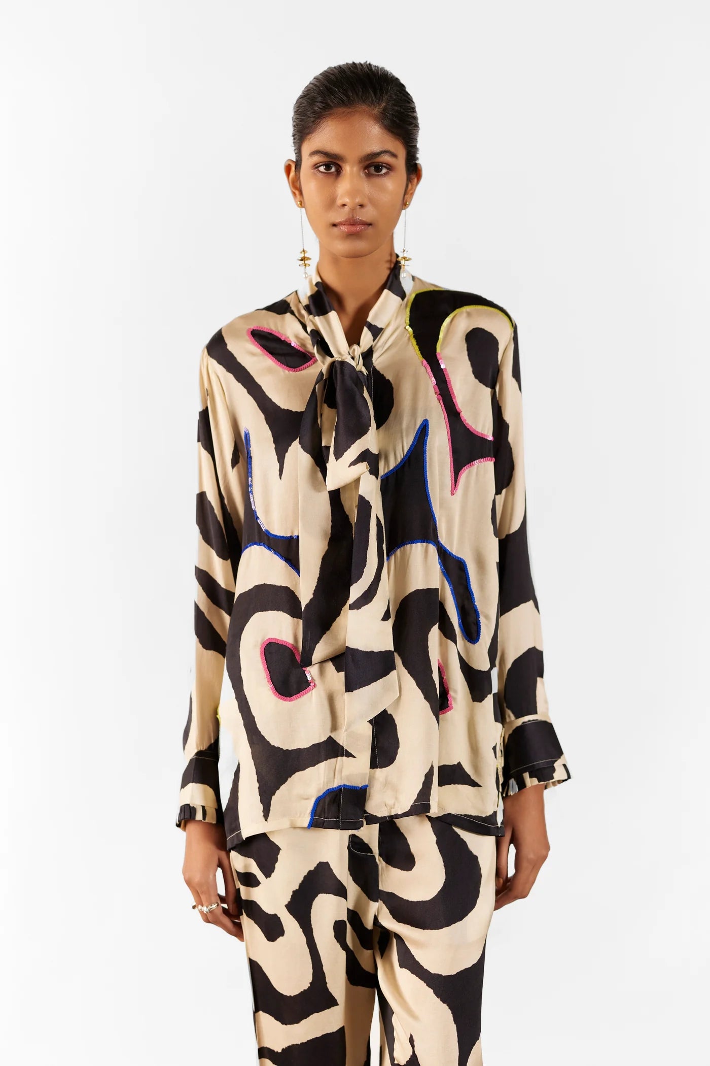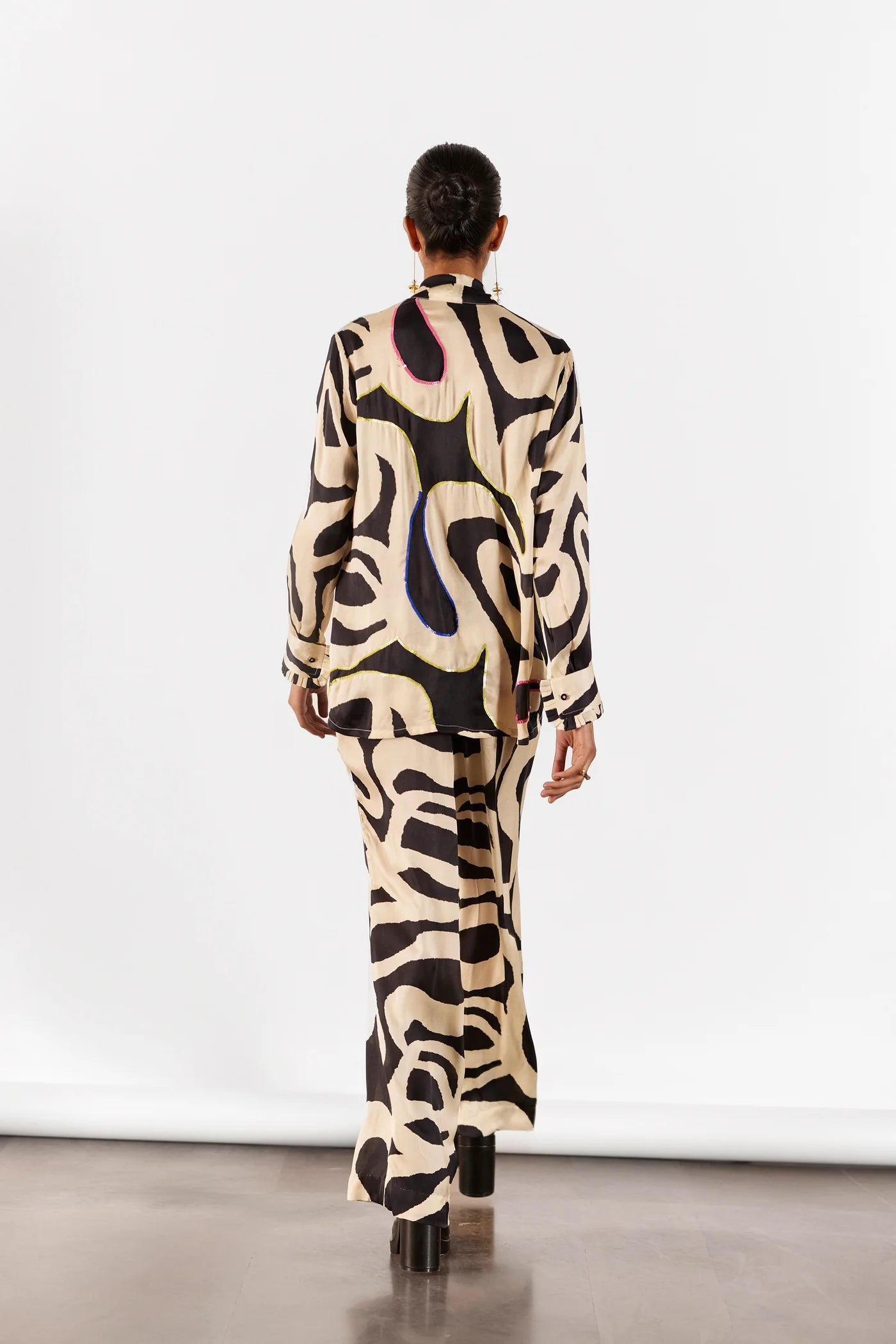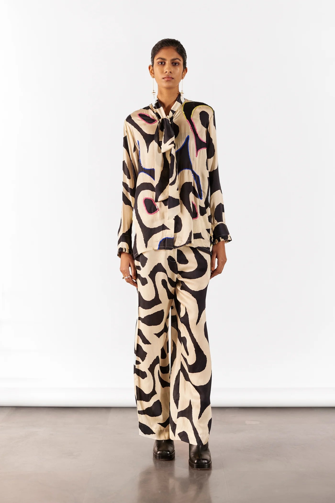 The Chestnut Knot Shirt & Trousers crafted from our stunning Vegan Silk fabrication, trans-seasonal, is a statement piece. Made in our hand drawn Chestnut print inspired by the storm of cold winter, it has a straight fit. With a front button opening and front knot on the neck, it is chic. Featuring hand embroidered sequin details, this piece has small pleat details on the cuff and can be styled in different ways. Paired with our matching Hazel Straight trousers. Wear it with heels for an elegant look.