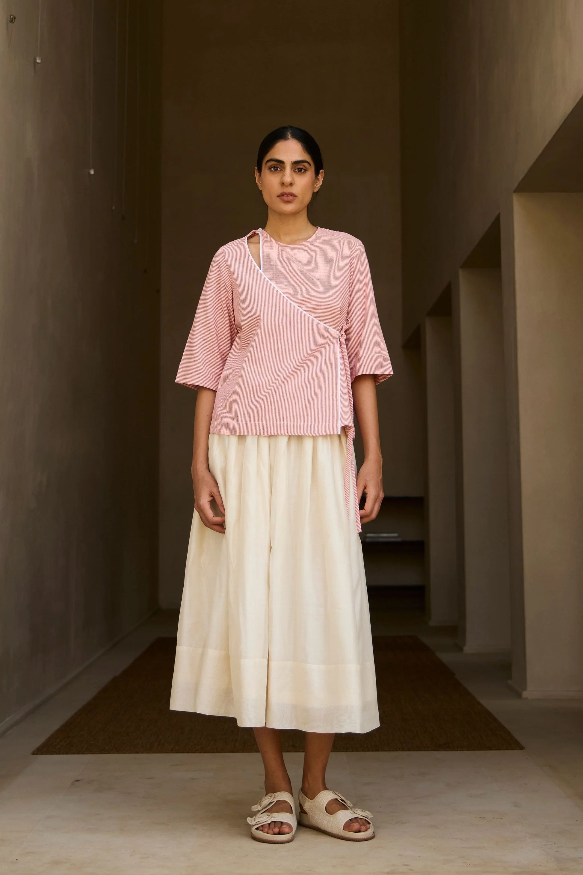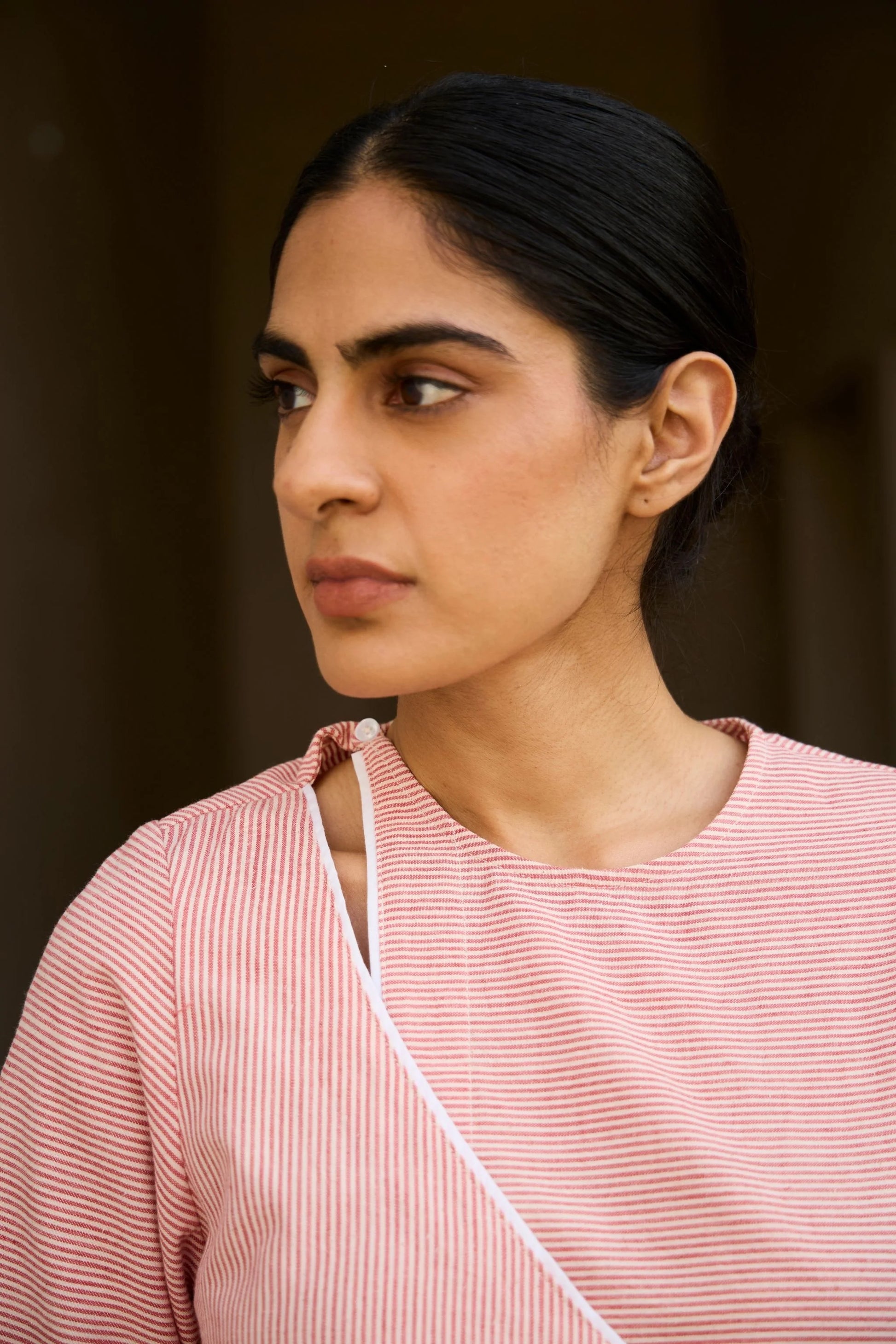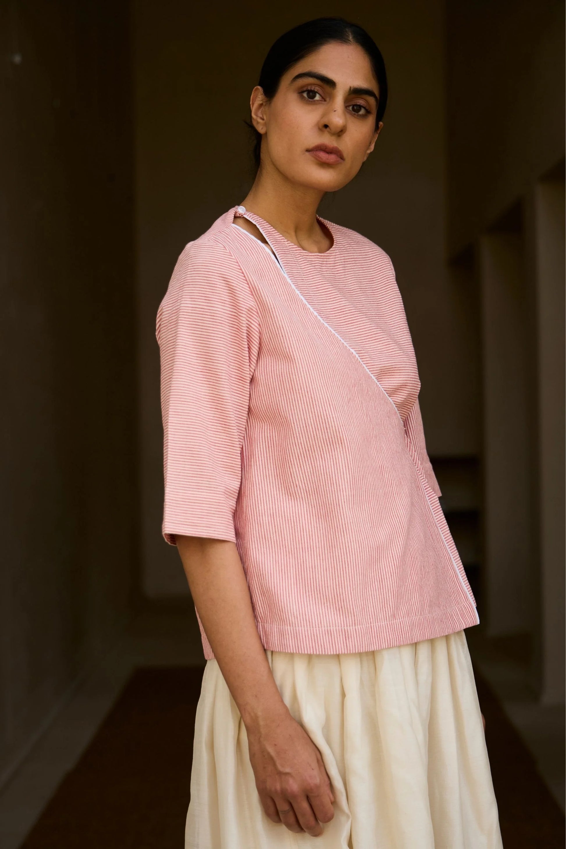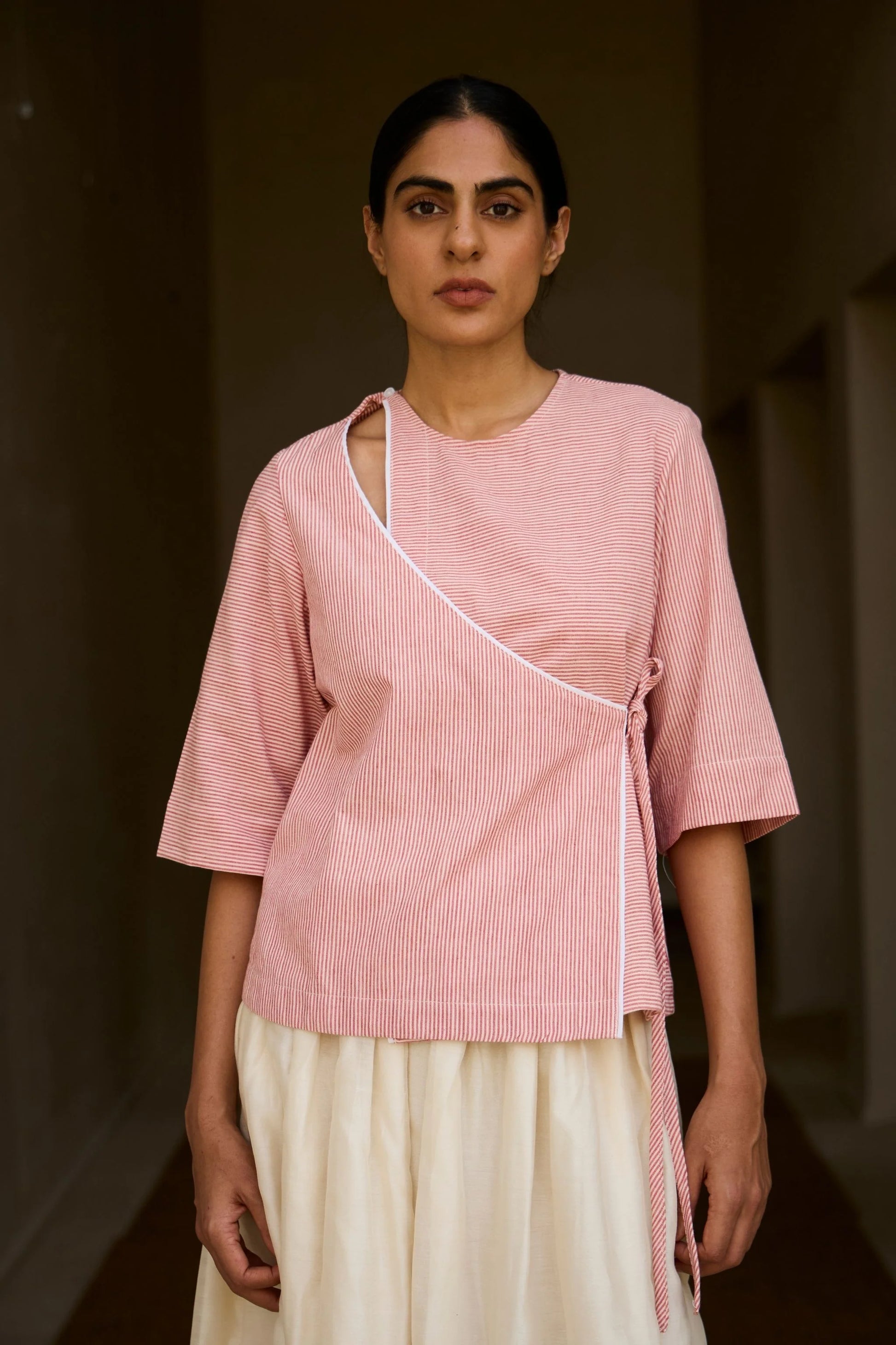Overlap tie top crafted in handwoven cotton. Single loop button fastening on shoulder. Piping detail on the neckline. Side tie for desired fit. Elbow length sleeves.