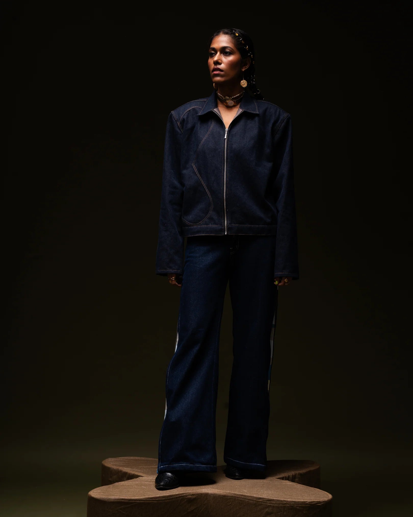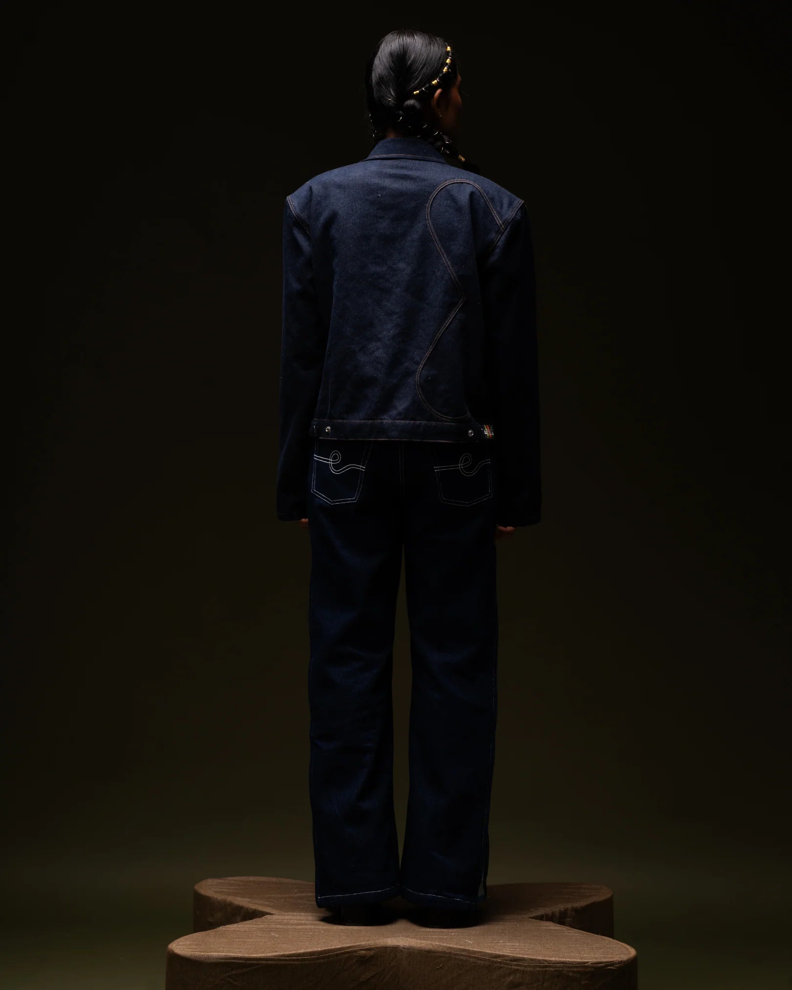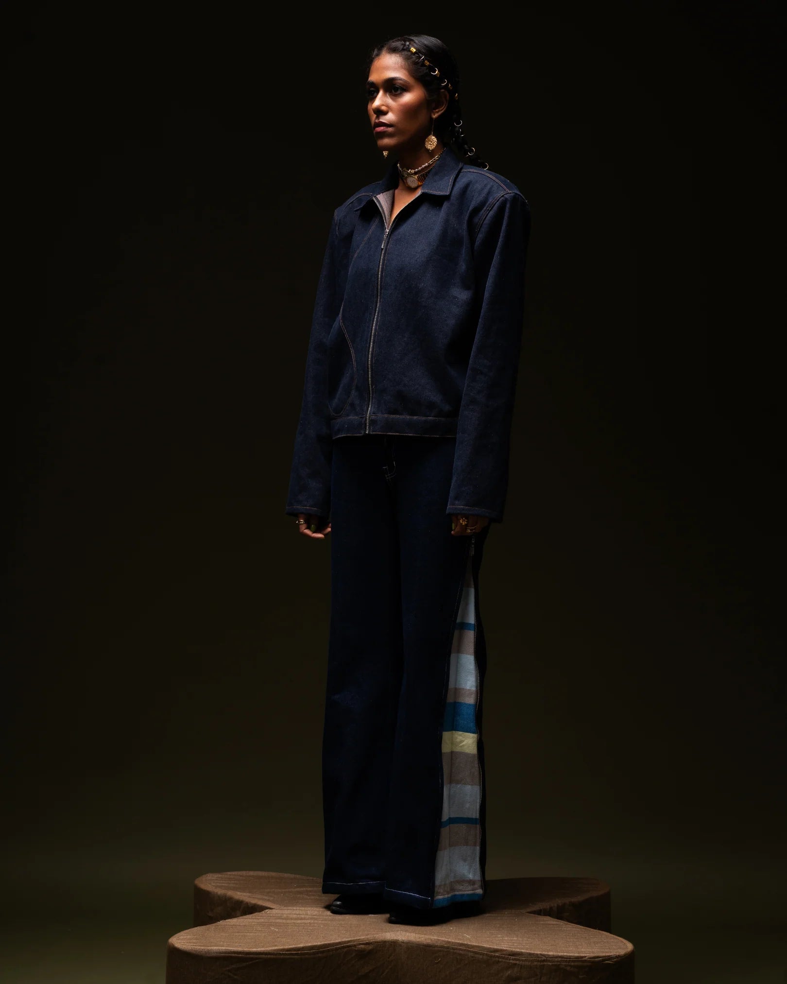 Closing Time is a blue denim jacket with bold shoulder pads, offering a regular fit in non-stretch fabric. Featuring a half-patched motif in Jamakkalam stripe fabric, split between the front and back, it adds a unique touch. Cropped in length with full sleeves and metal button closures, this jacket makes a stylish statement.