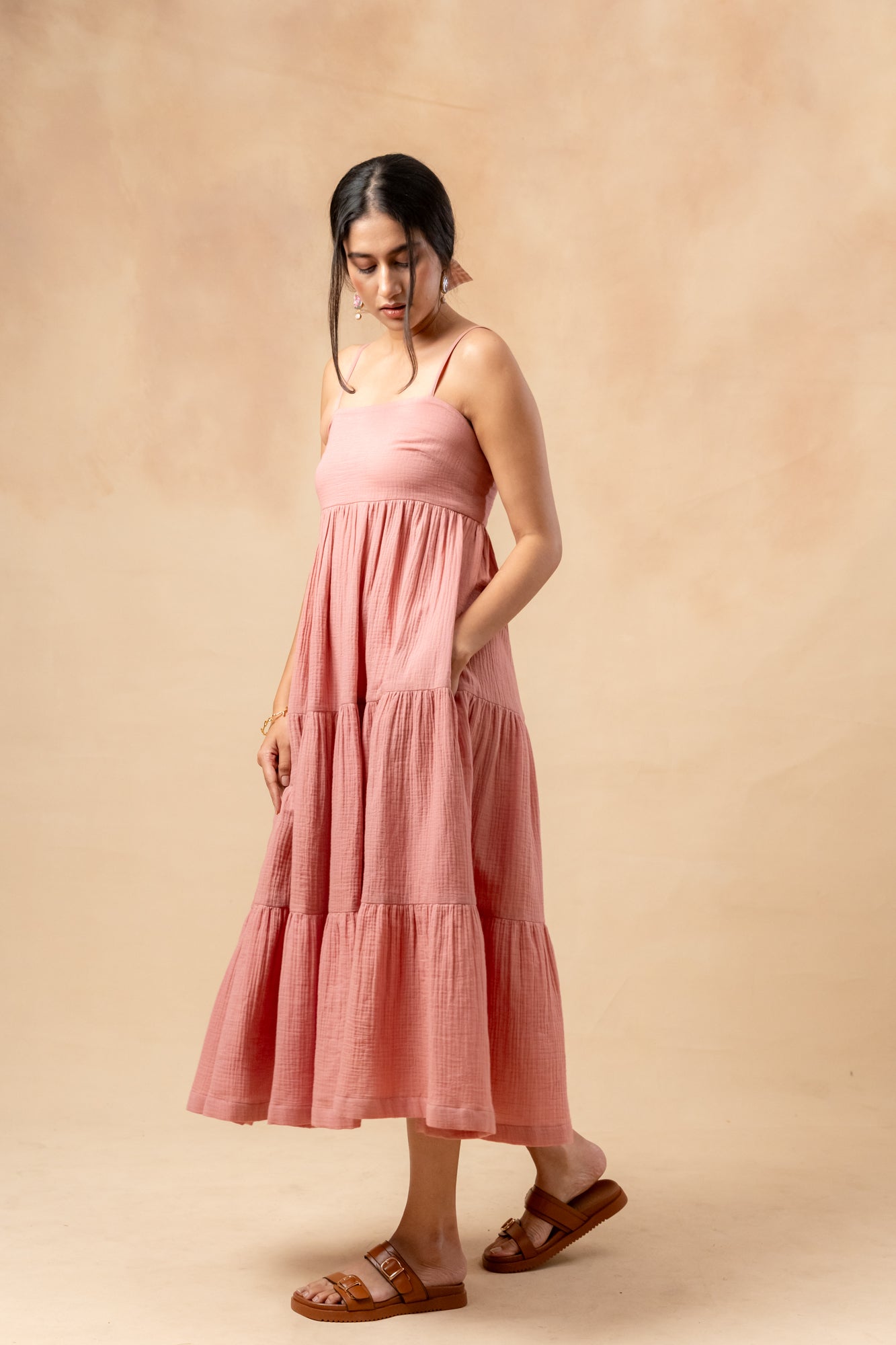 Description: Slip on tiered dress with smocking details at the back and adjustable straps, the dress comes with the side pockets