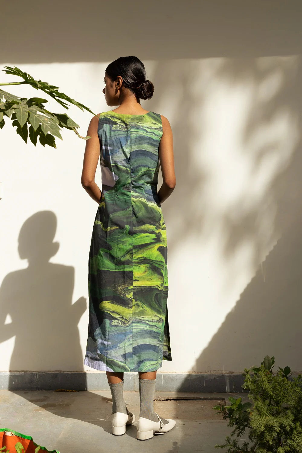 Printed dress with detailing in the front. The dress comes with a side pocket and a side slit.