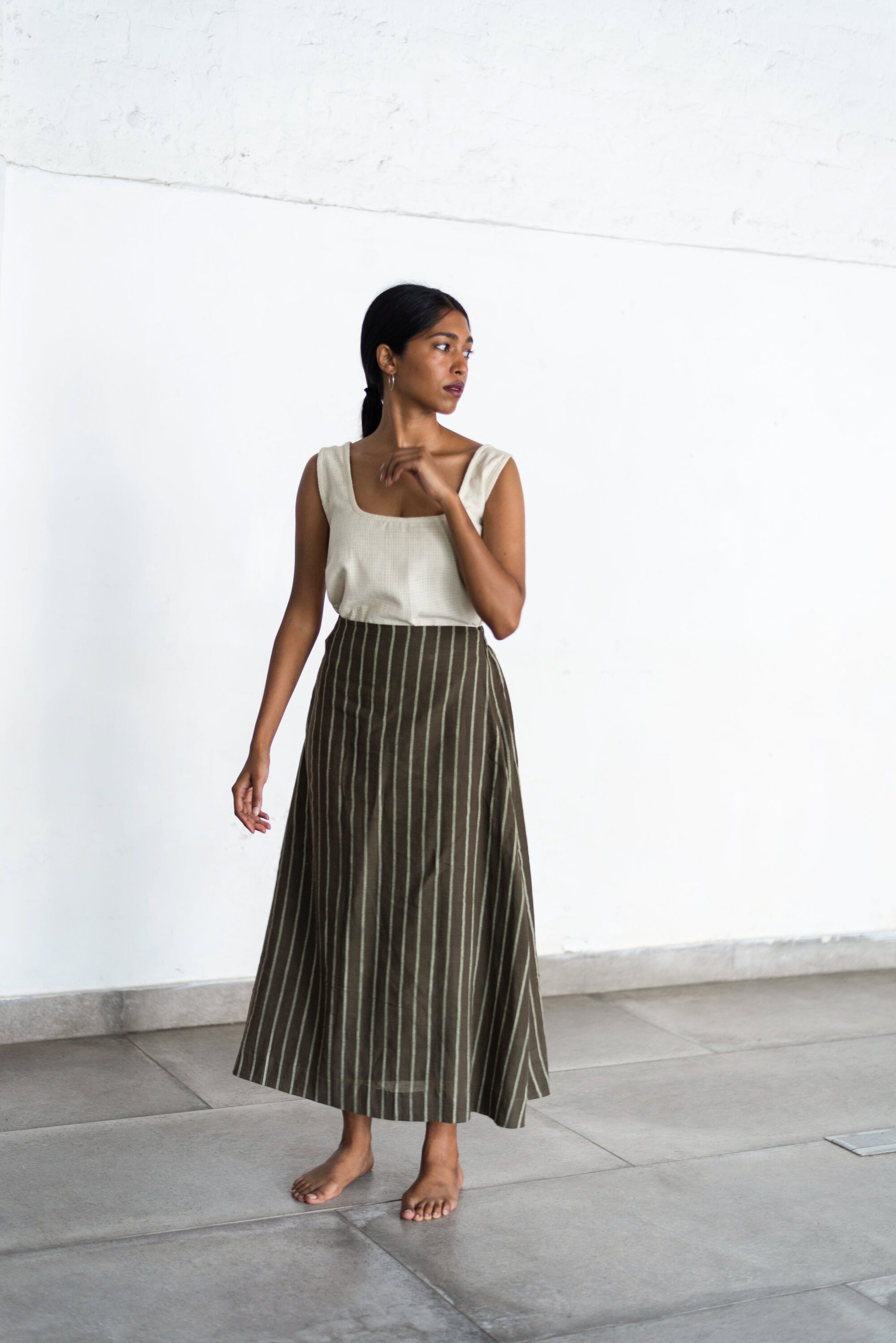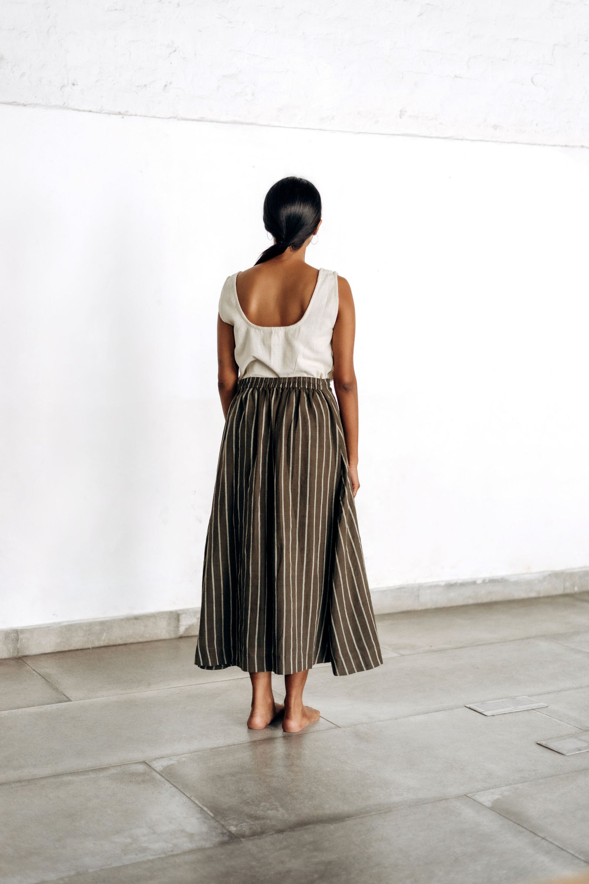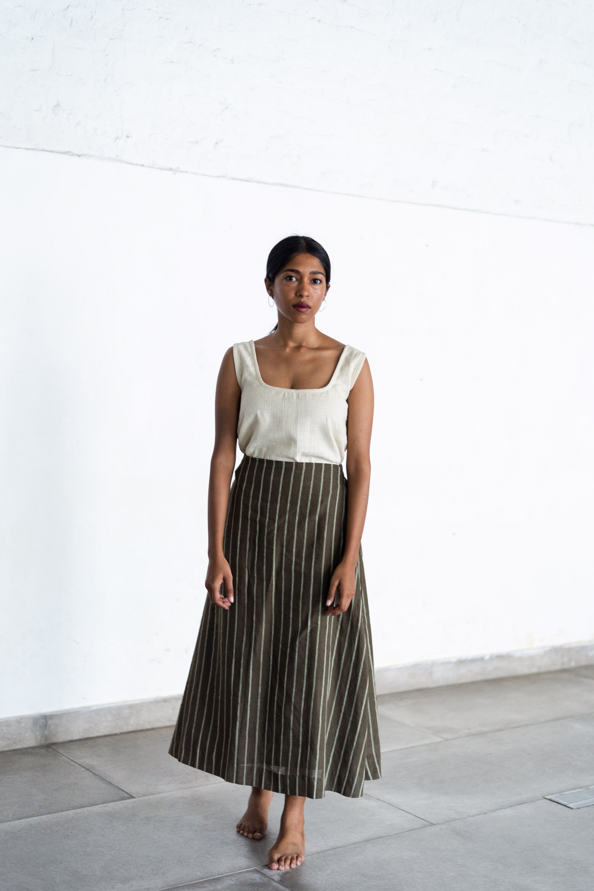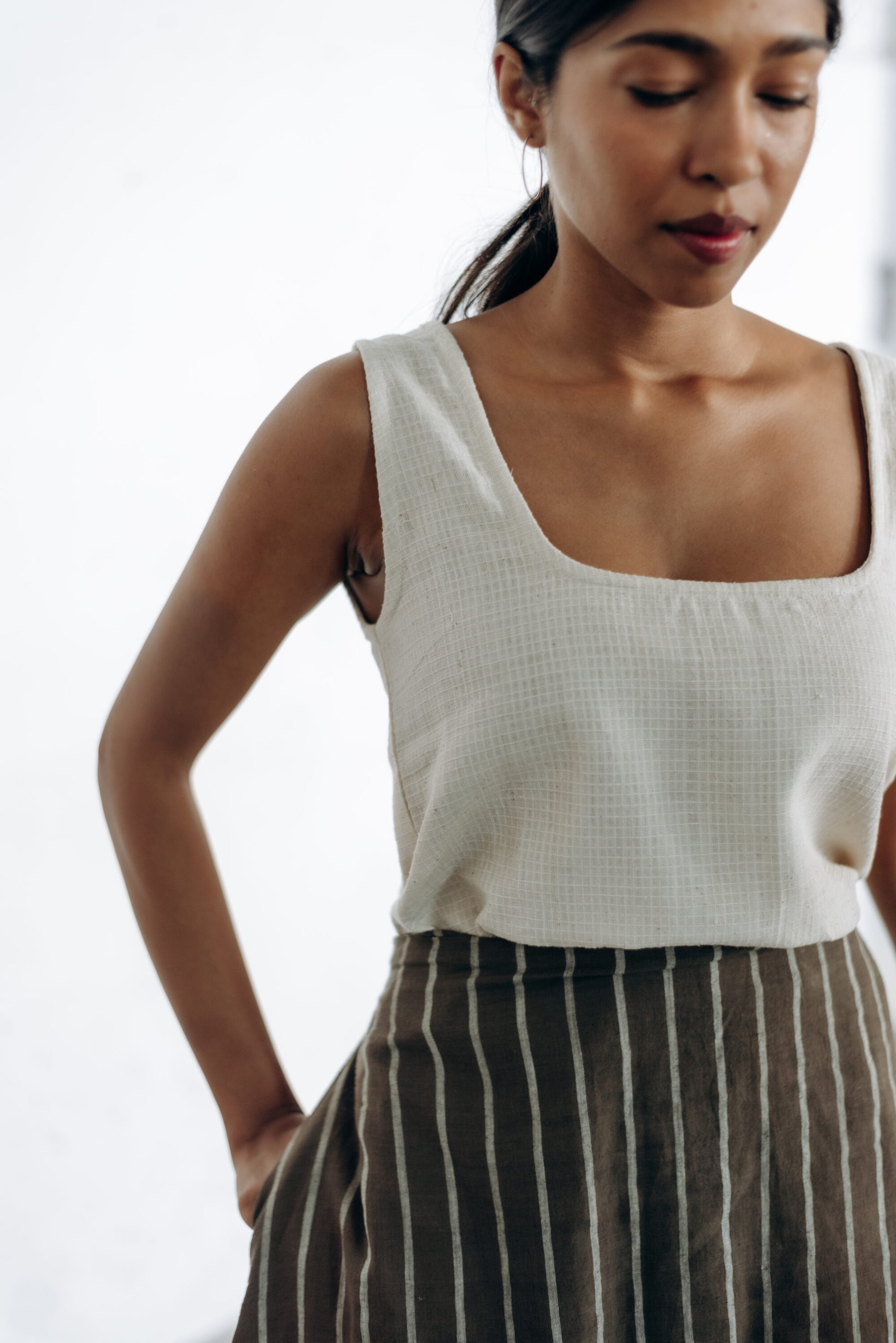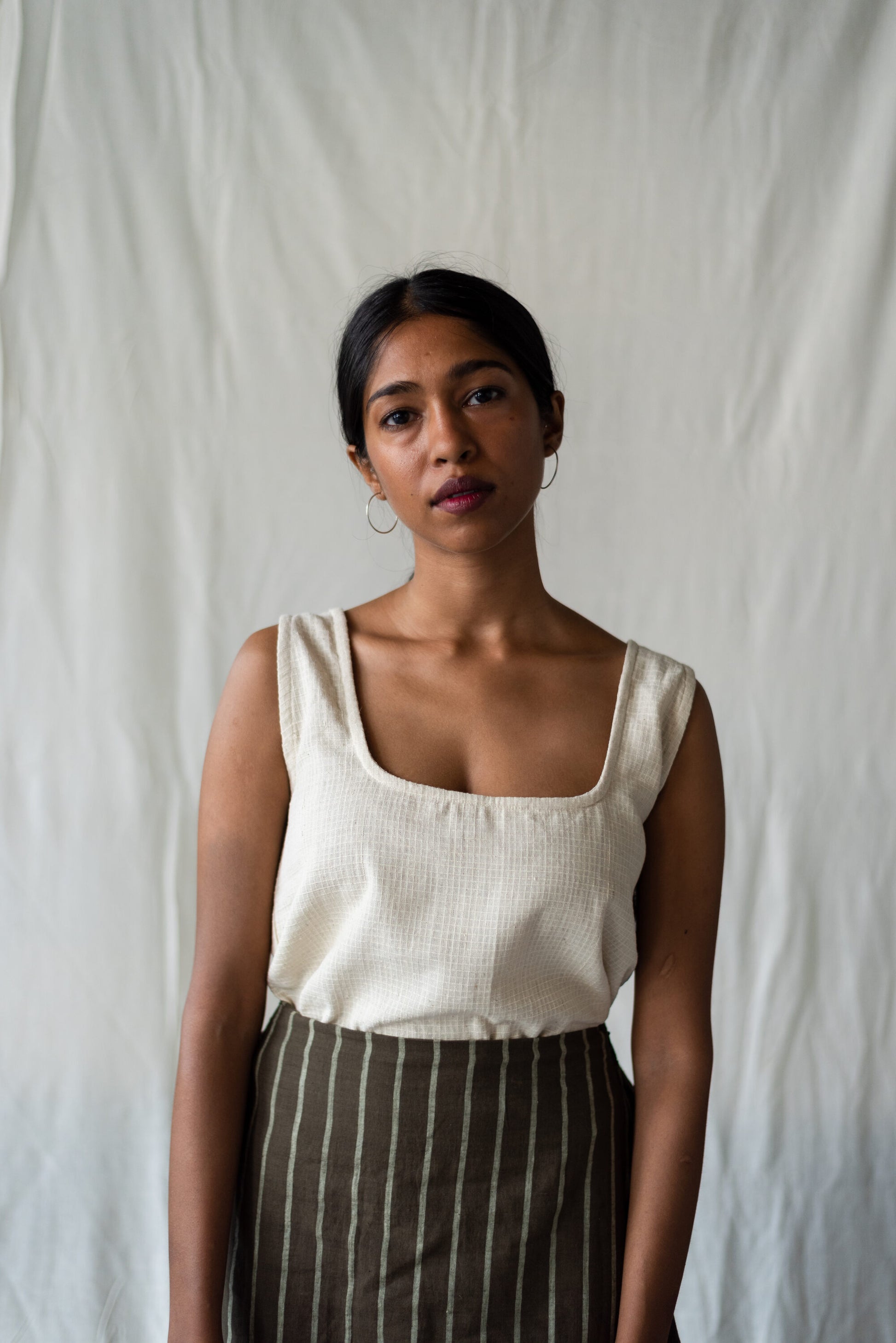 Cord check tank made using unbleached, undyed, indigenous cotton. A squarish neckline, and broad shoulder straps.