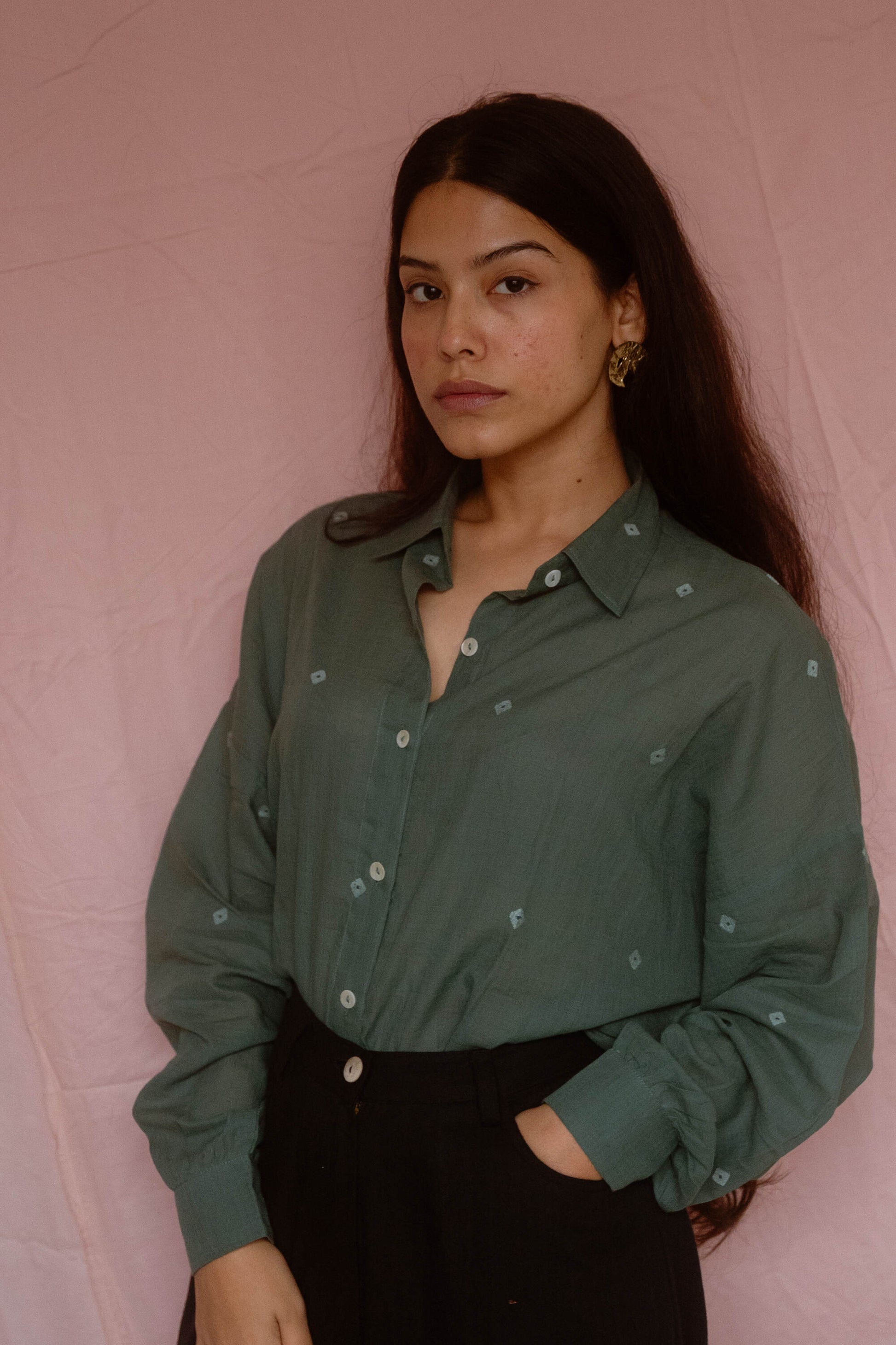 Our best selling Core Jamdani shirt is here in a limited edition new colour! Oversized shirt with drop shoulders and a regular collar. Comes in dual sizes. Dyed naturally.